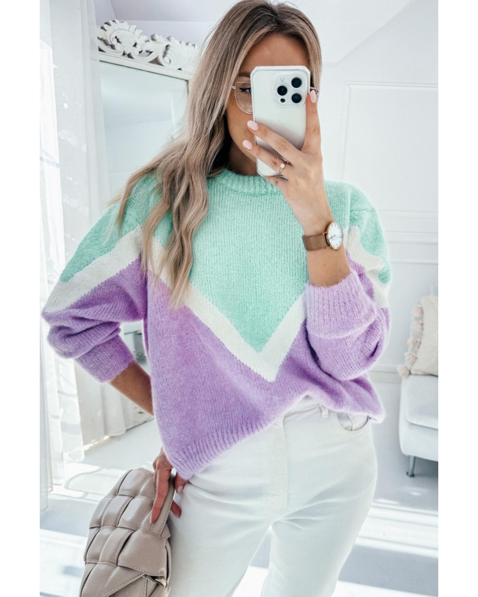 Green Chevron Colorblock Ribbed Knit Drop Shoulder Sweater - L