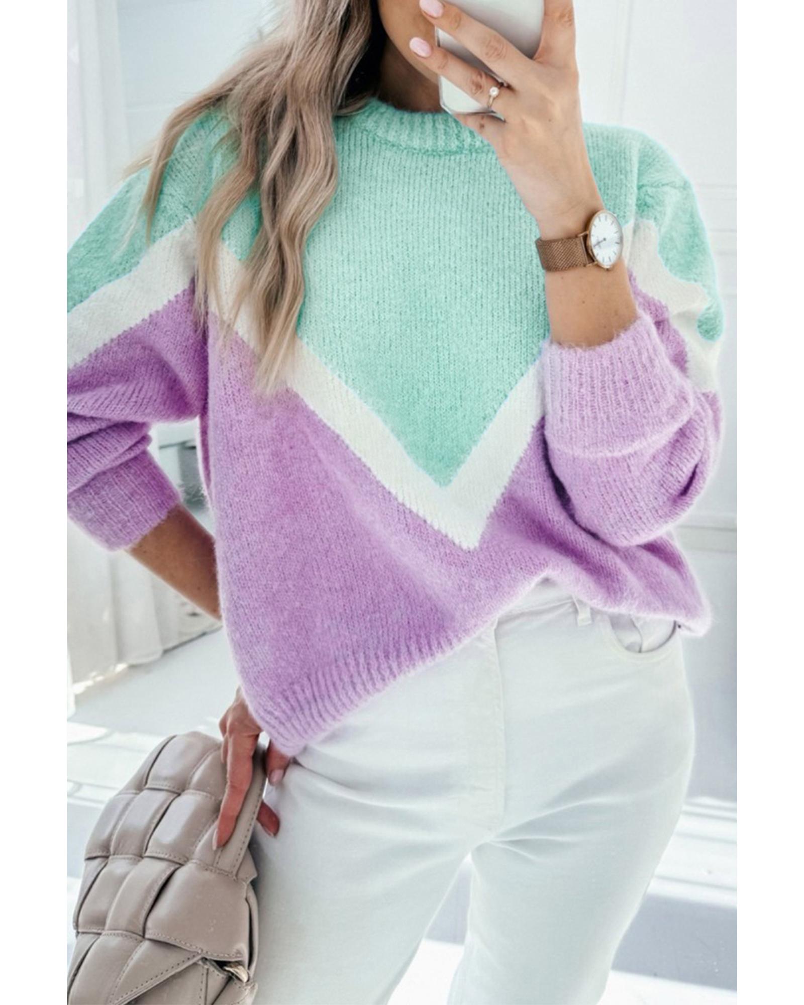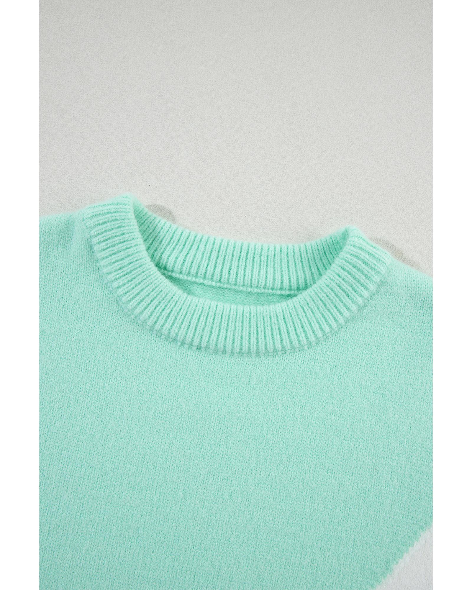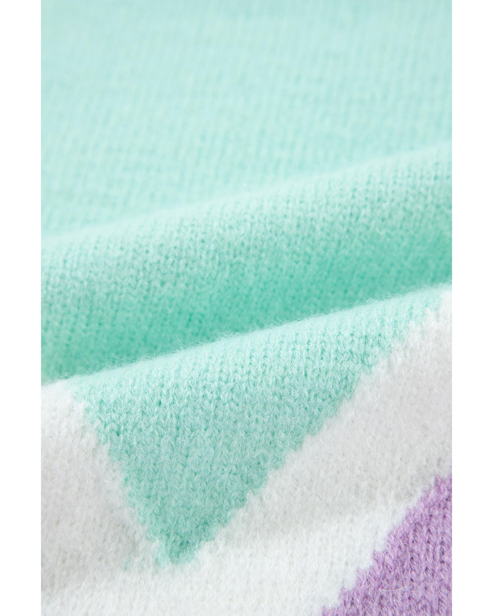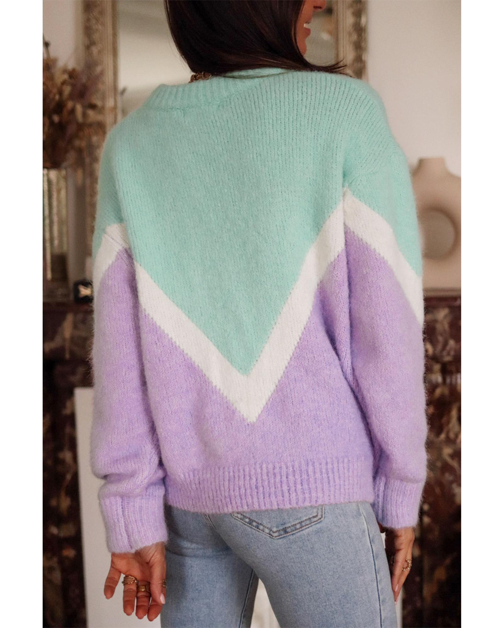 Green Chevron Colorblock Ribbed Knit Drop Shoulder Sweater - S