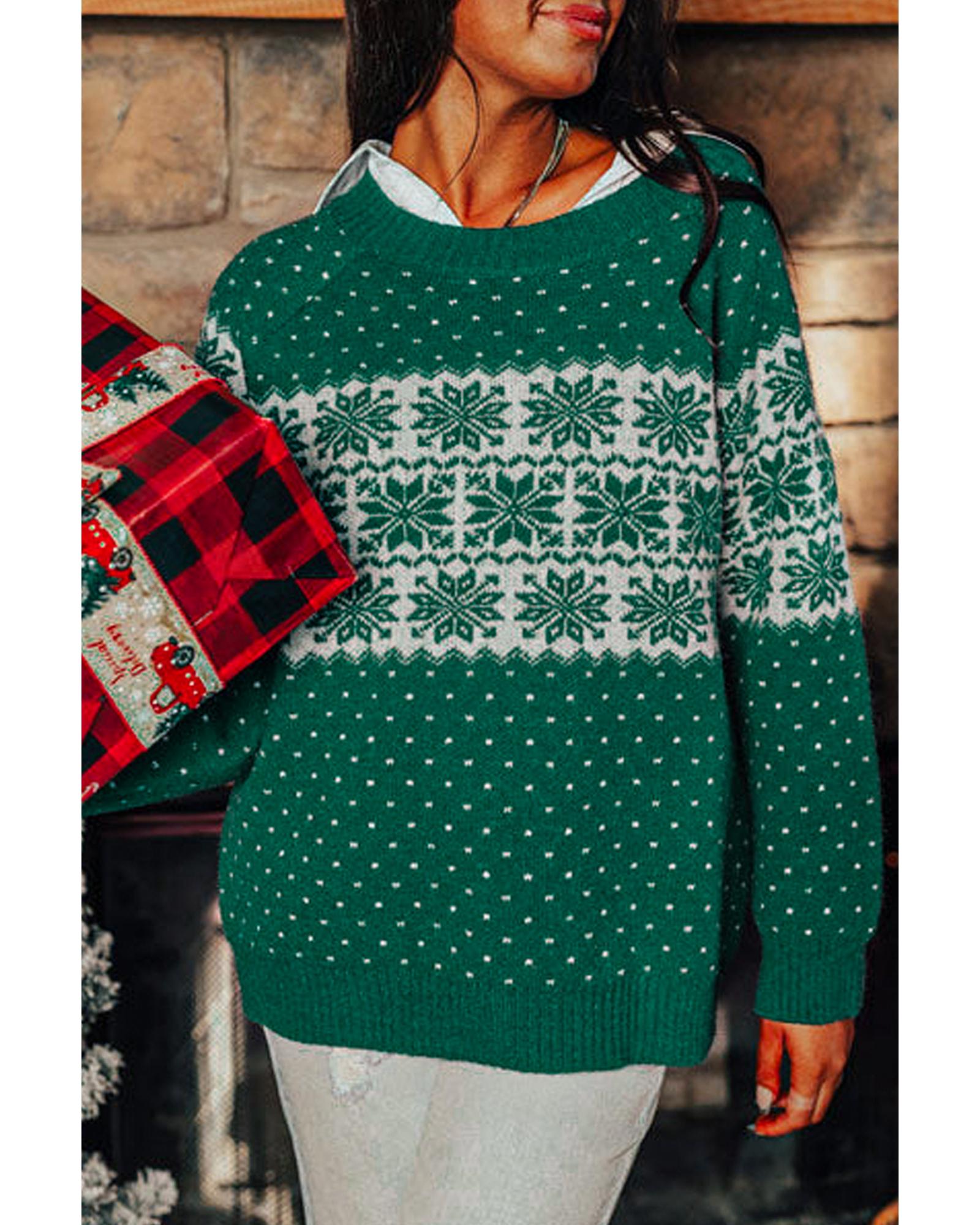 Green Christmas Snowflake Dotted Print Round Neck Sweater - L
