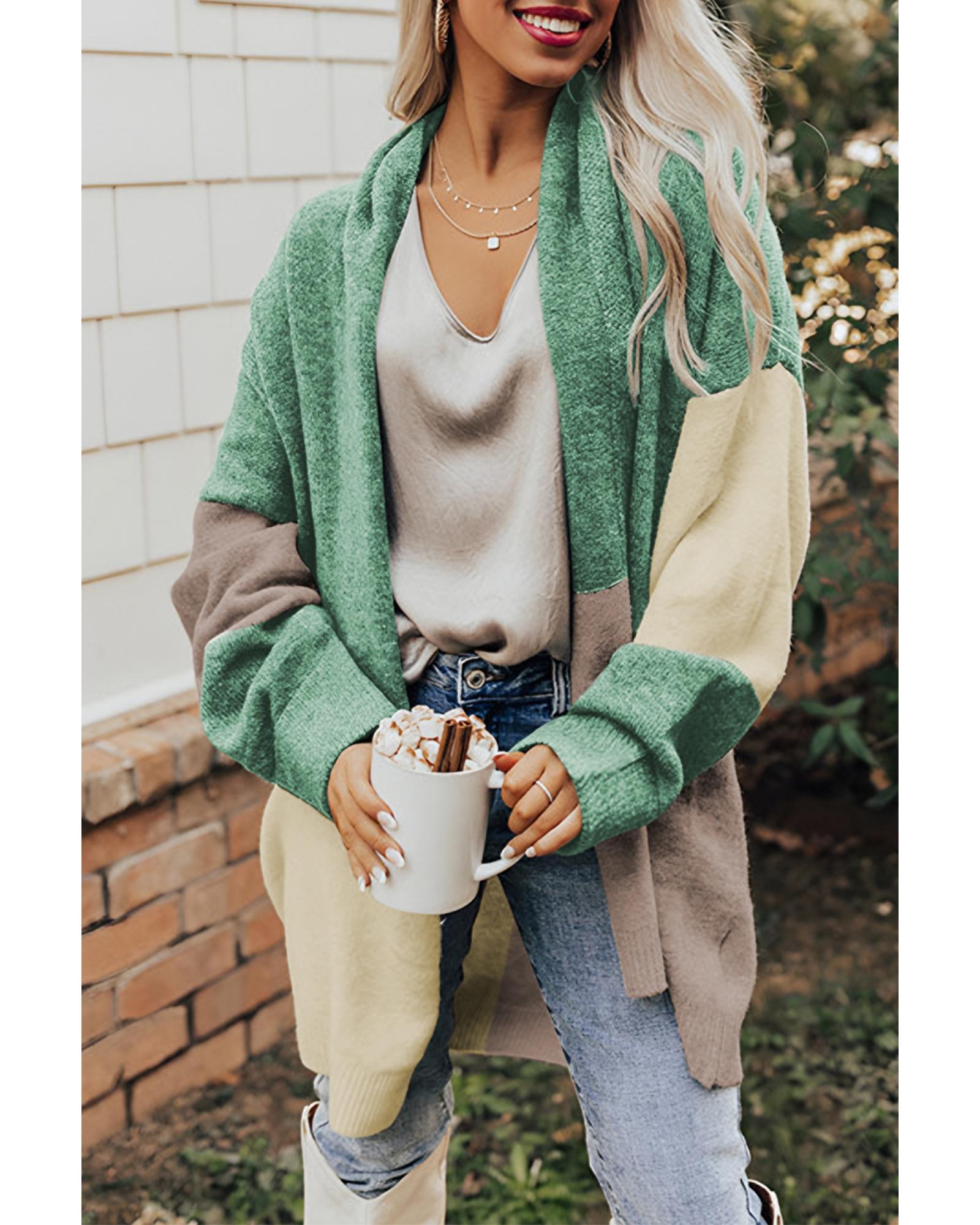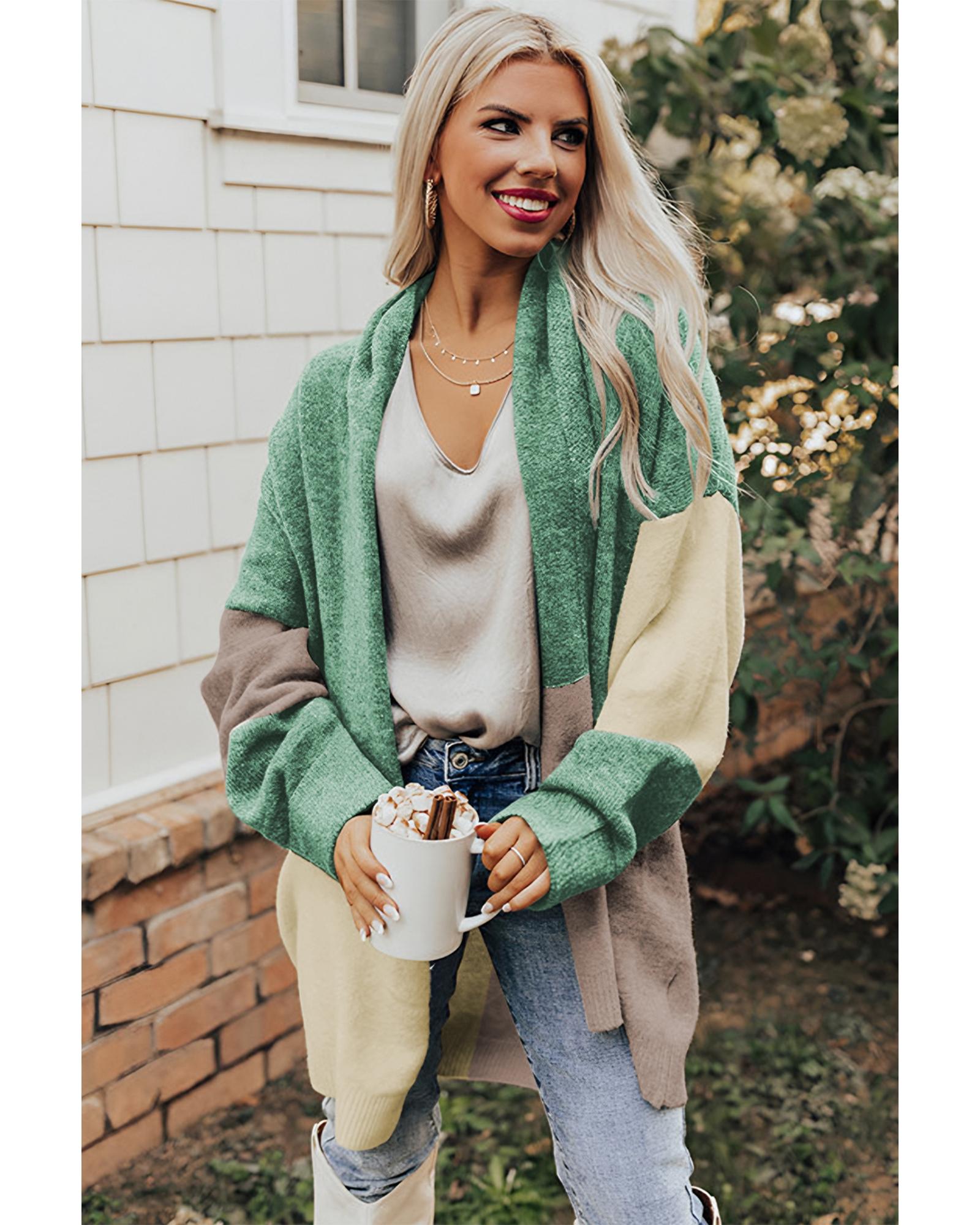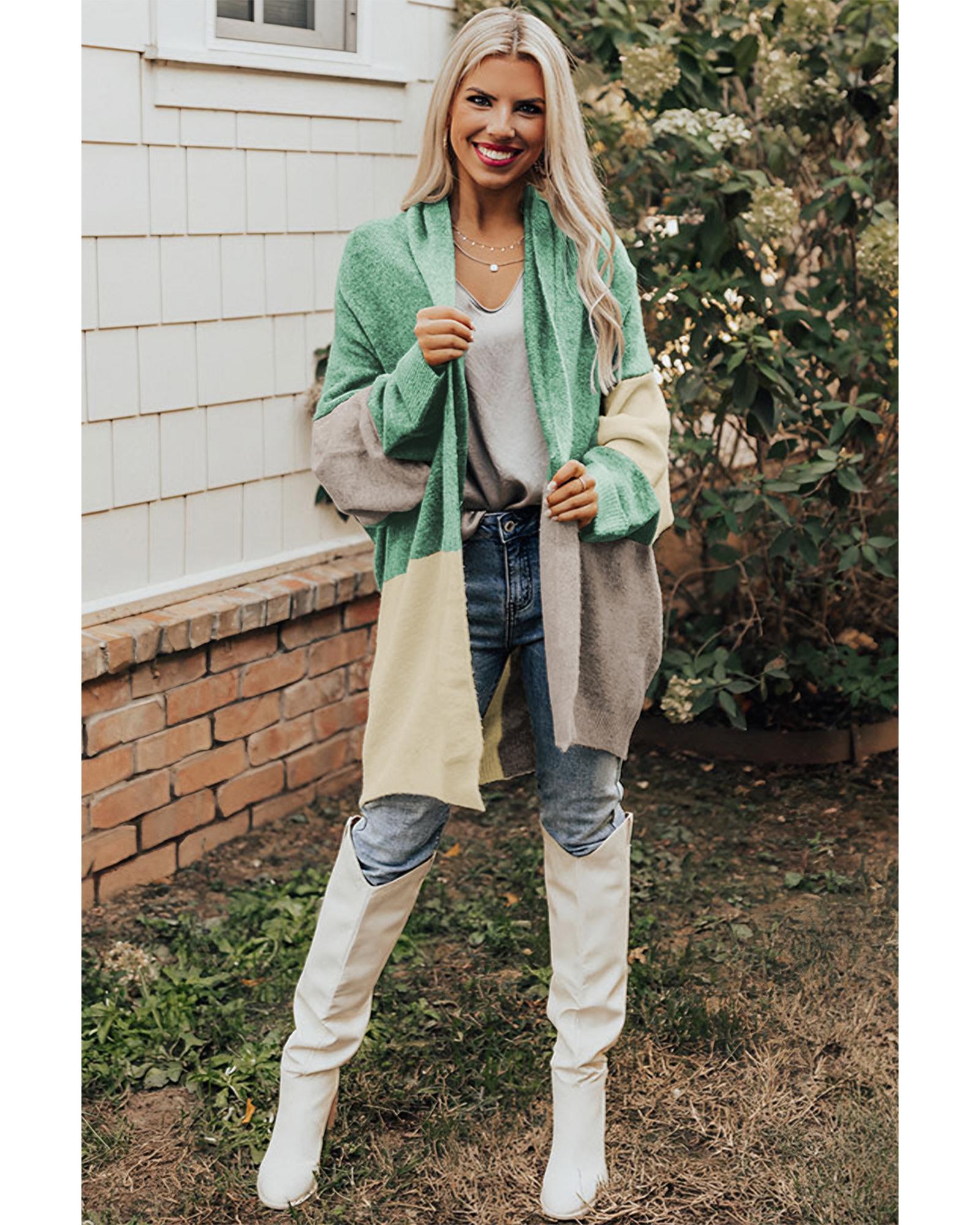 Green Colorblock Draped Open Front Chunky Cardigan - L