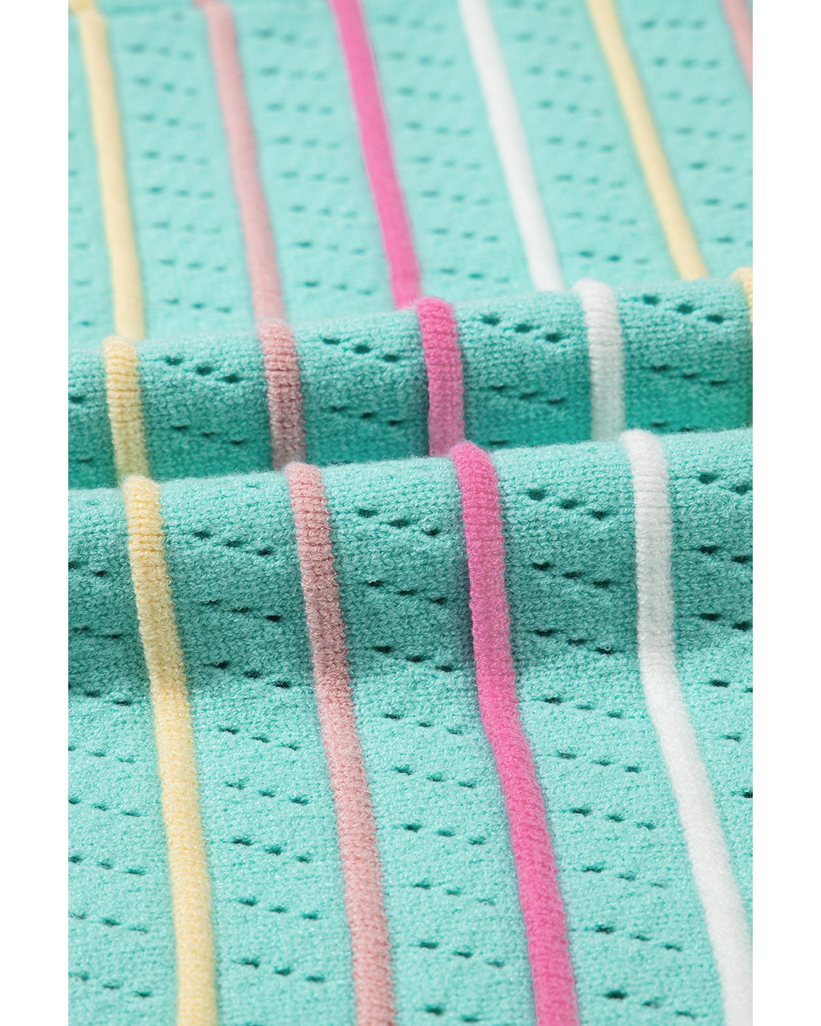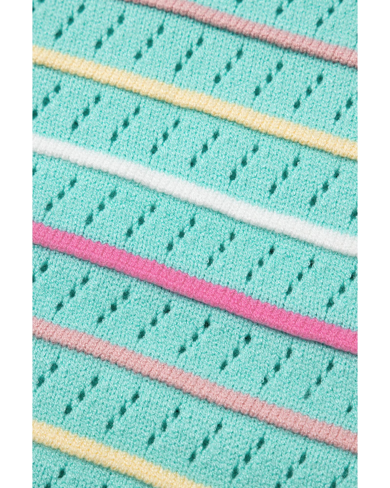 Green Colorful Striped Eyelet Knit Ruffled Sleeve Sweater T Shirt - M