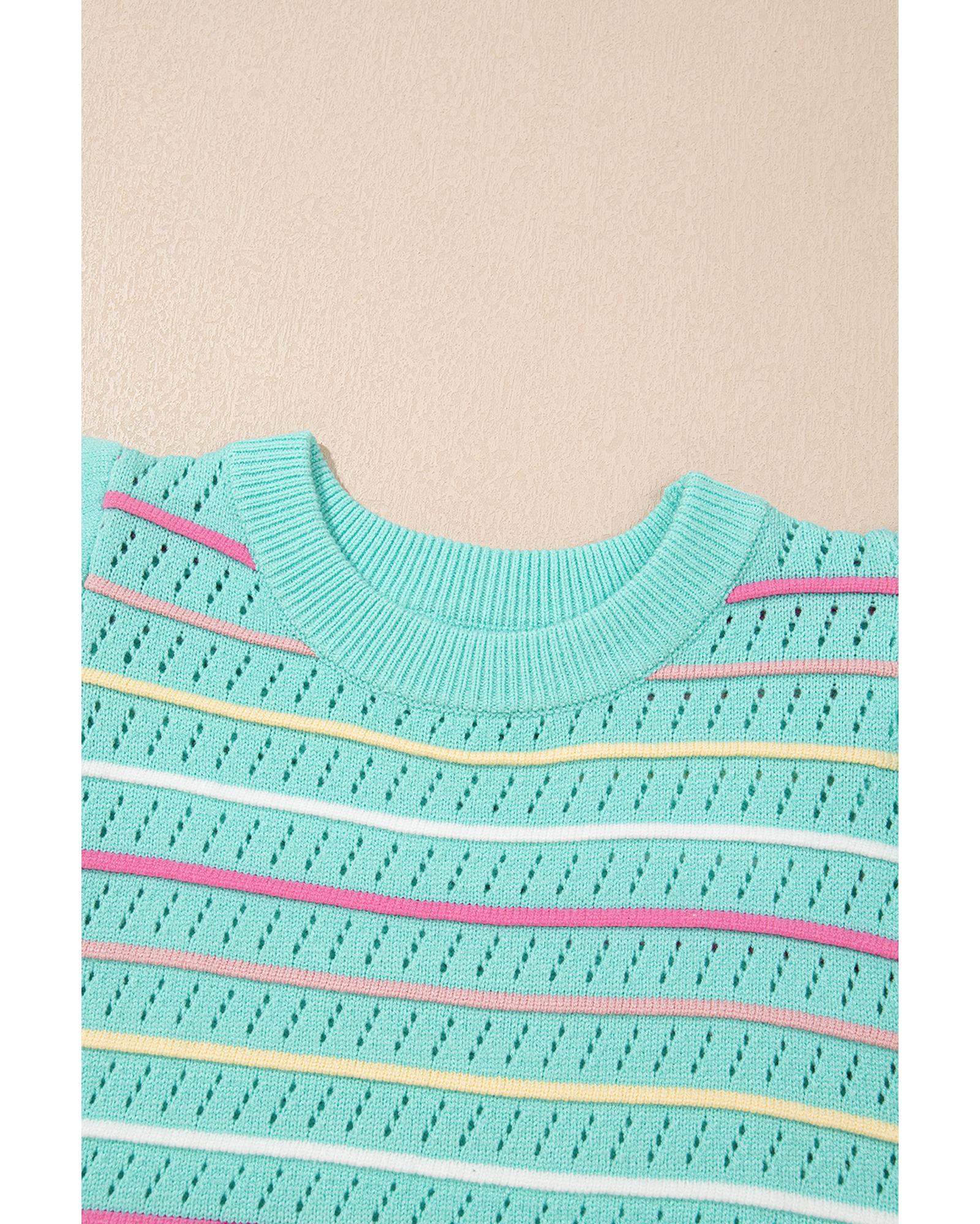Green Colorful Striped Eyelet Knit Ruffled Sleeve Sweater T Shirt - XL