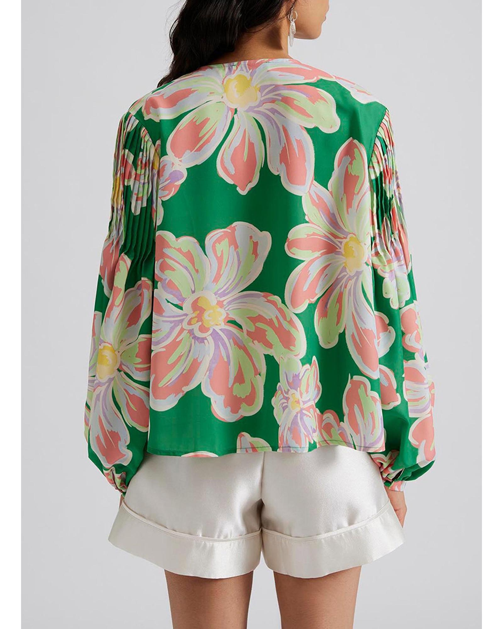 Green Floral Print Button up Pleated Puff Sleeve Loose Shirt - M