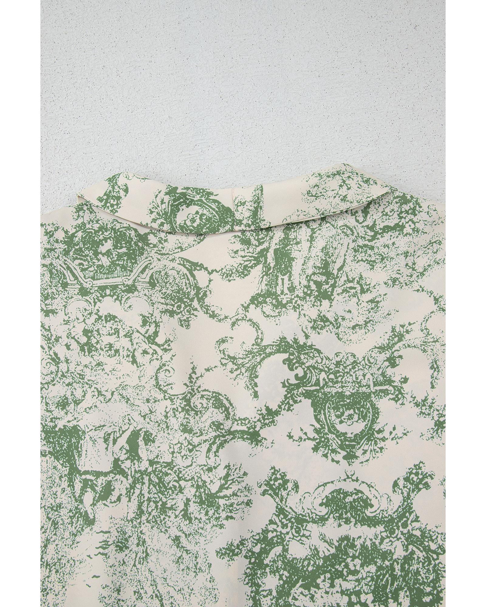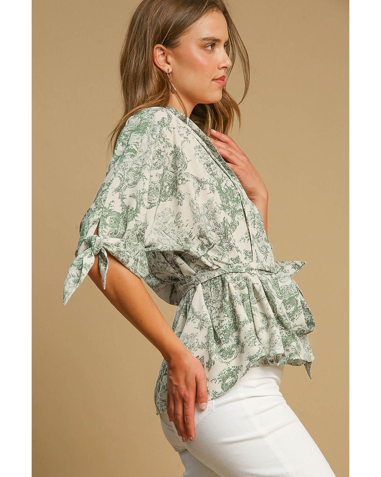 Green Landscape Print Tied 3/4 Sleeve Shirt with Sash - S