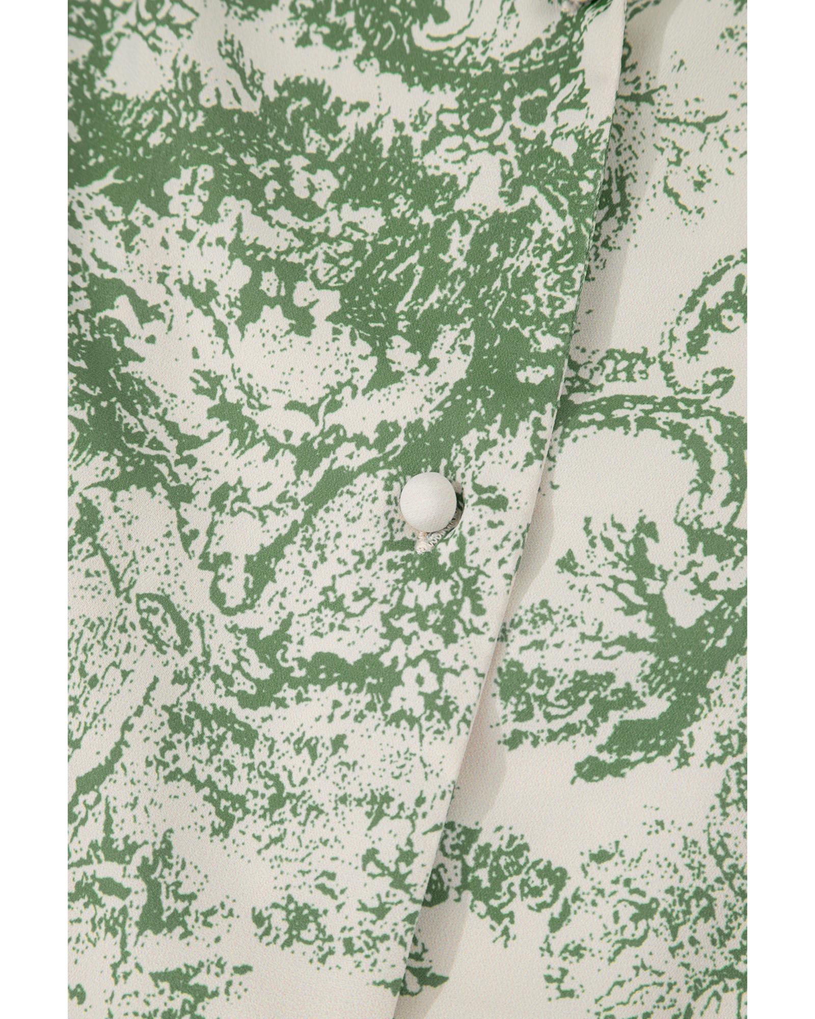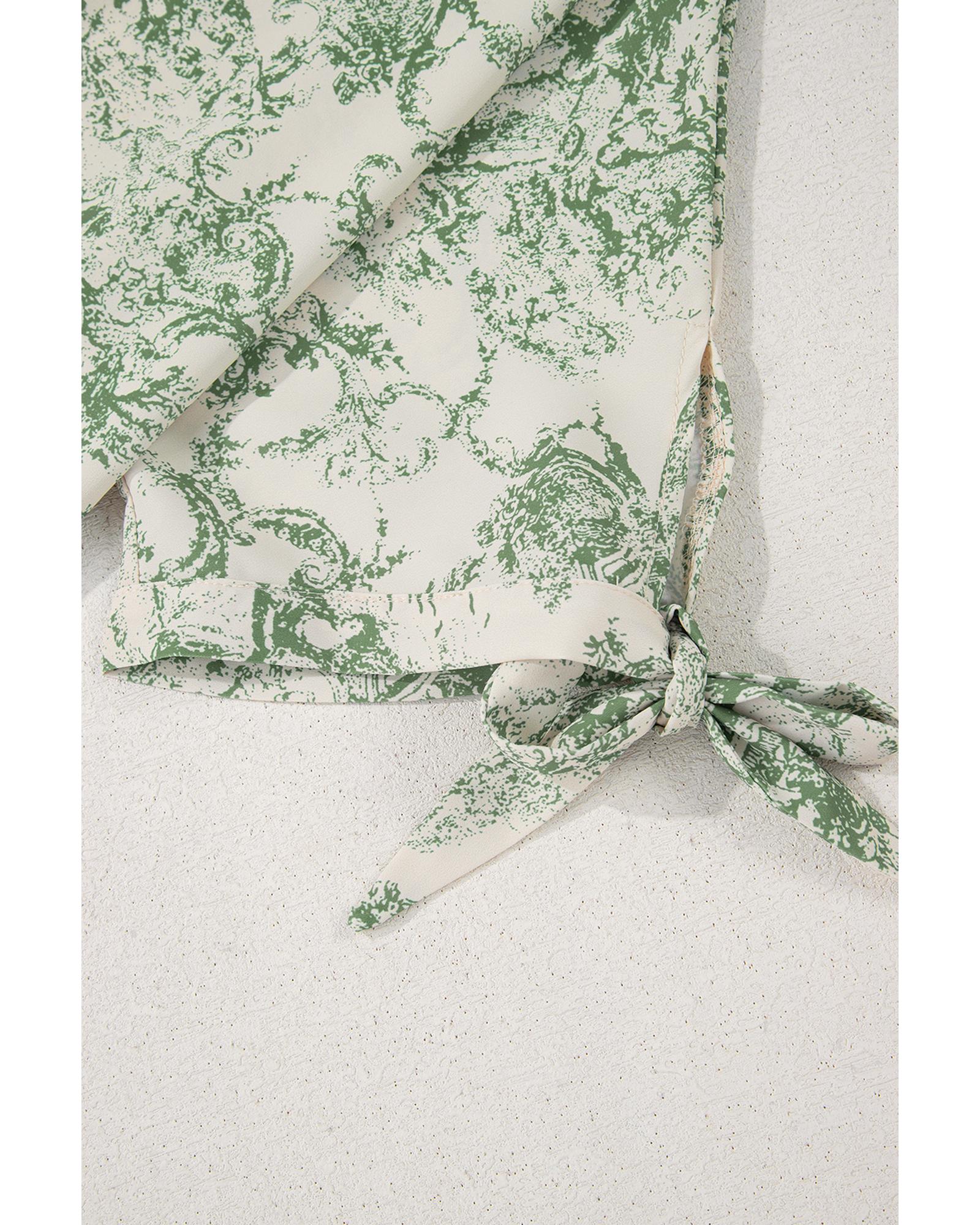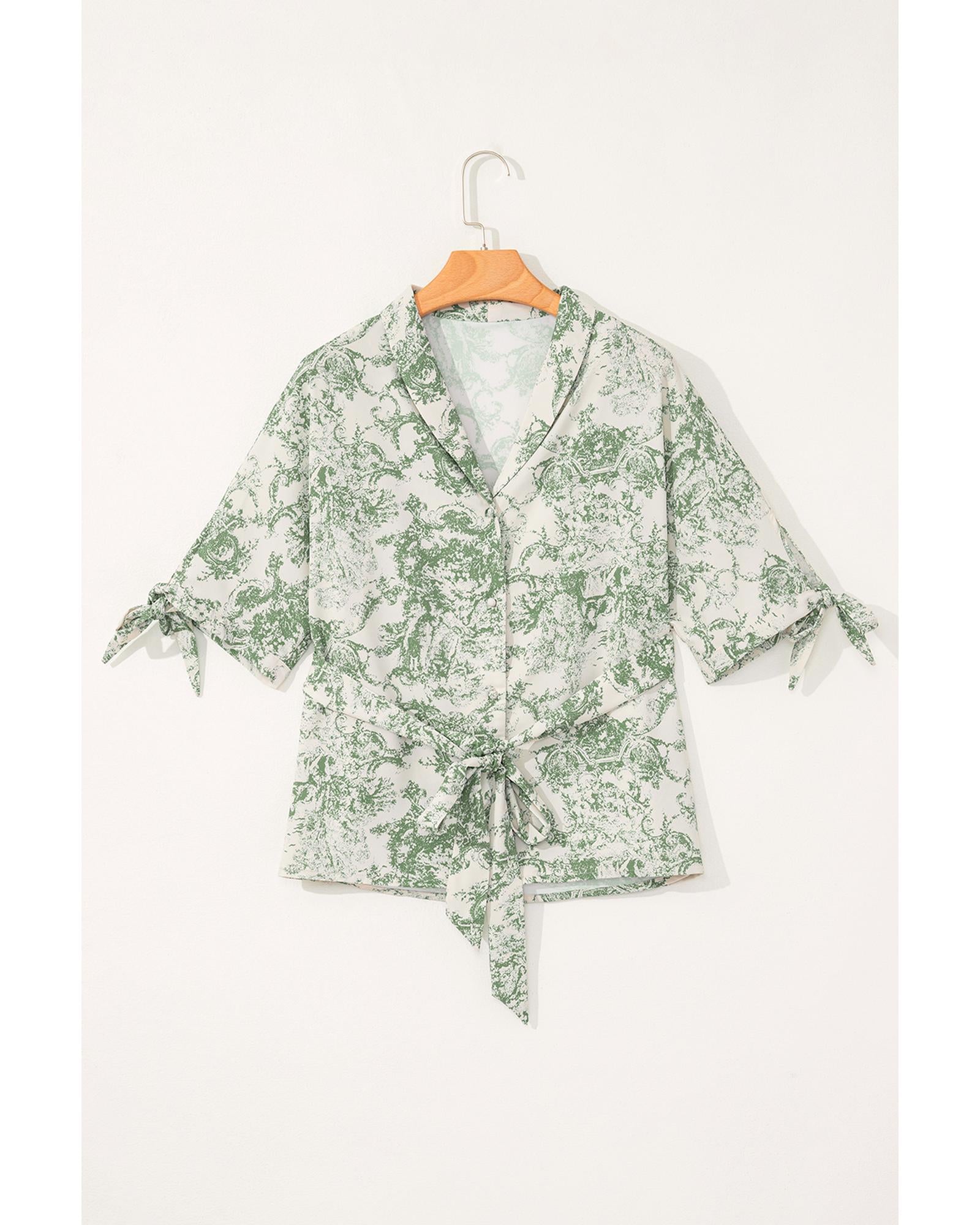 Green Landscape Print Tied 3/4 Sleeve Shirt with Sash - XL