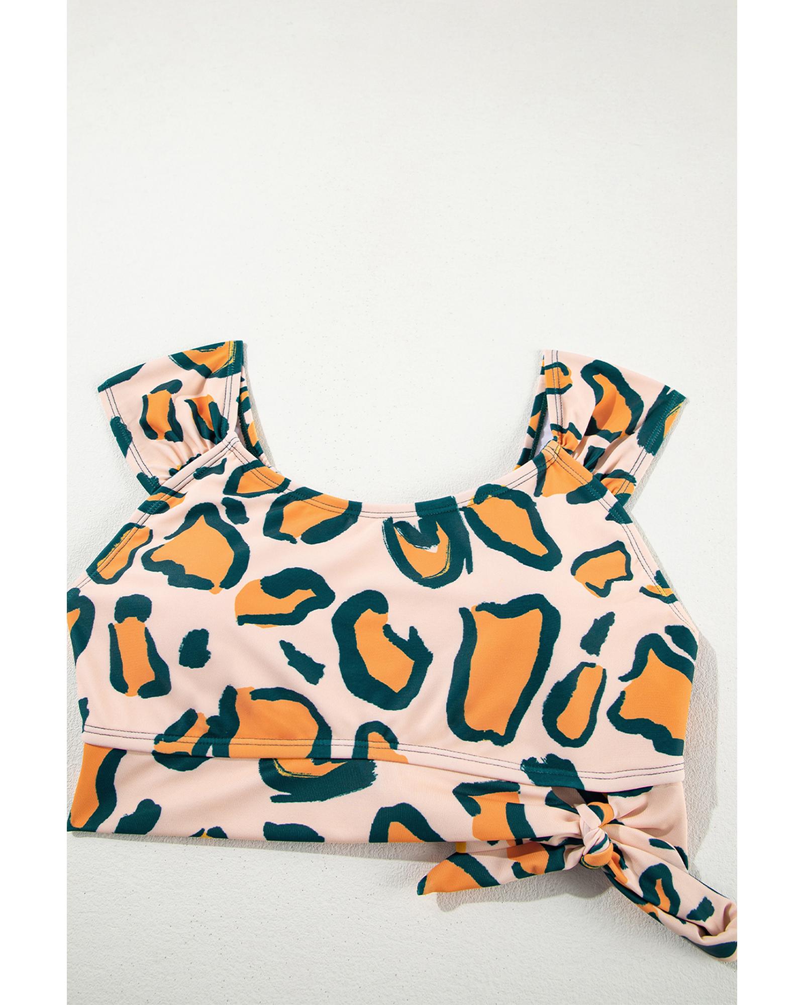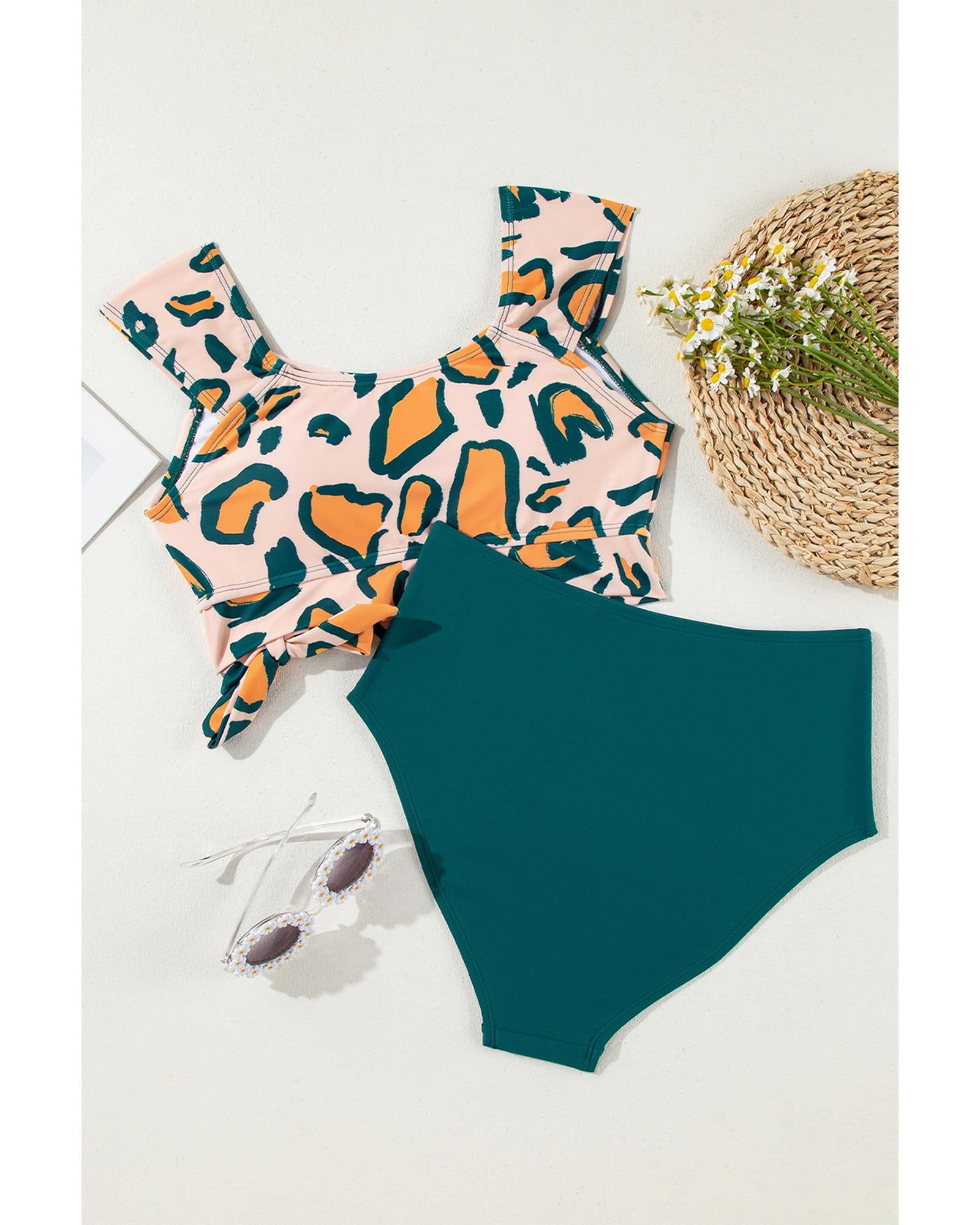Green Leopard Print U Neck Knotted High Waist Bikini Set - XL