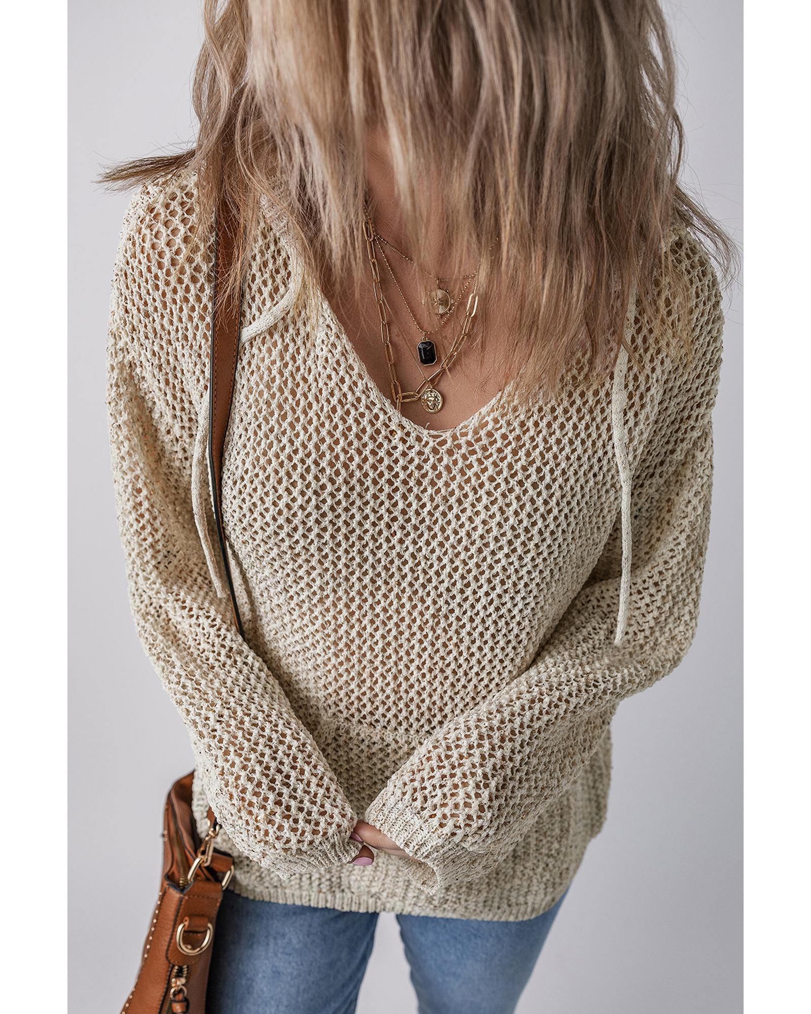 Jet Stream Hollow-out Kangaroo Pocket V Neck Hooded Sweater - L