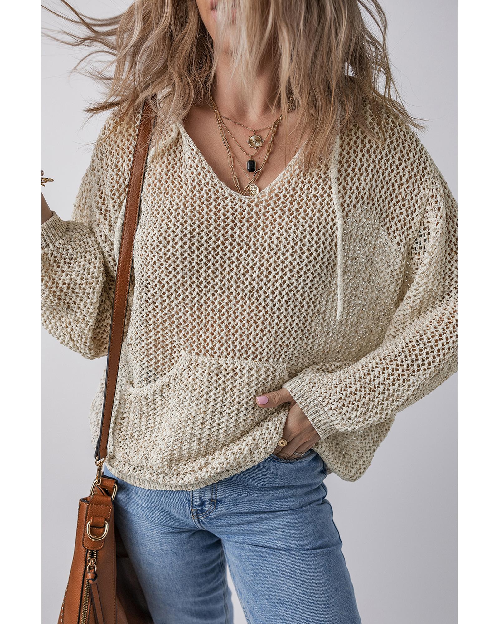 Jet Stream Hollow-out Kangaroo Pocket V Neck Hooded Sweater - M