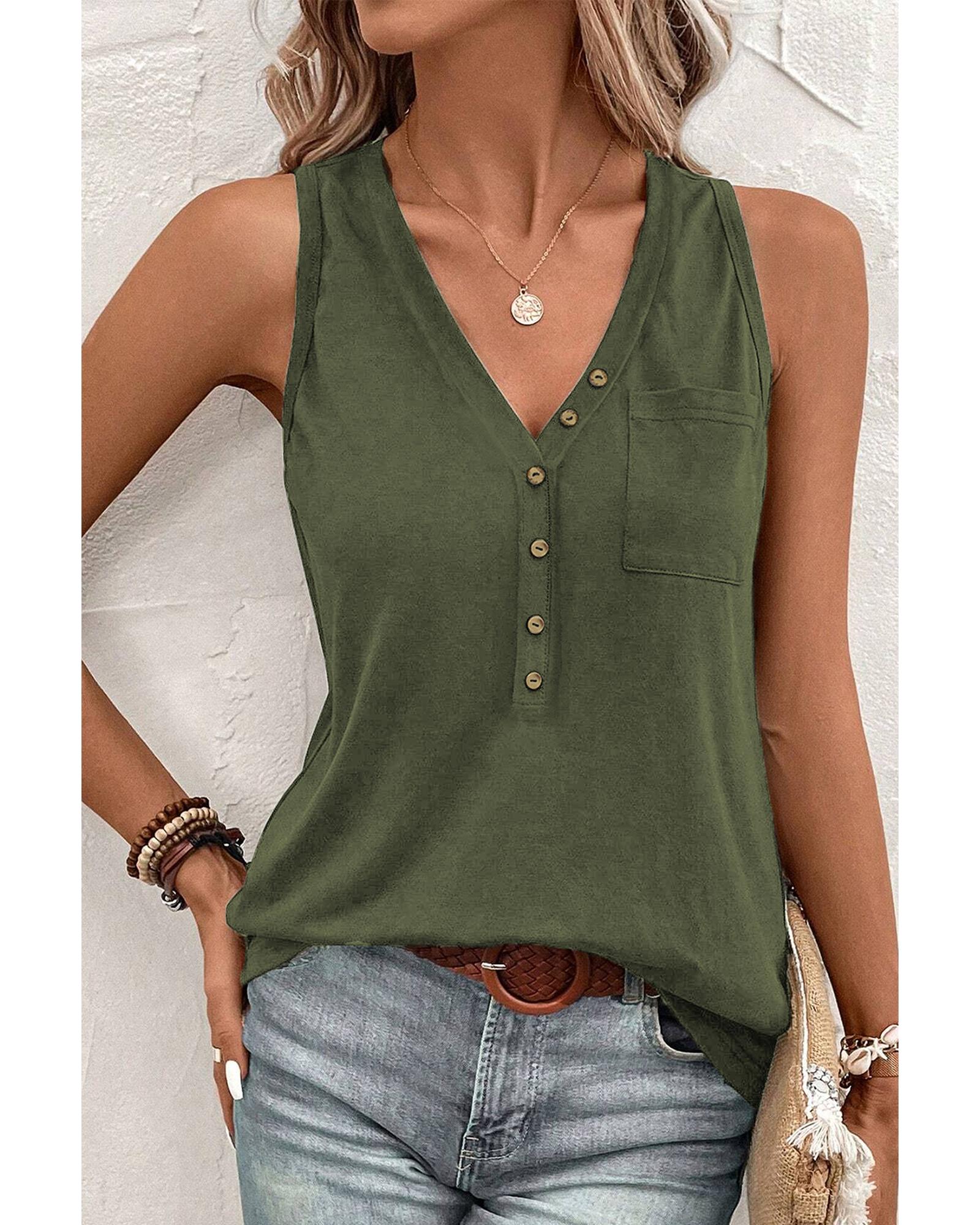Jungle Green Half Button V Neck Patched Pocket Tank Top - L