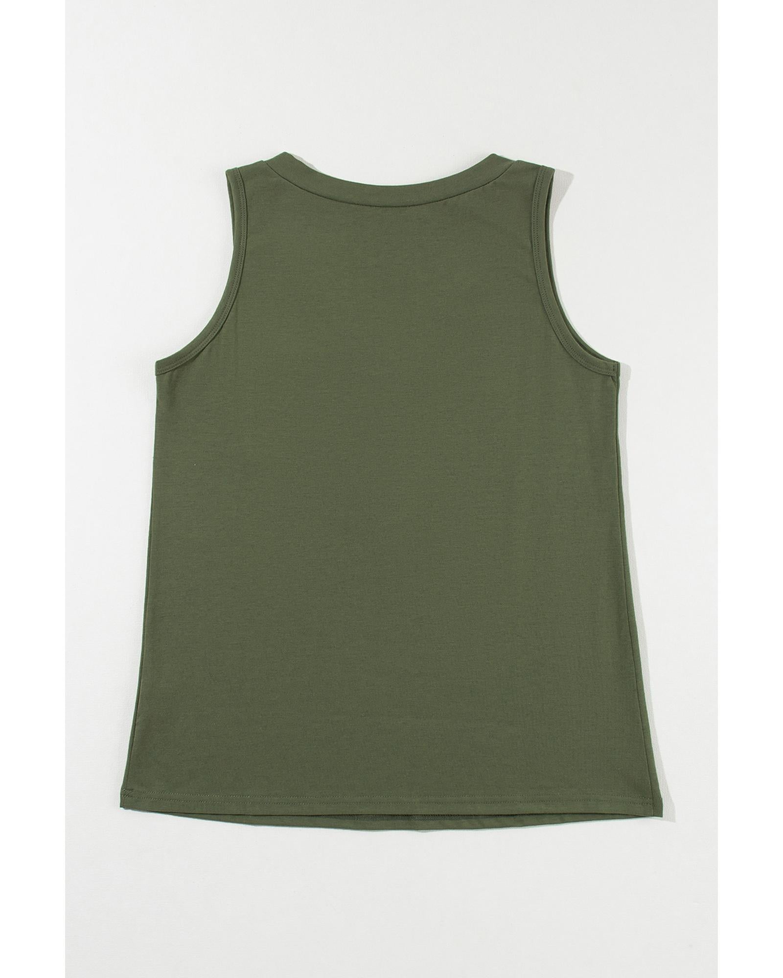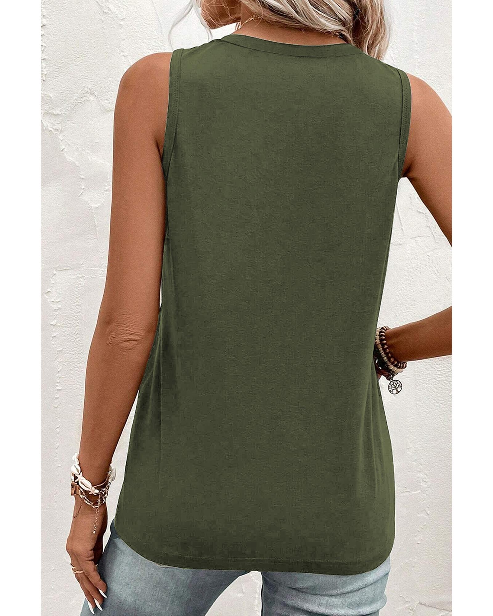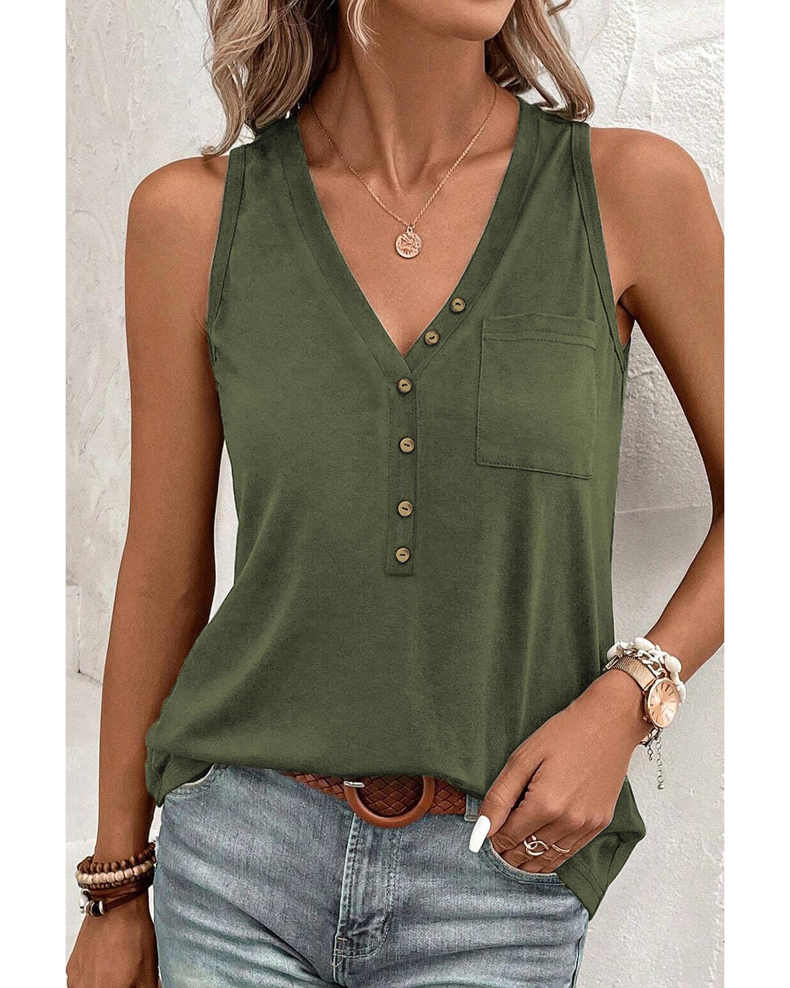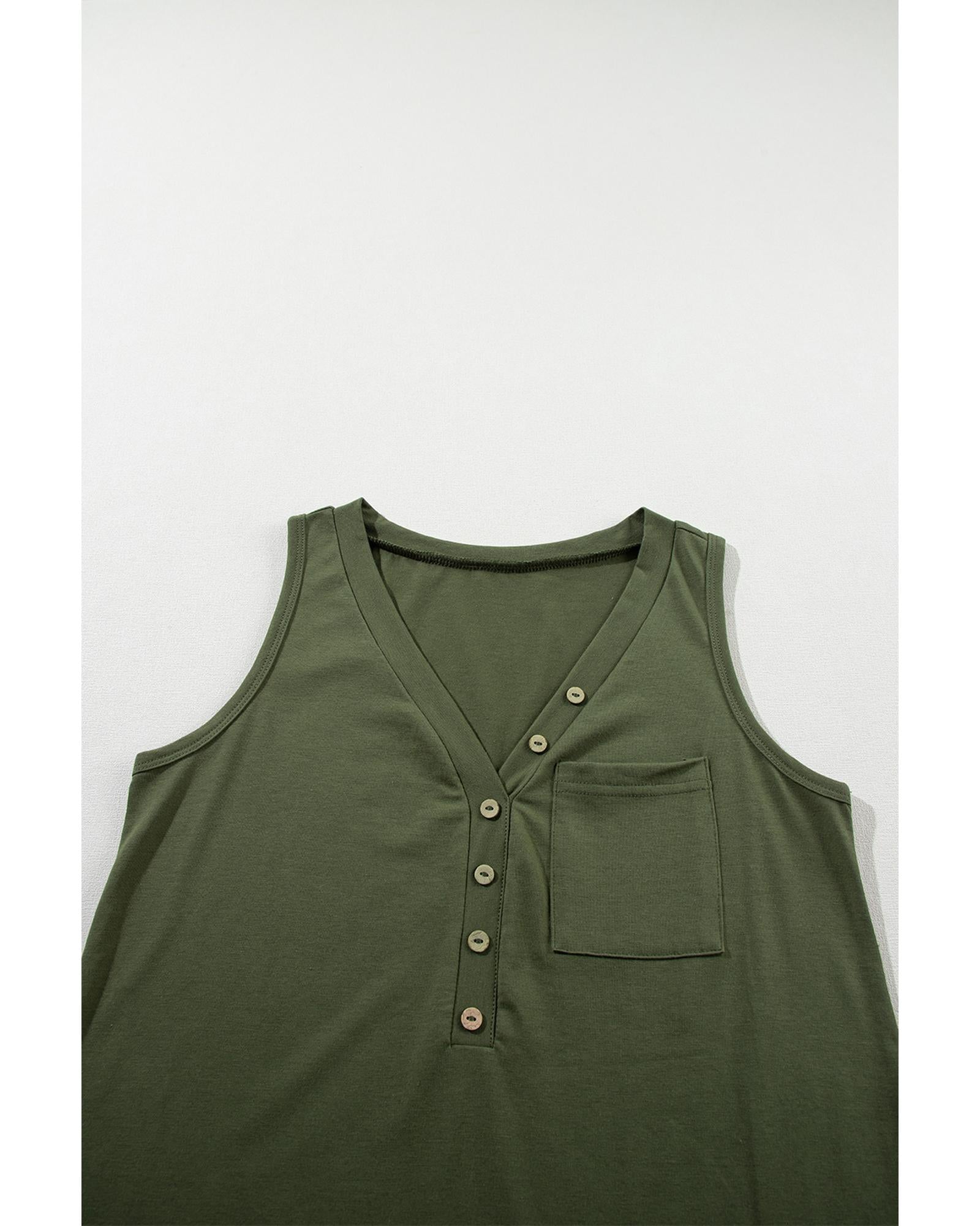 Jungle Green Half Button V Neck Patched Pocket Tank Top - S