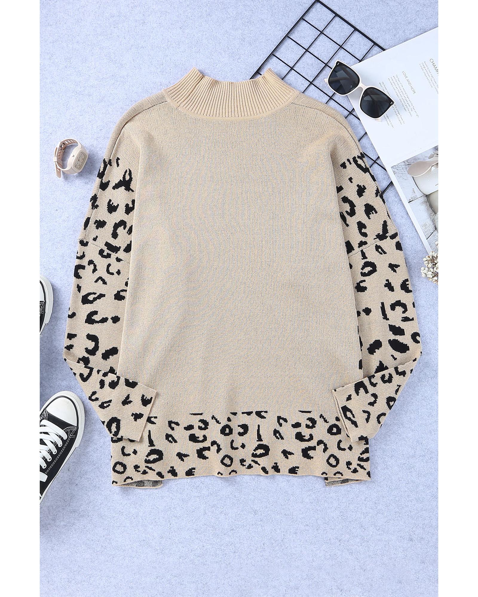Khaki Leopard High Neck Side Slit Oversized Sweater - L