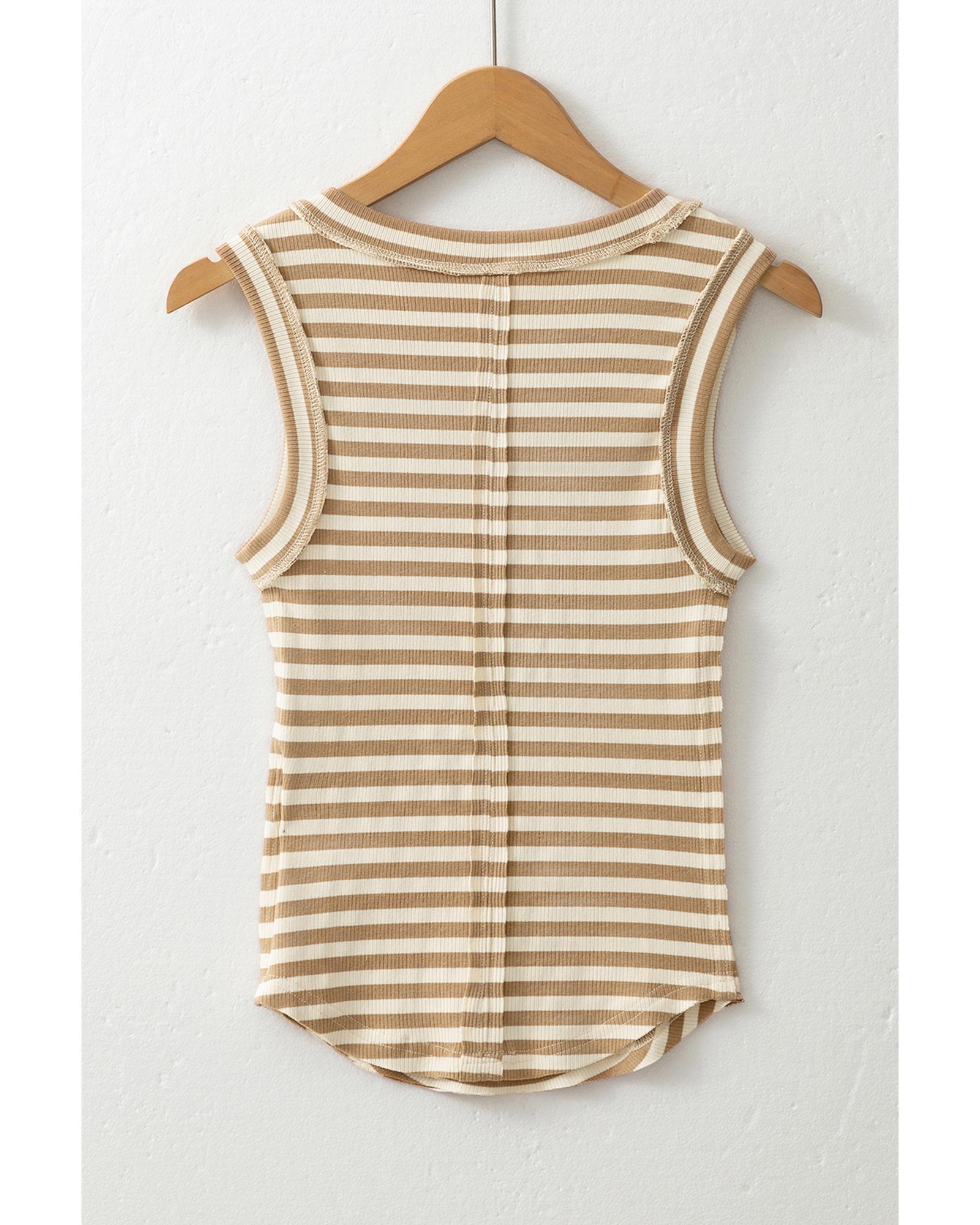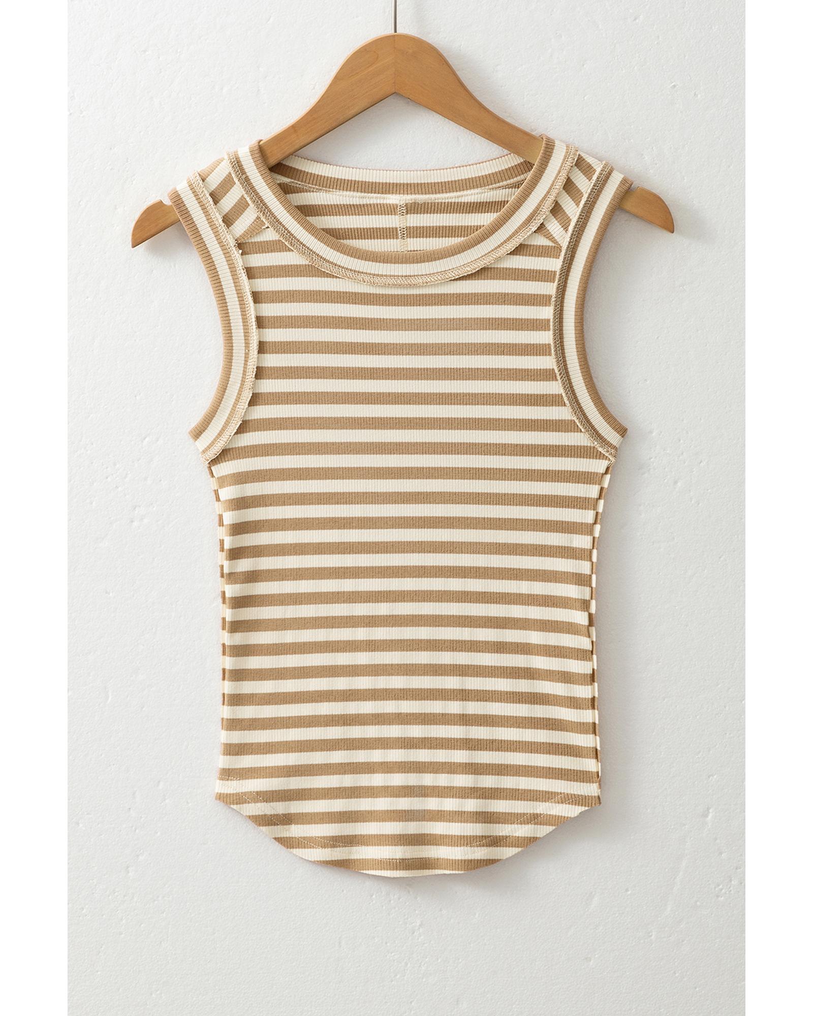 Khaki Stripe Exposed Seam Trim Round Neck Sleeveless Top - XL