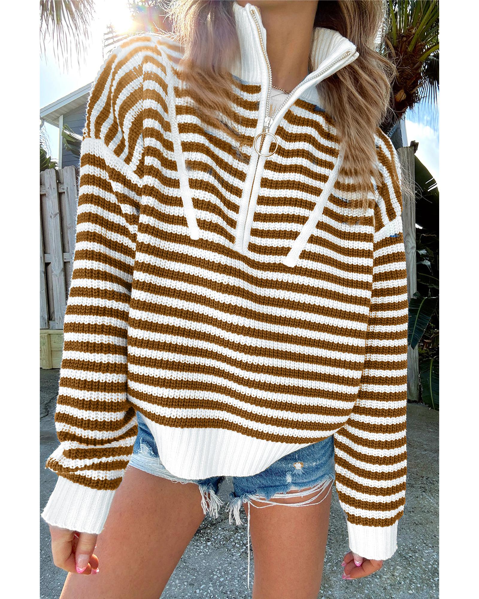 Khaki Stripe Zip up Collar Drop Shoulder Sweater - M