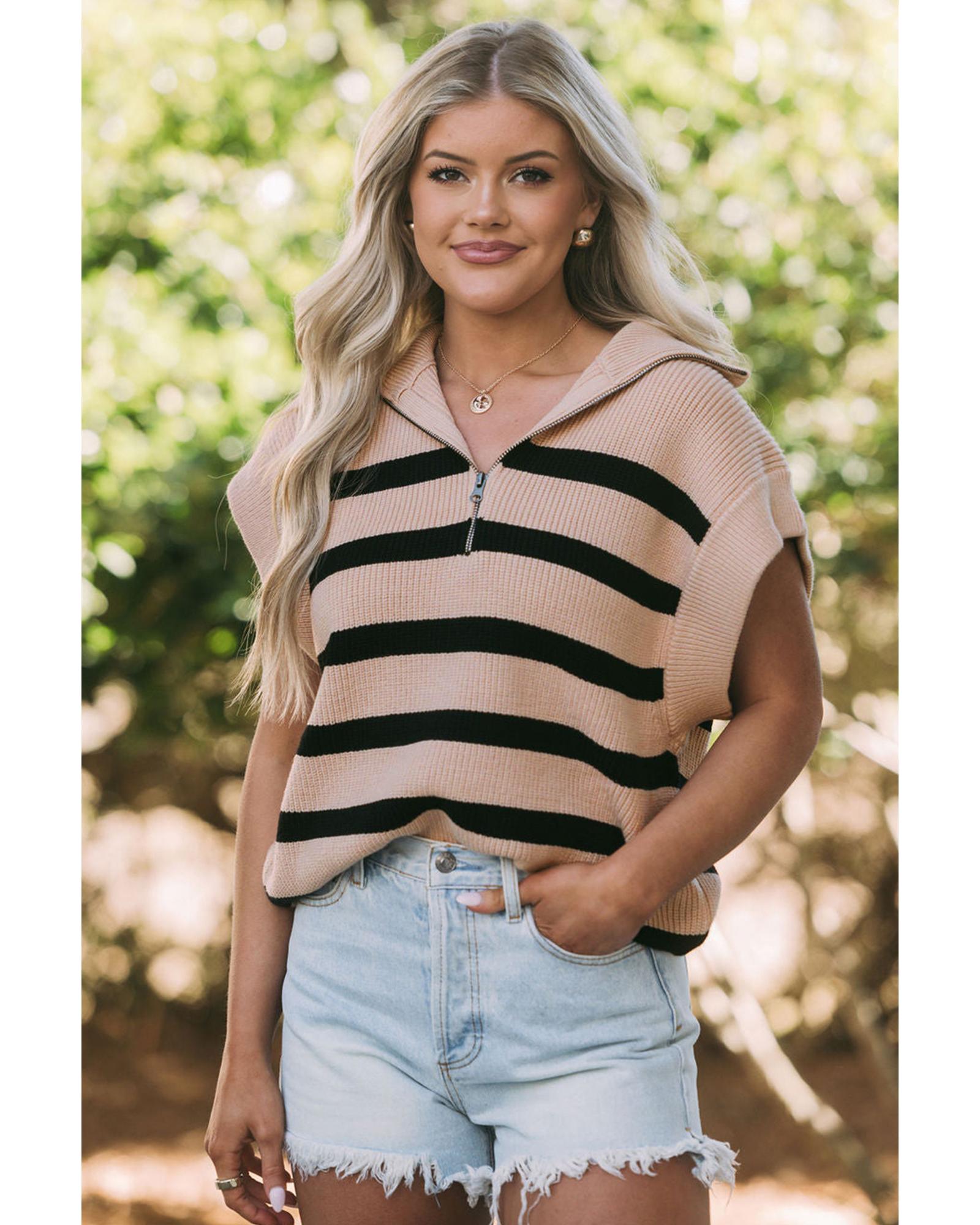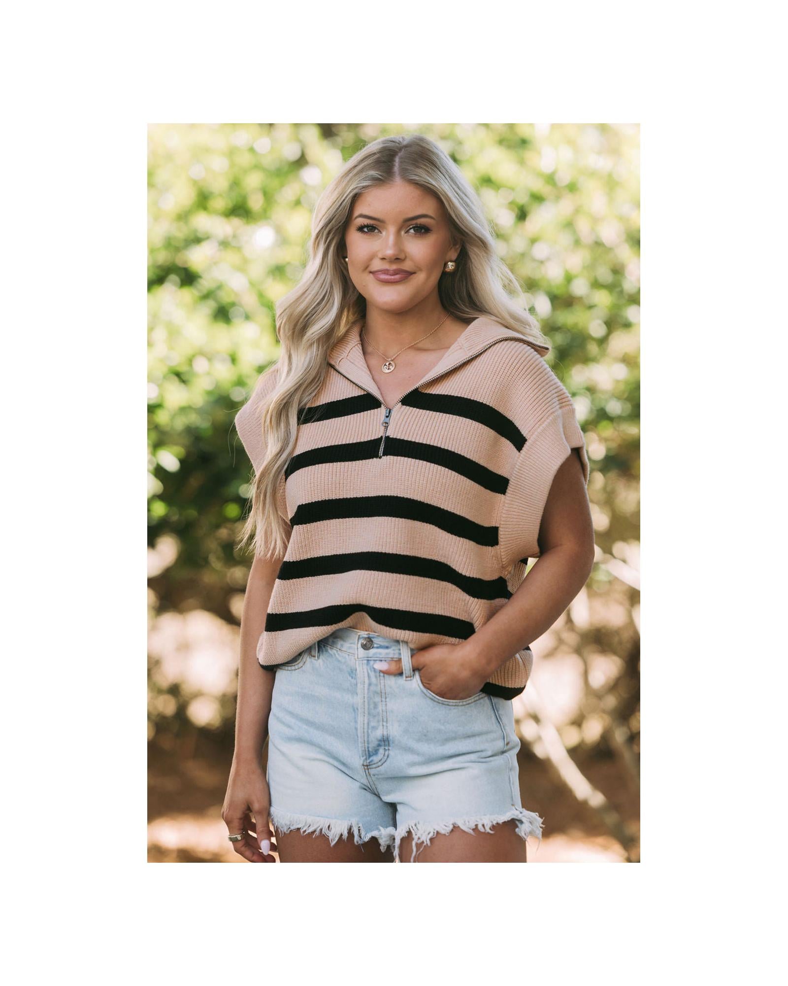 Khaki Stripe Zipped Collar Short Sleeve Sweater - L