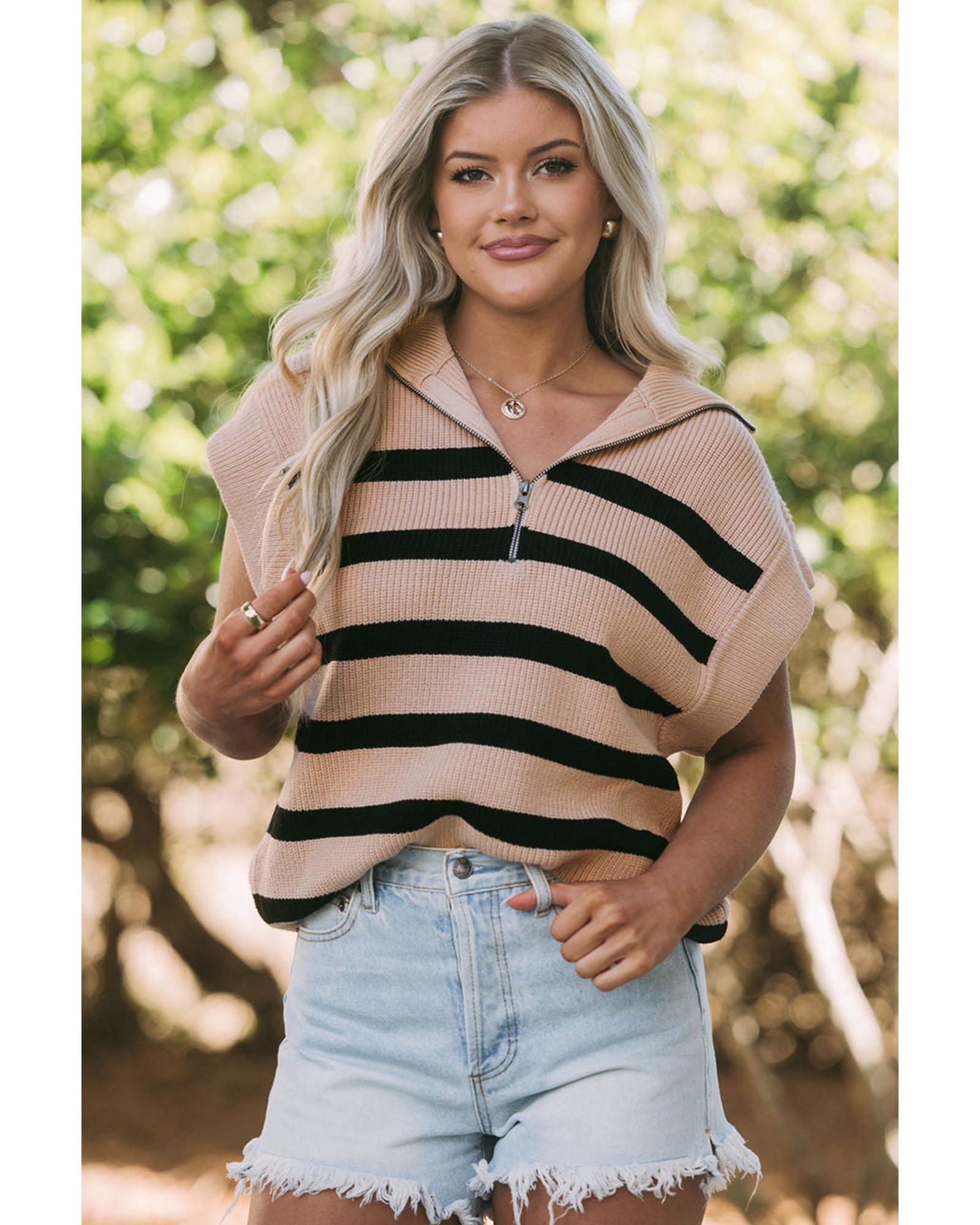 Khaki Stripe Zipped Collar Short Sleeve Sweater - M