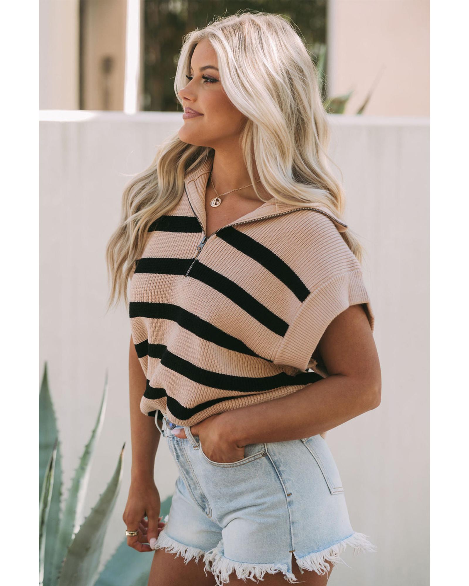 Khaki Stripe Zipped Collar Short Sleeve Sweater - XL
