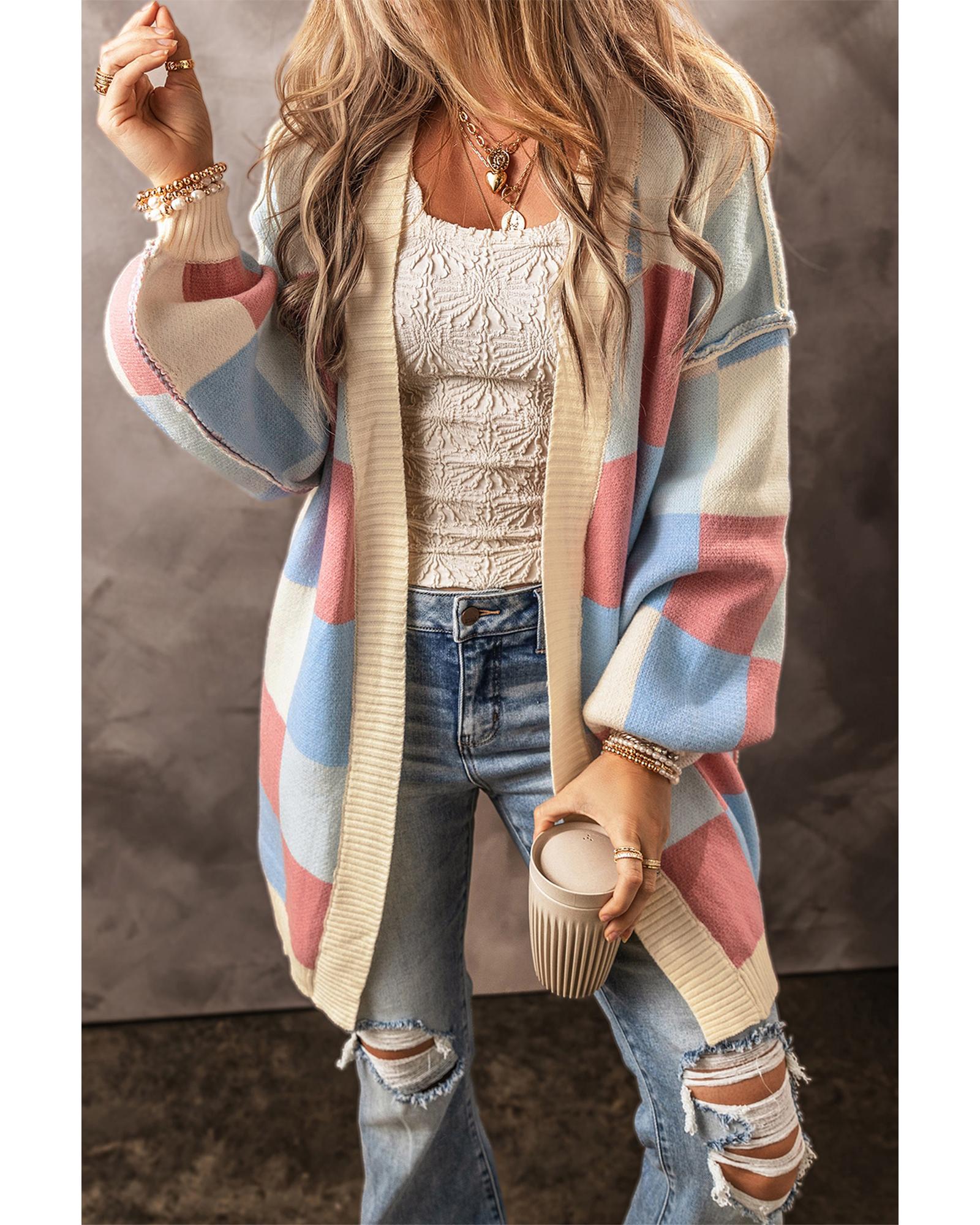 Light Blue Checkered Drop Shoulder Exposed Seam Open Front Cardigan - S