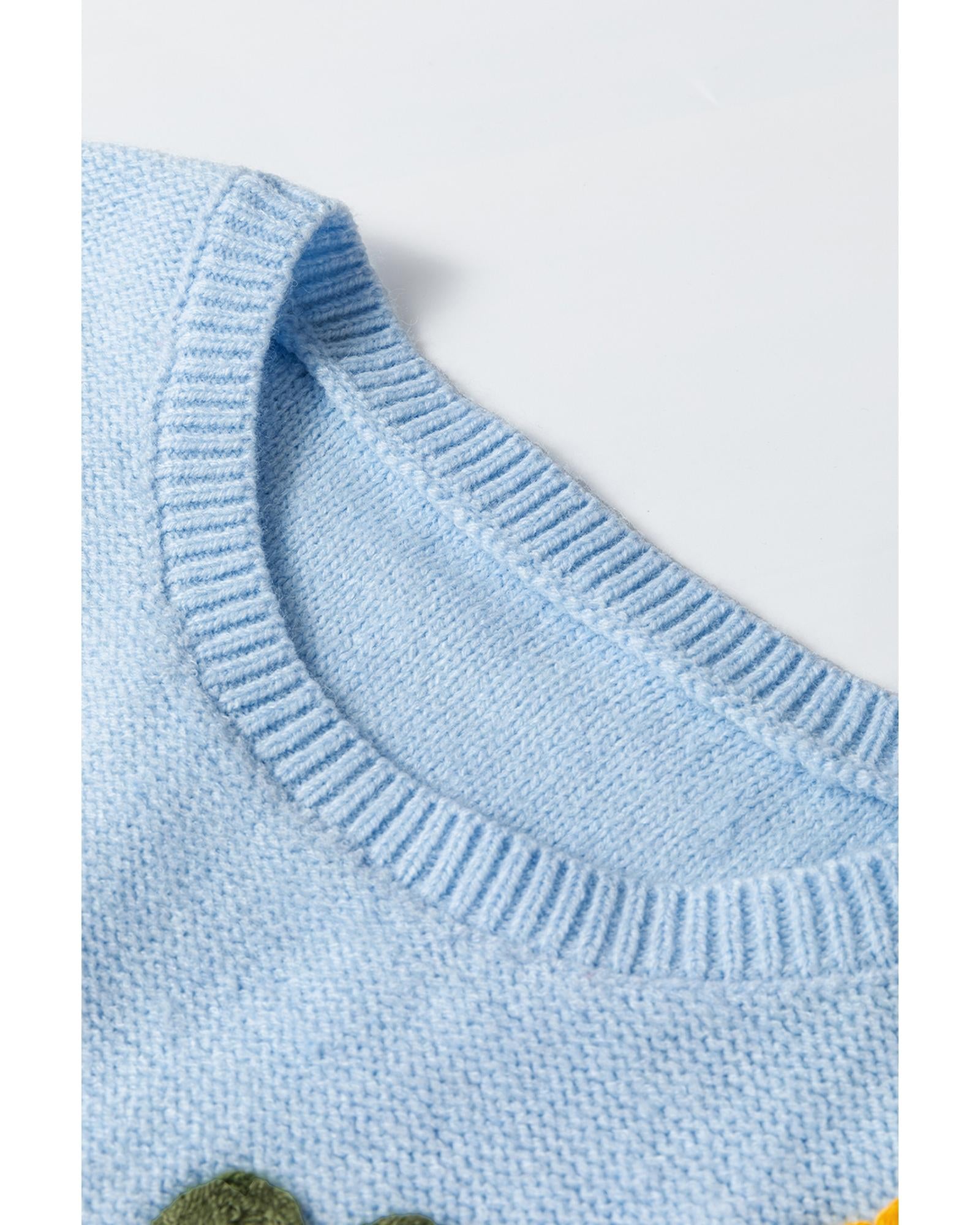 Light Blue Knitted Flower Pattern Ribbed Edge Sweater - S