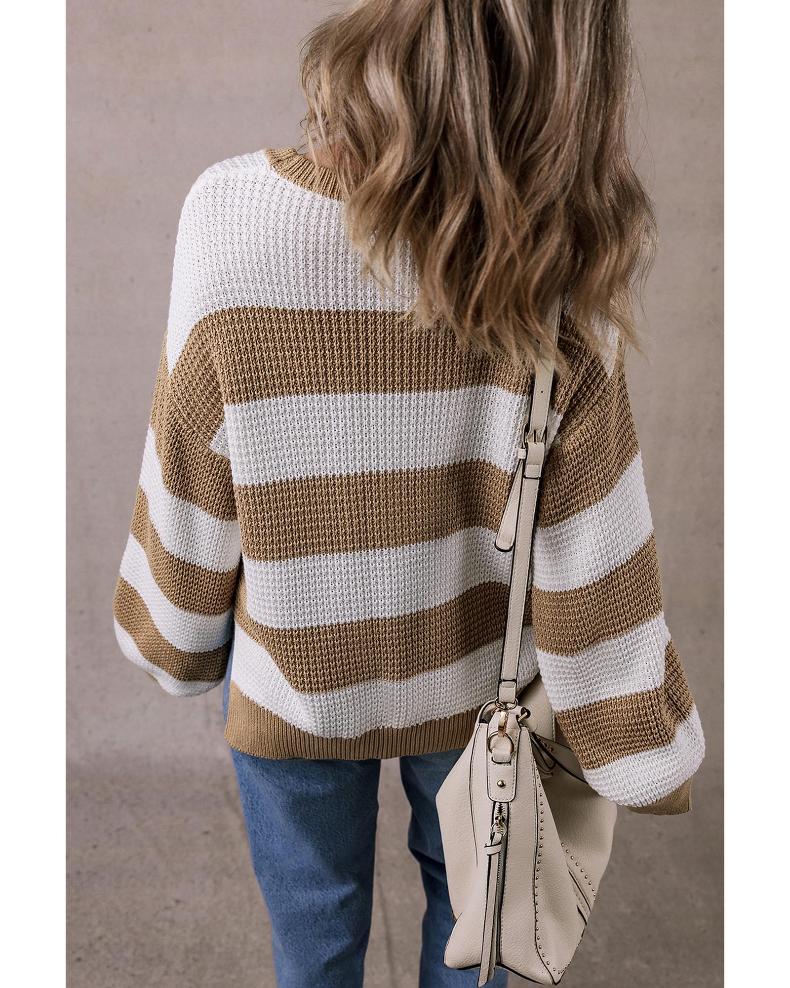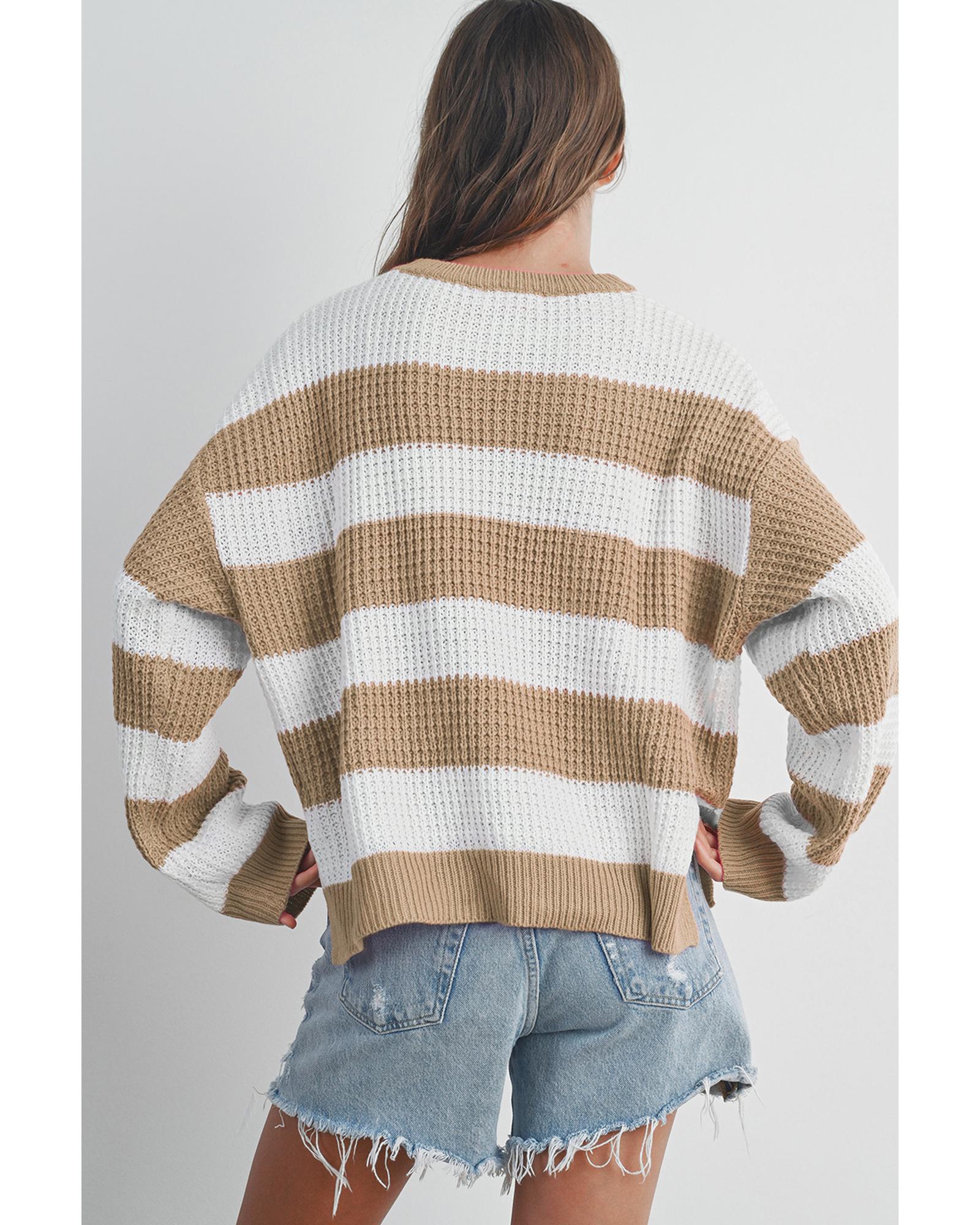 Light French Beige Colorblock Striped Drop Shoulder Side Slit Sweater - L