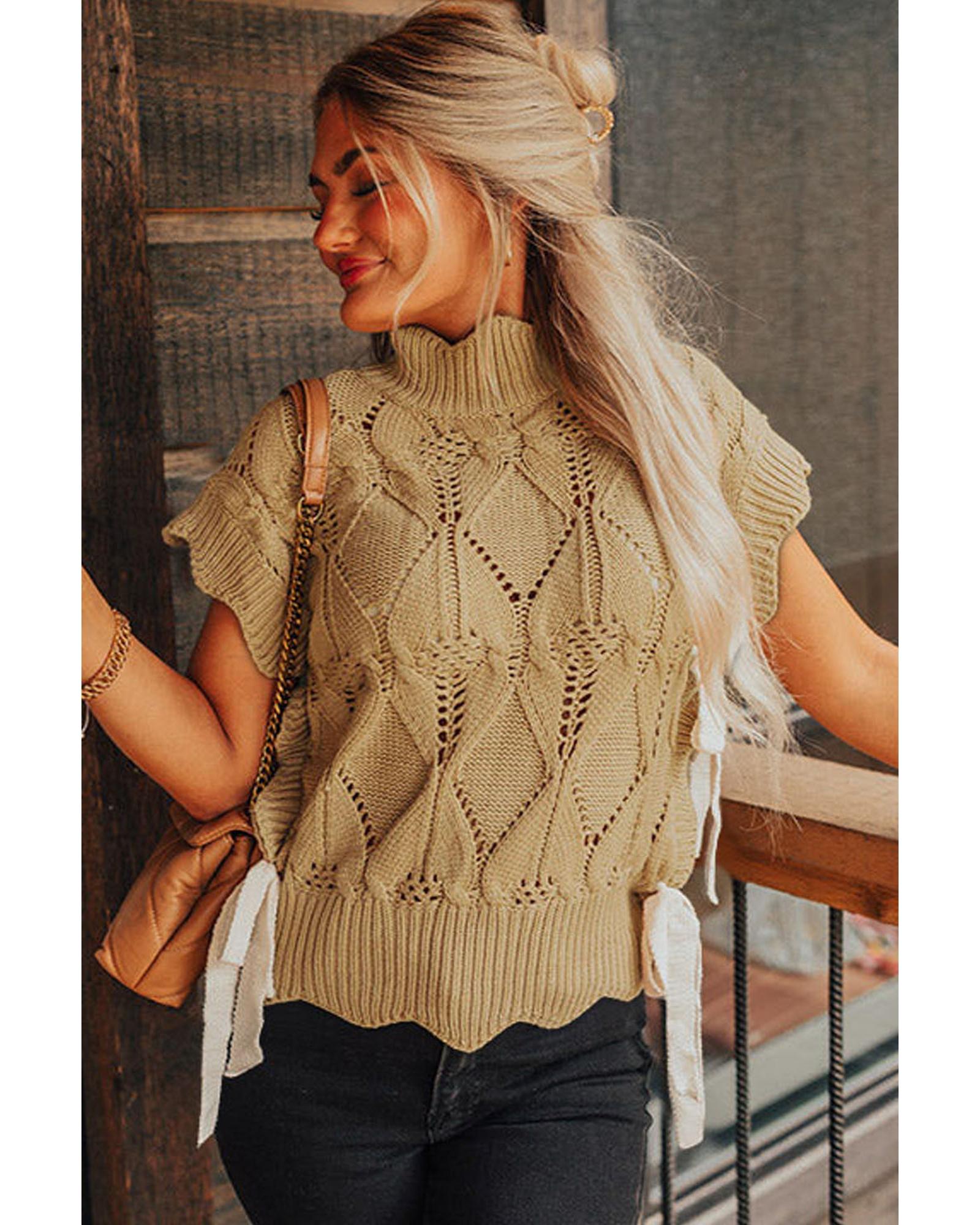 Light French Beige Hollowed Knit Scalloped Trim High Neck Sweater - L