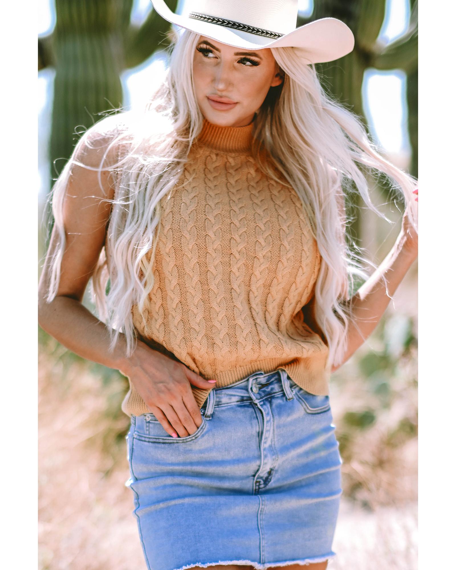 Light French Beige Solid Color Cable Knit High Neck Tank Top - M