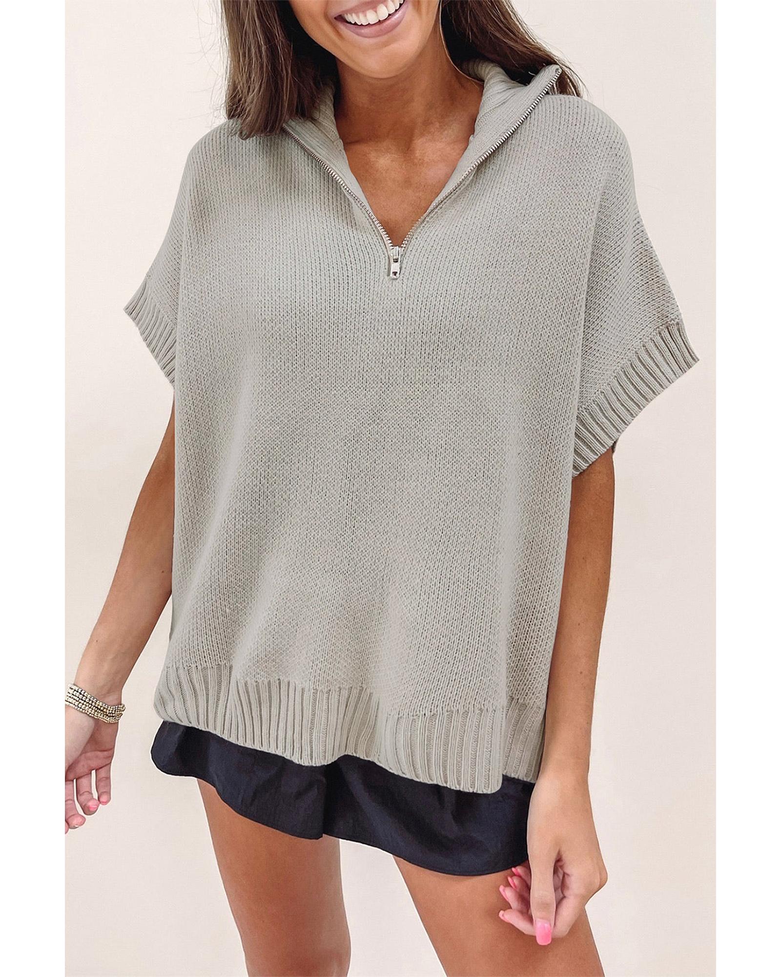 Light Grey Quarter Zip Short Batwing Sleeve Sweater - L