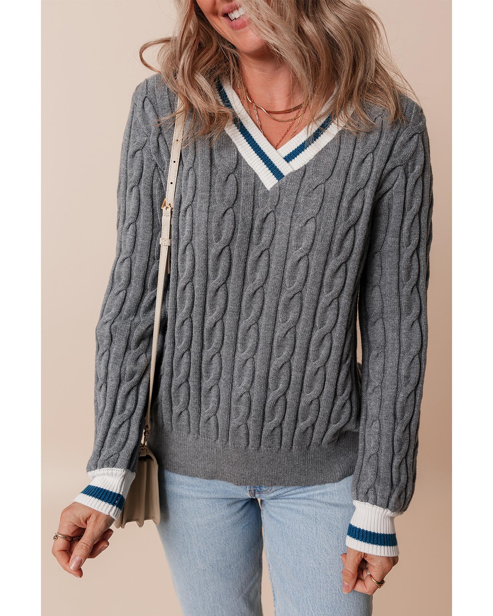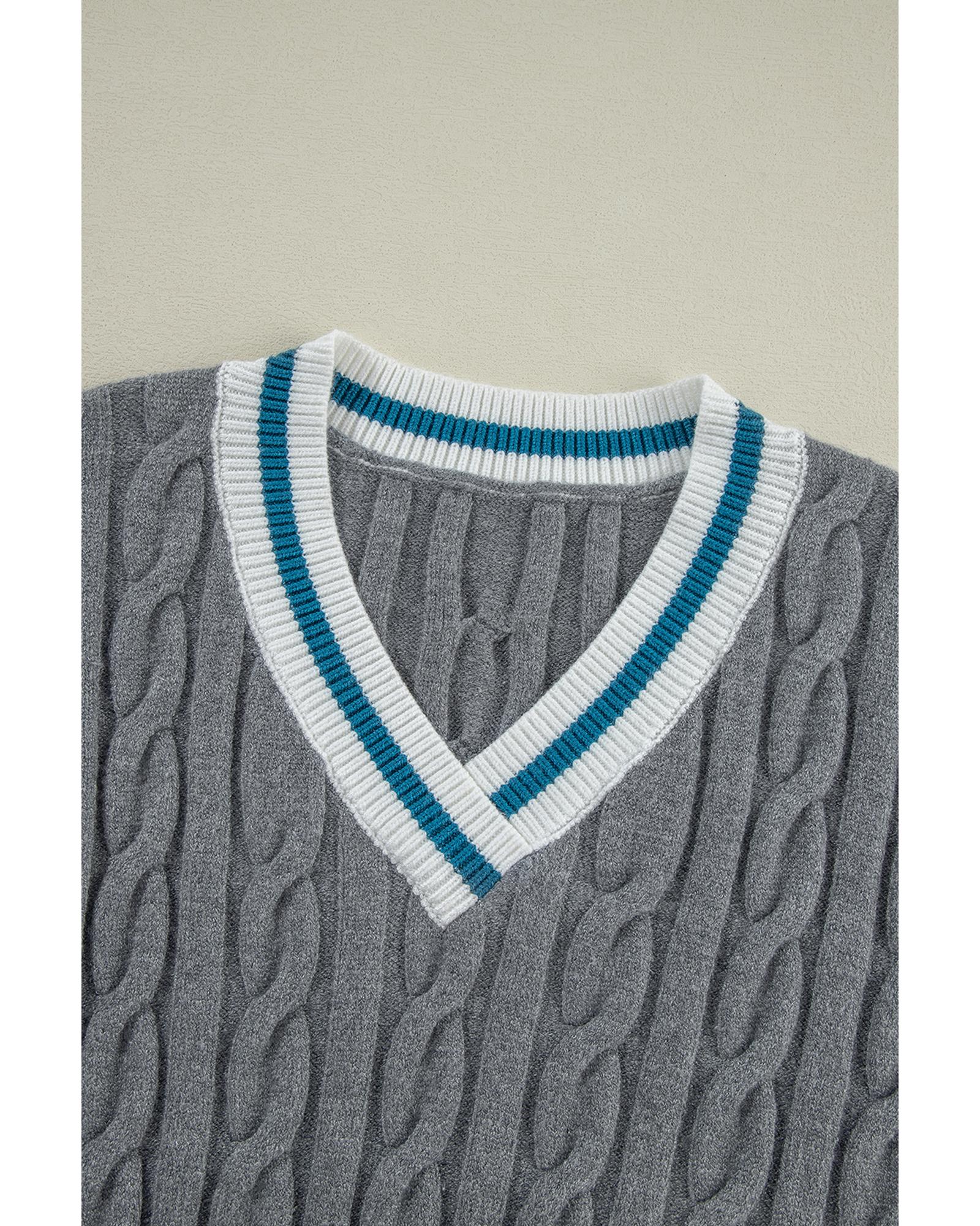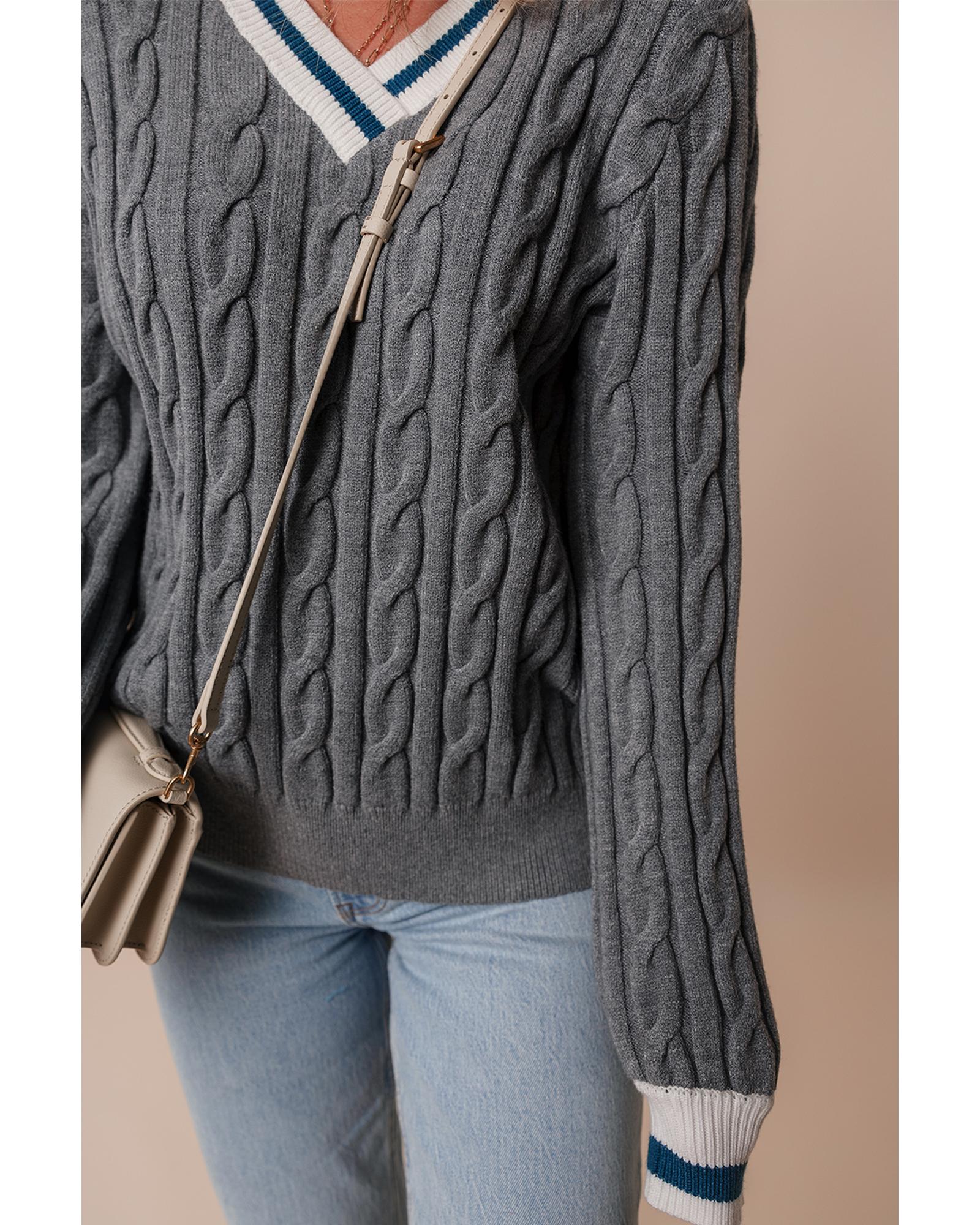 Medium Grey Color Contrast Ribbed Edge Cable Knit V Neck Sweater - 2XL