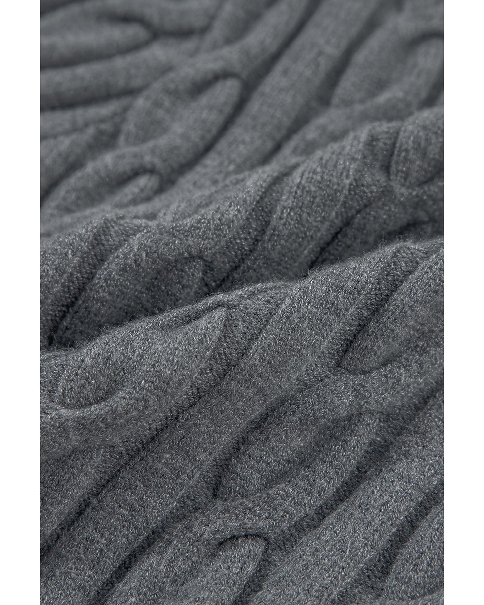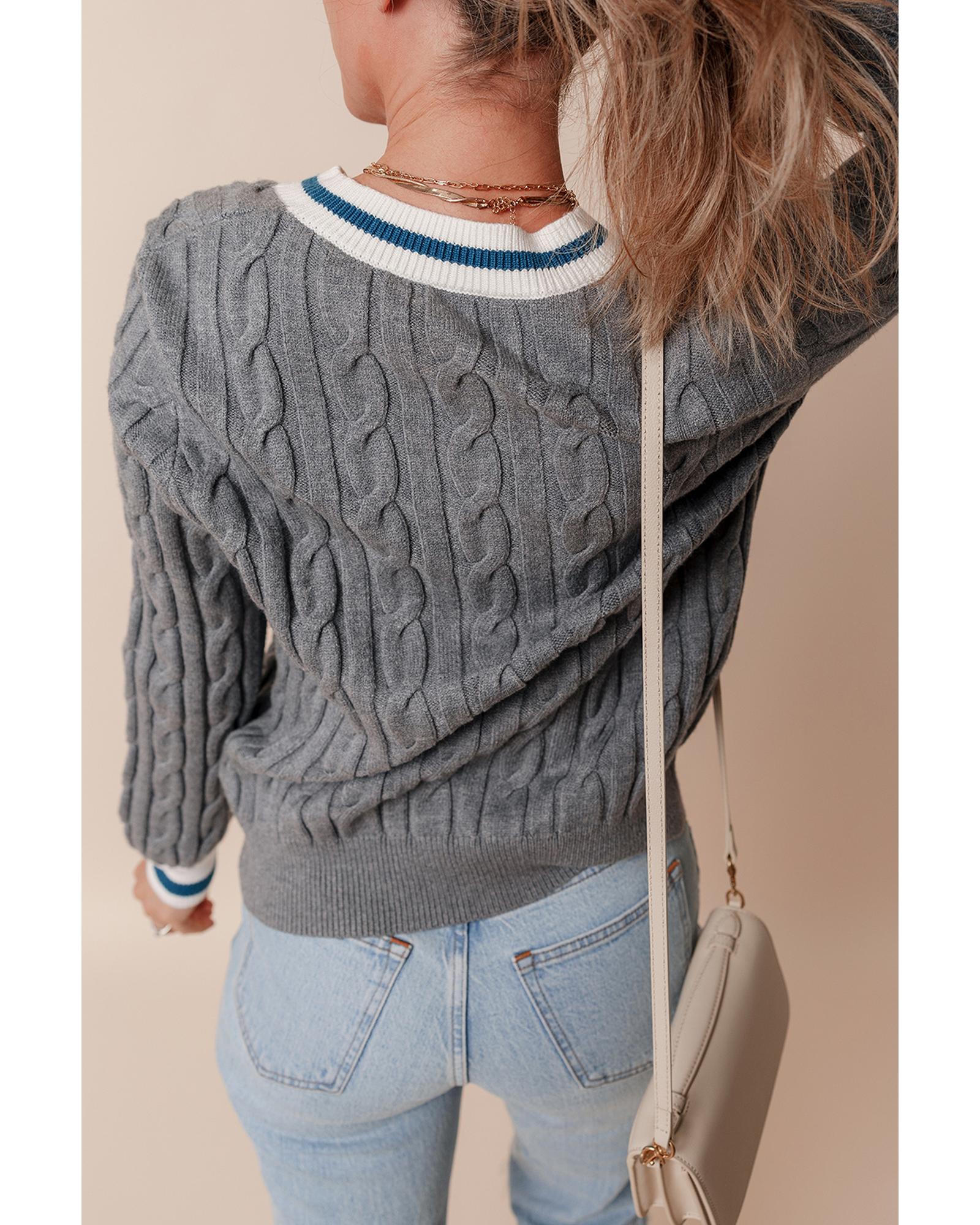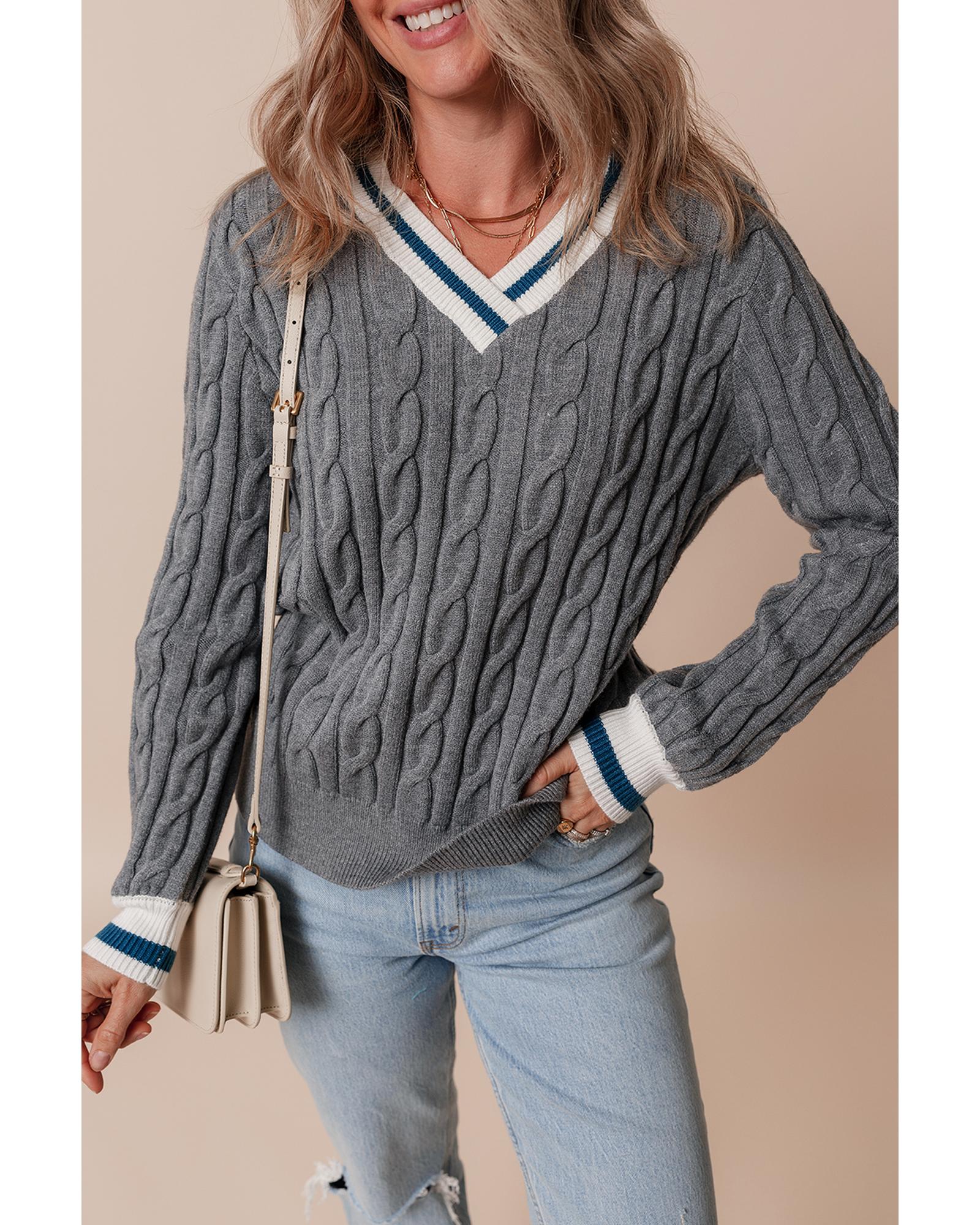 Medium Grey Color Contrast Ribbed Edge Cable Knit V Neck Sweater - 2XL