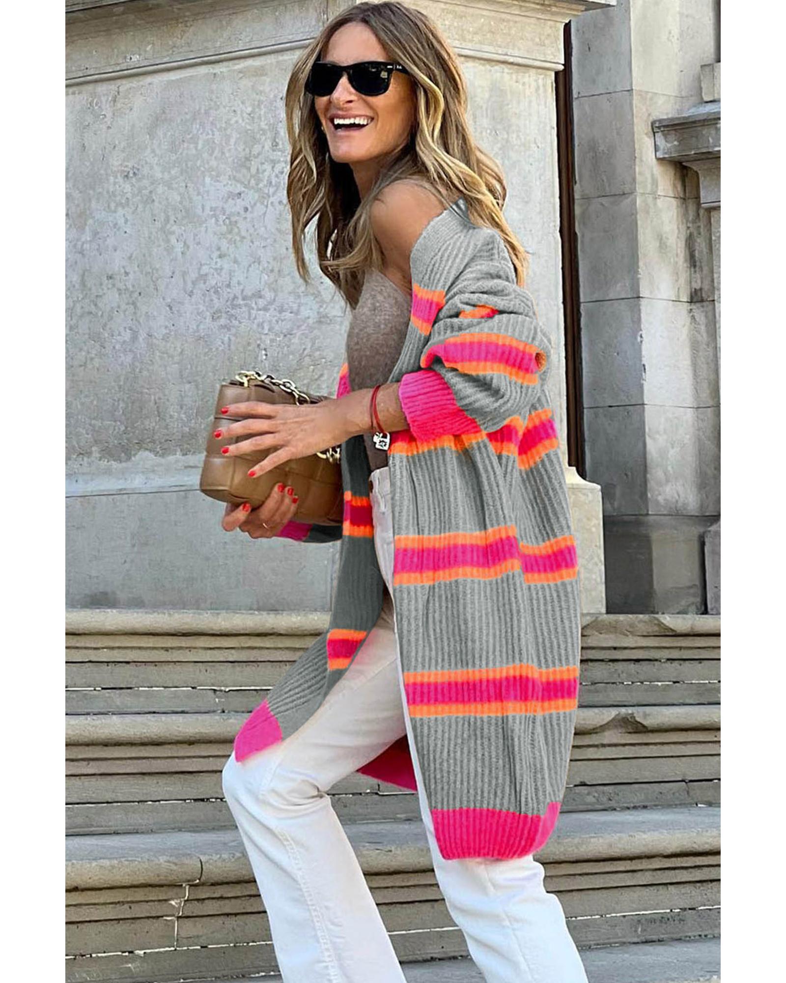Medium Grey Stripe Printed Ribbed Long Knitted Cardigan - M