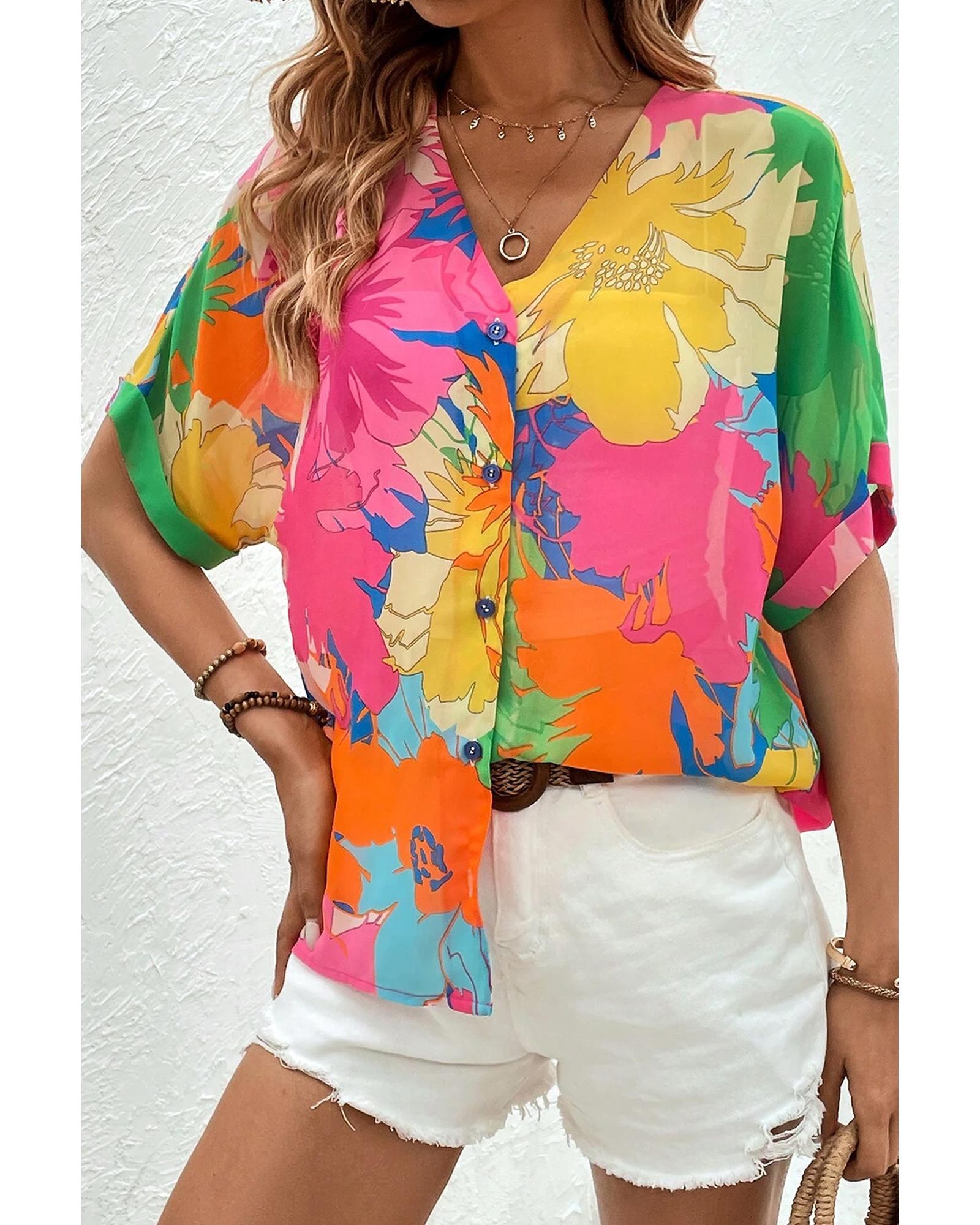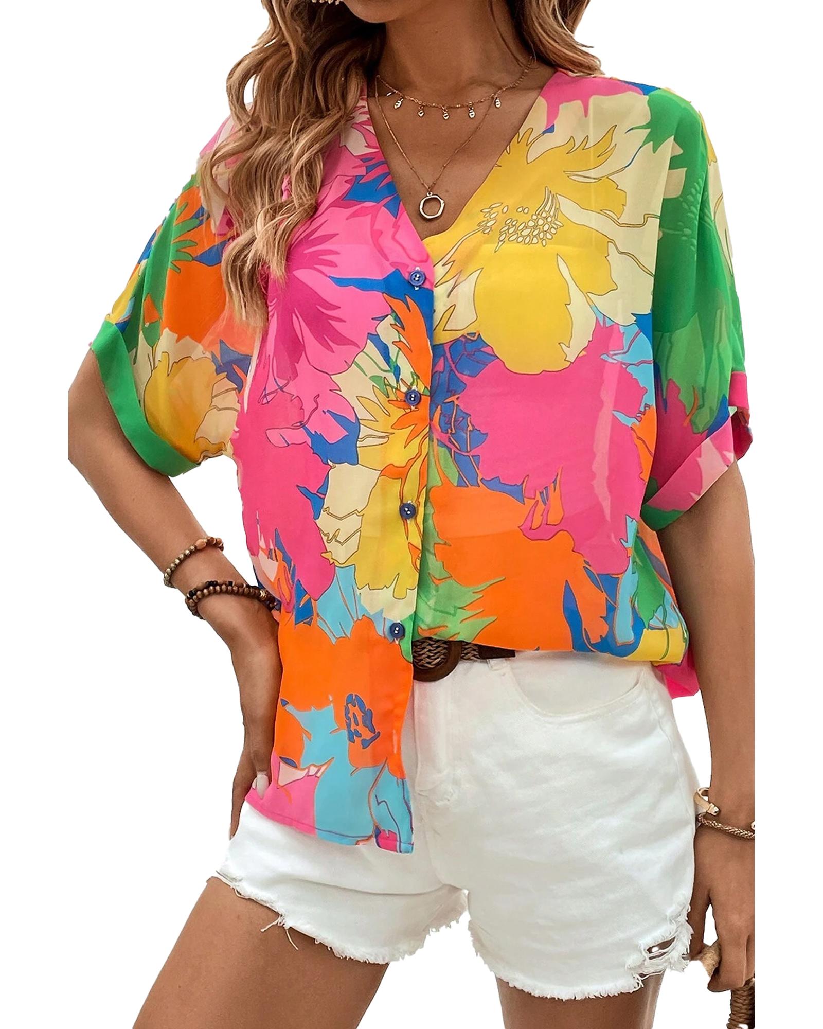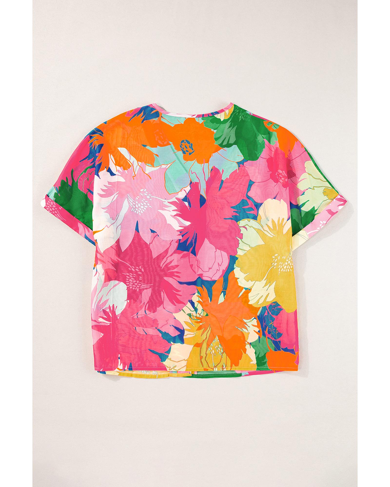 Multicolour Floral Print Folded Short Sleeve Shirt - M