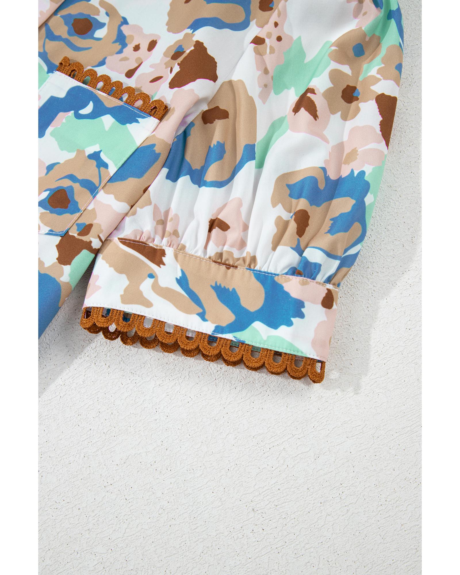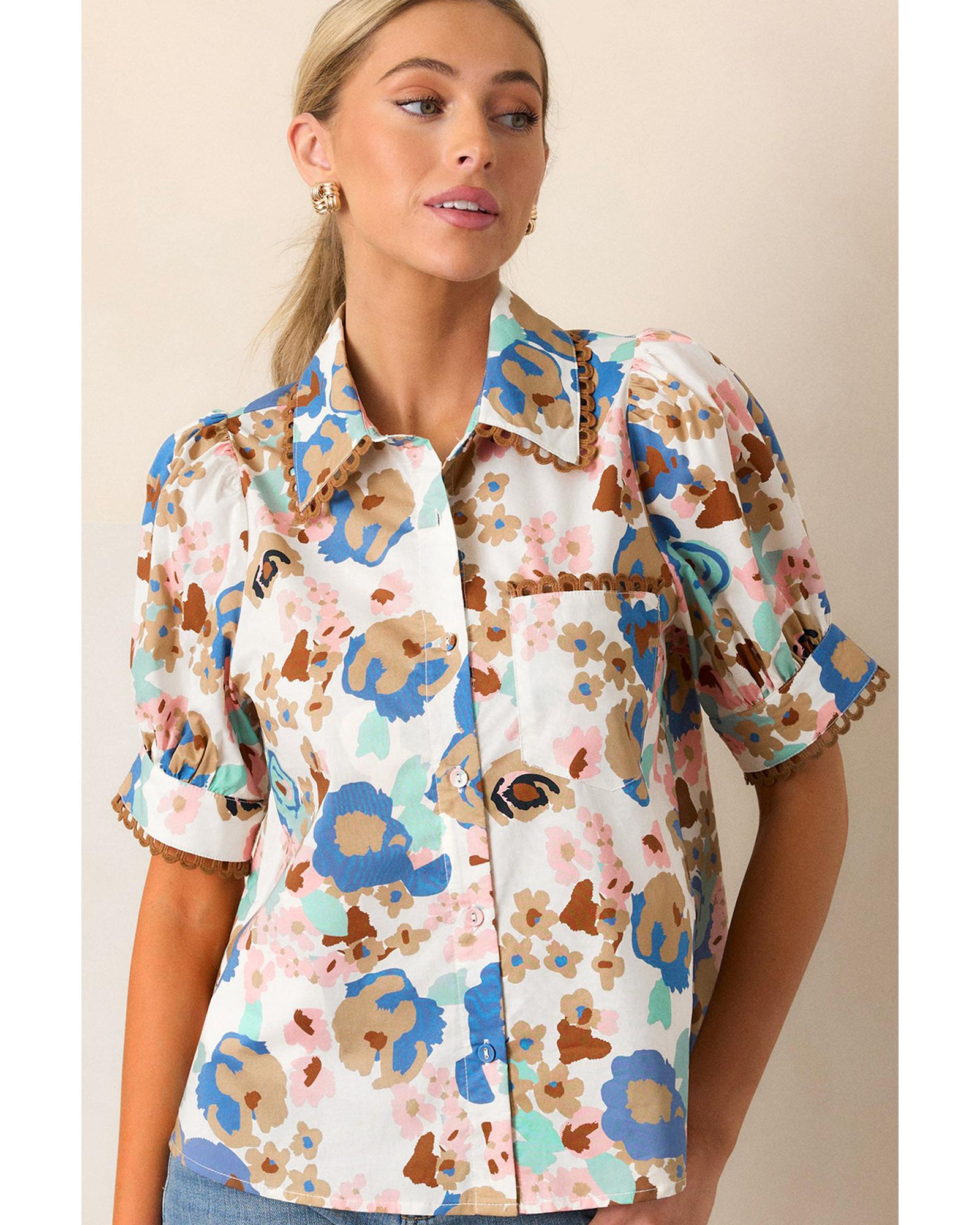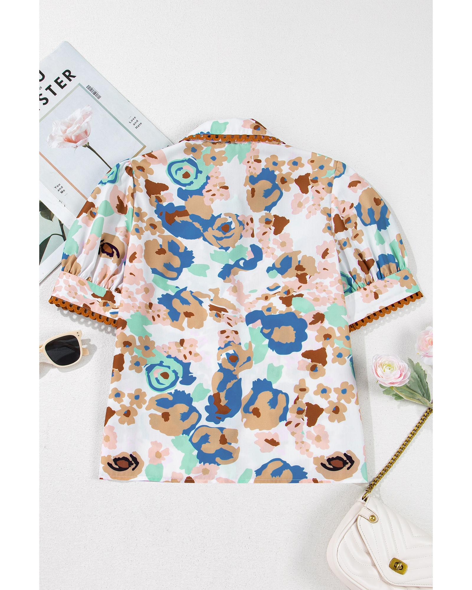 Multicolour Floral Print Ricrac Trim Collared Puff Short Sleeve Shirt - XL