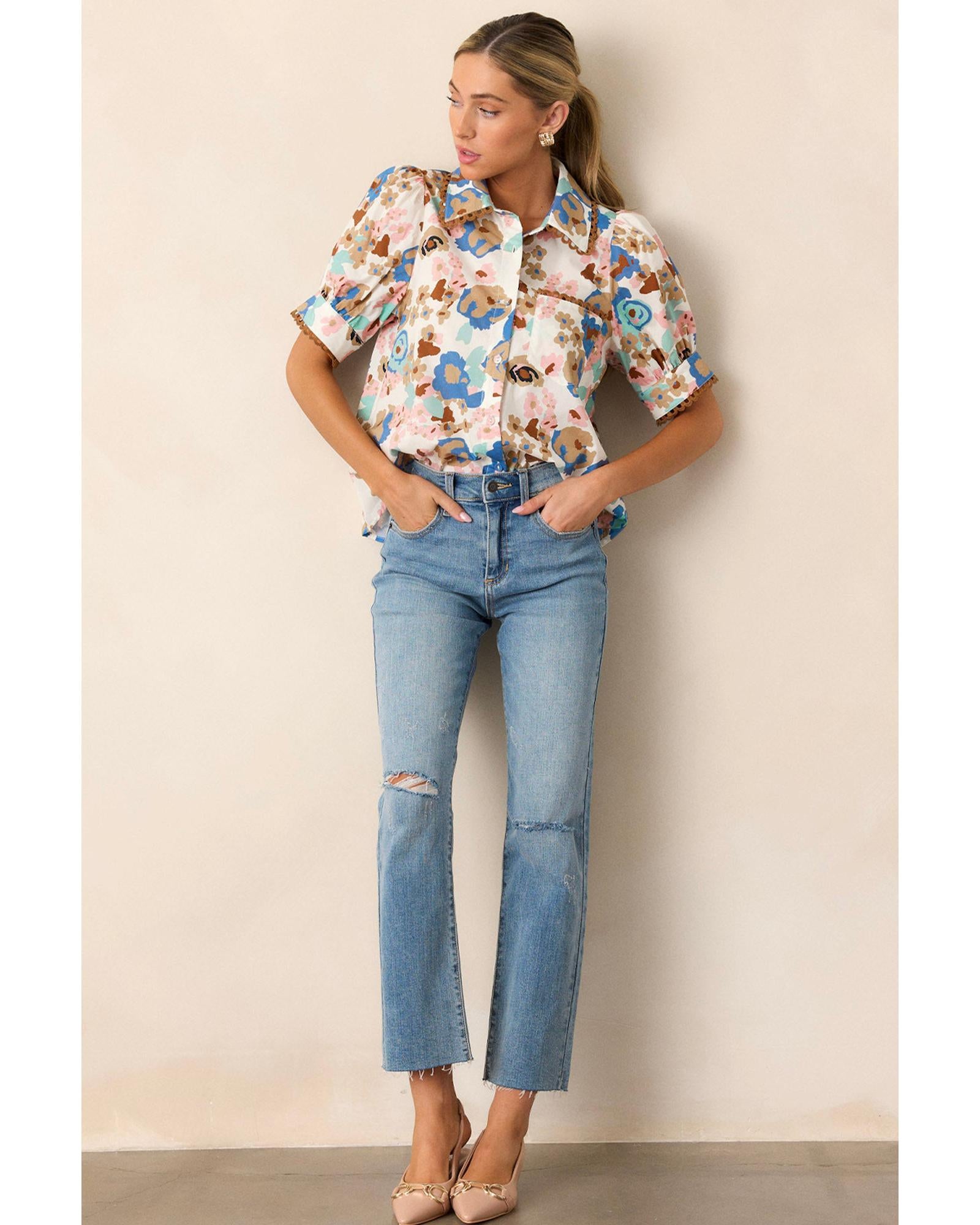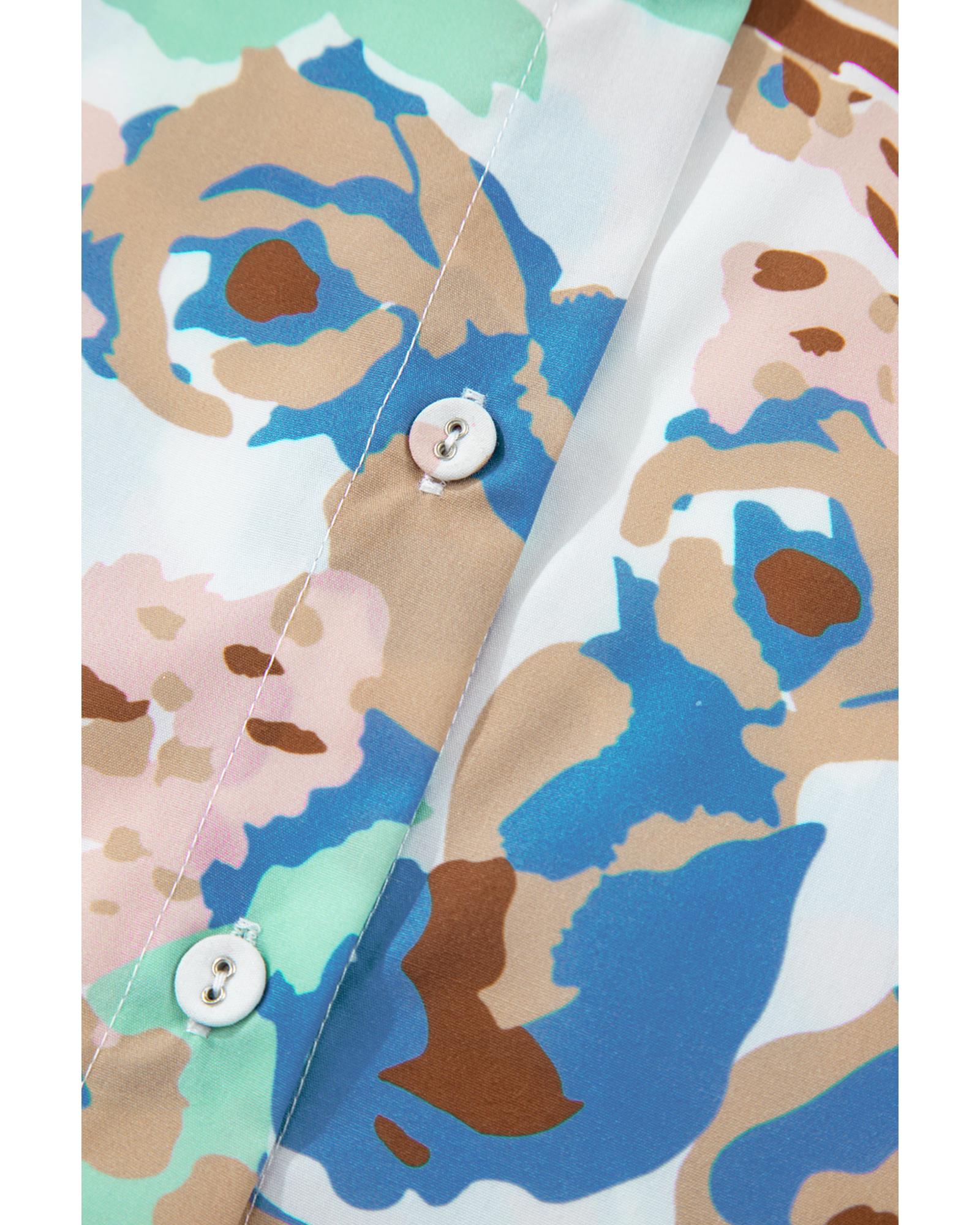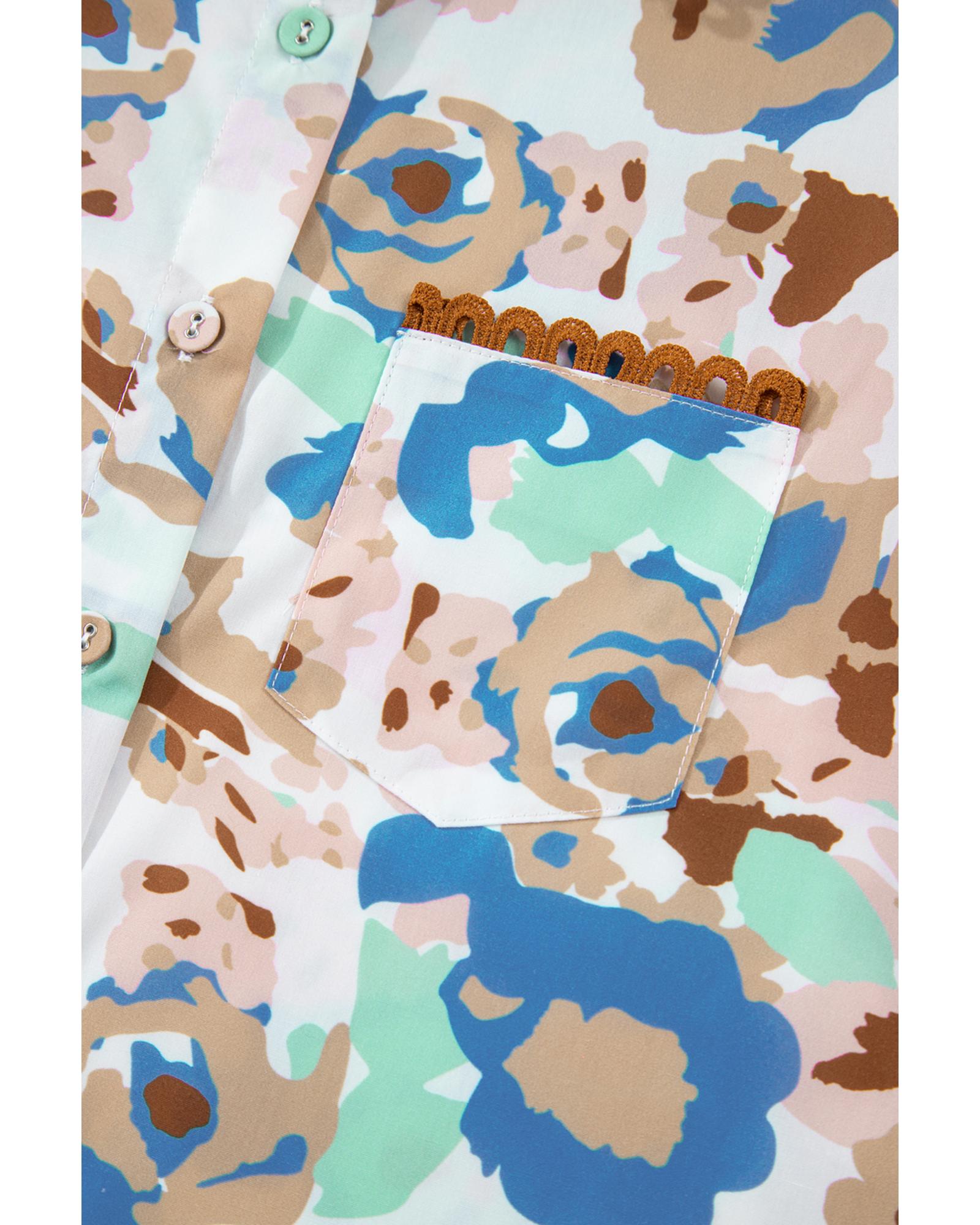 Multicolour Floral Print Ricrac Trim Collared Puff Short Sleeve Shirt - XL