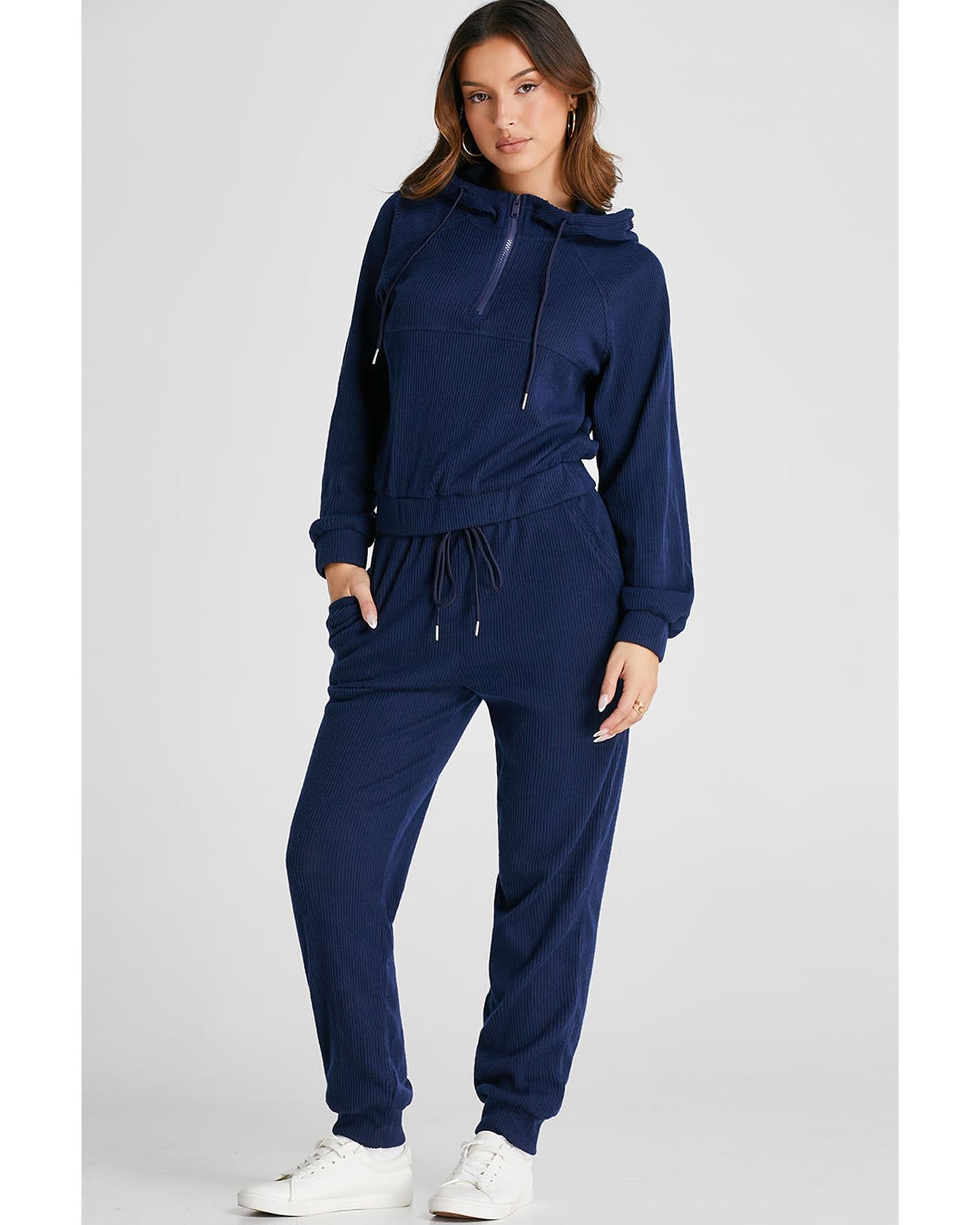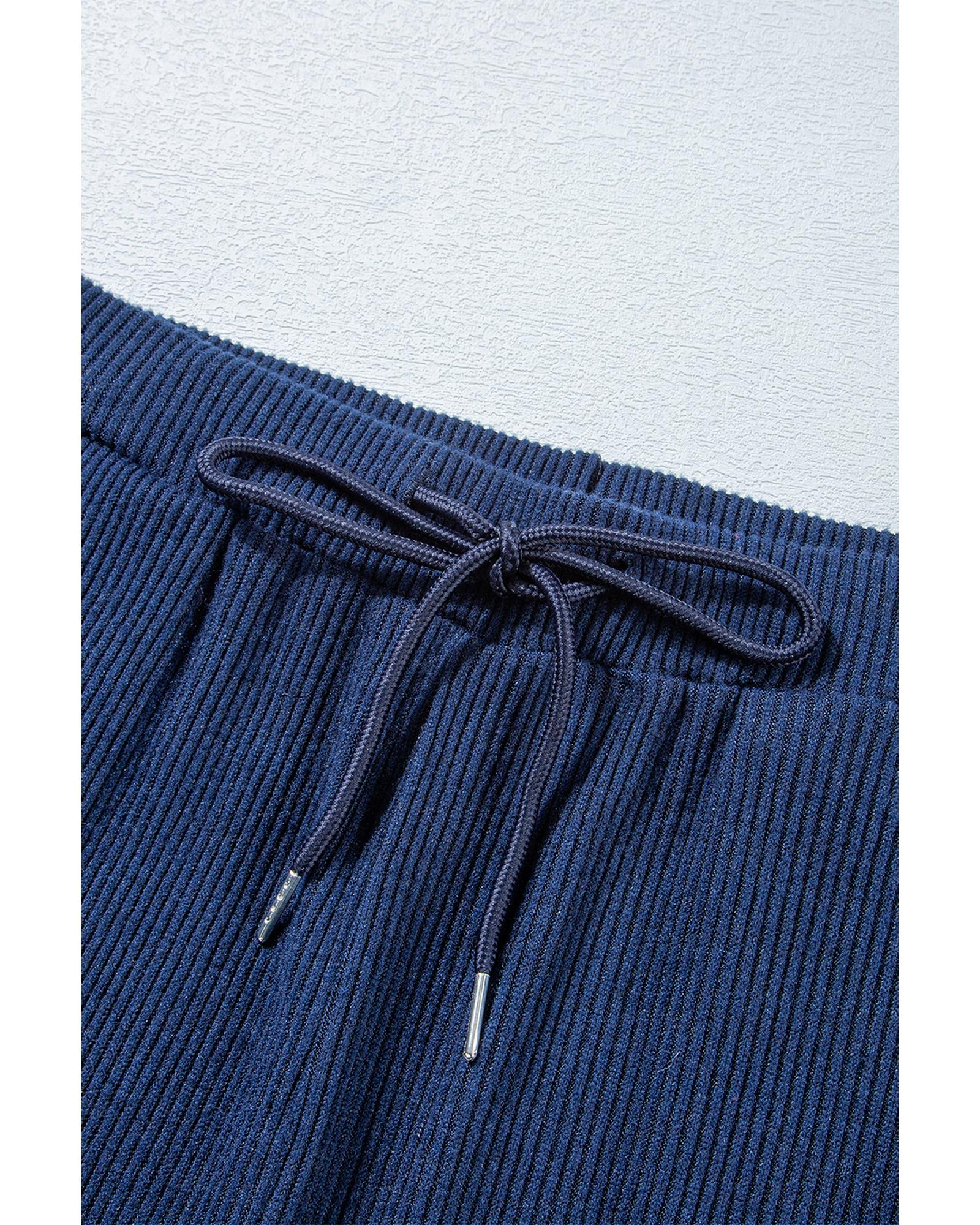 Navy Blue Ribbed Knit Cropped Hoodie and Drawstring Joggers Set - S