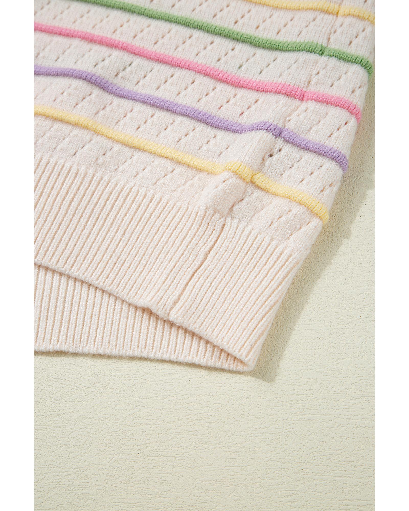 Oatmeal Colorful Striped Eyelet Knit Ruffled Sleeve Sweater T Shirt - L