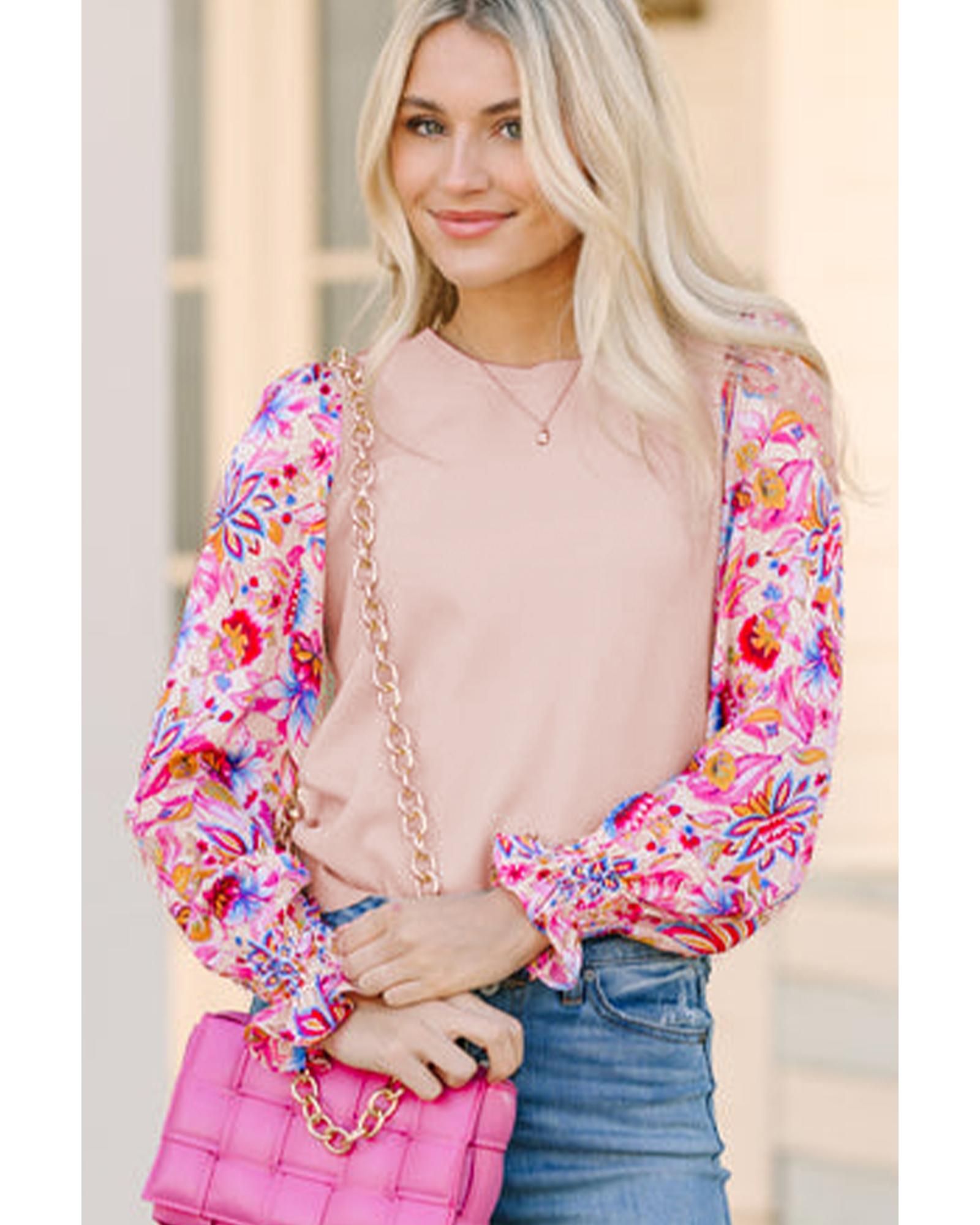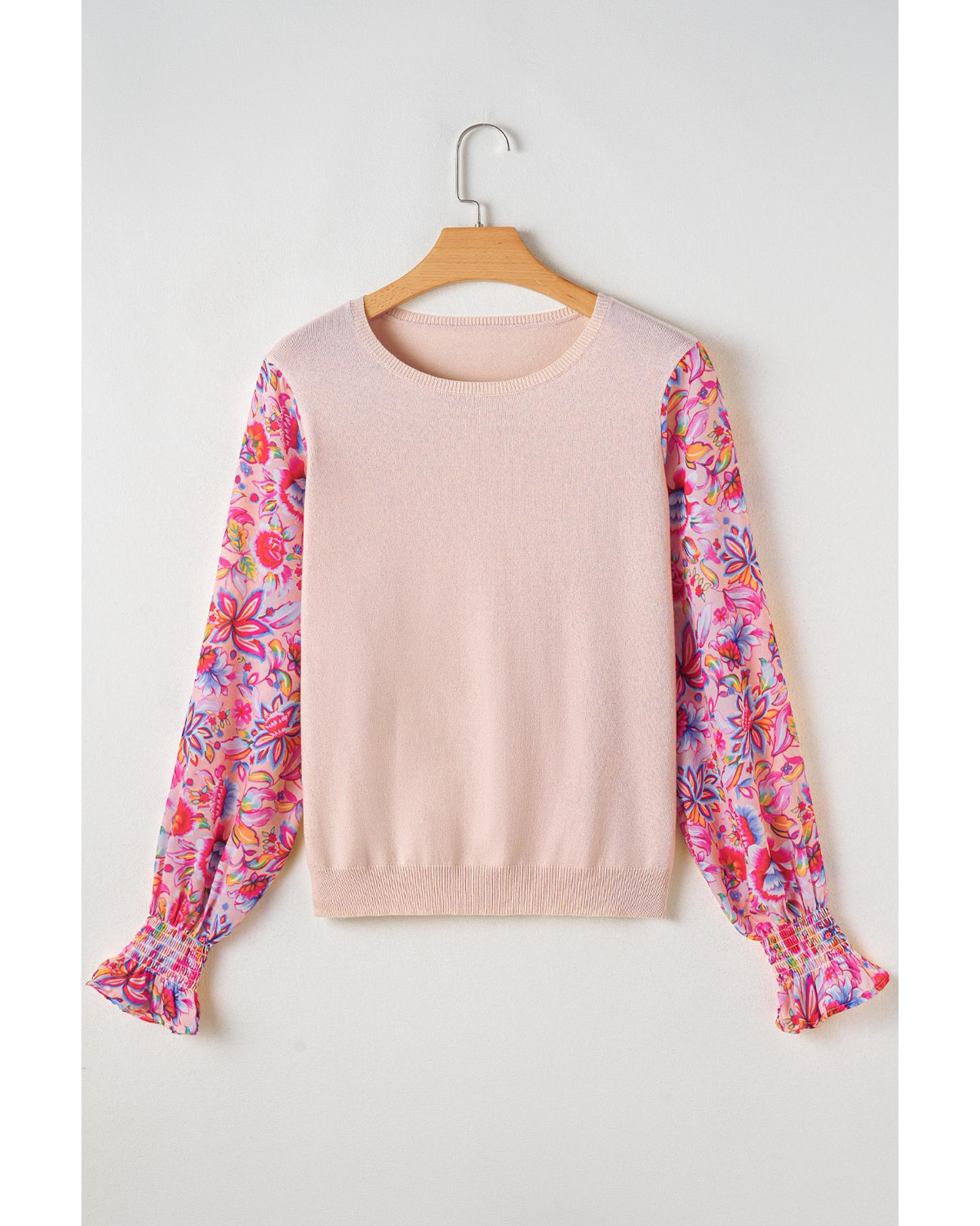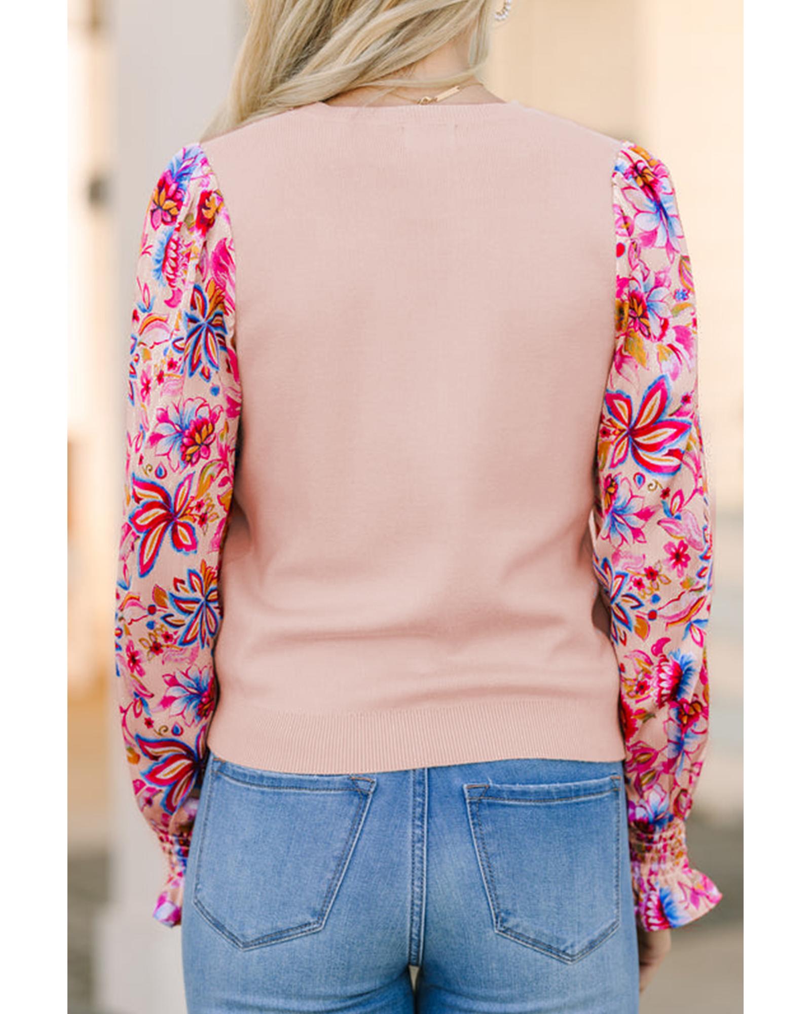 Oatmeal Floral Printed Patchwork Smocked Lantern Sleeve Knit Top - XL