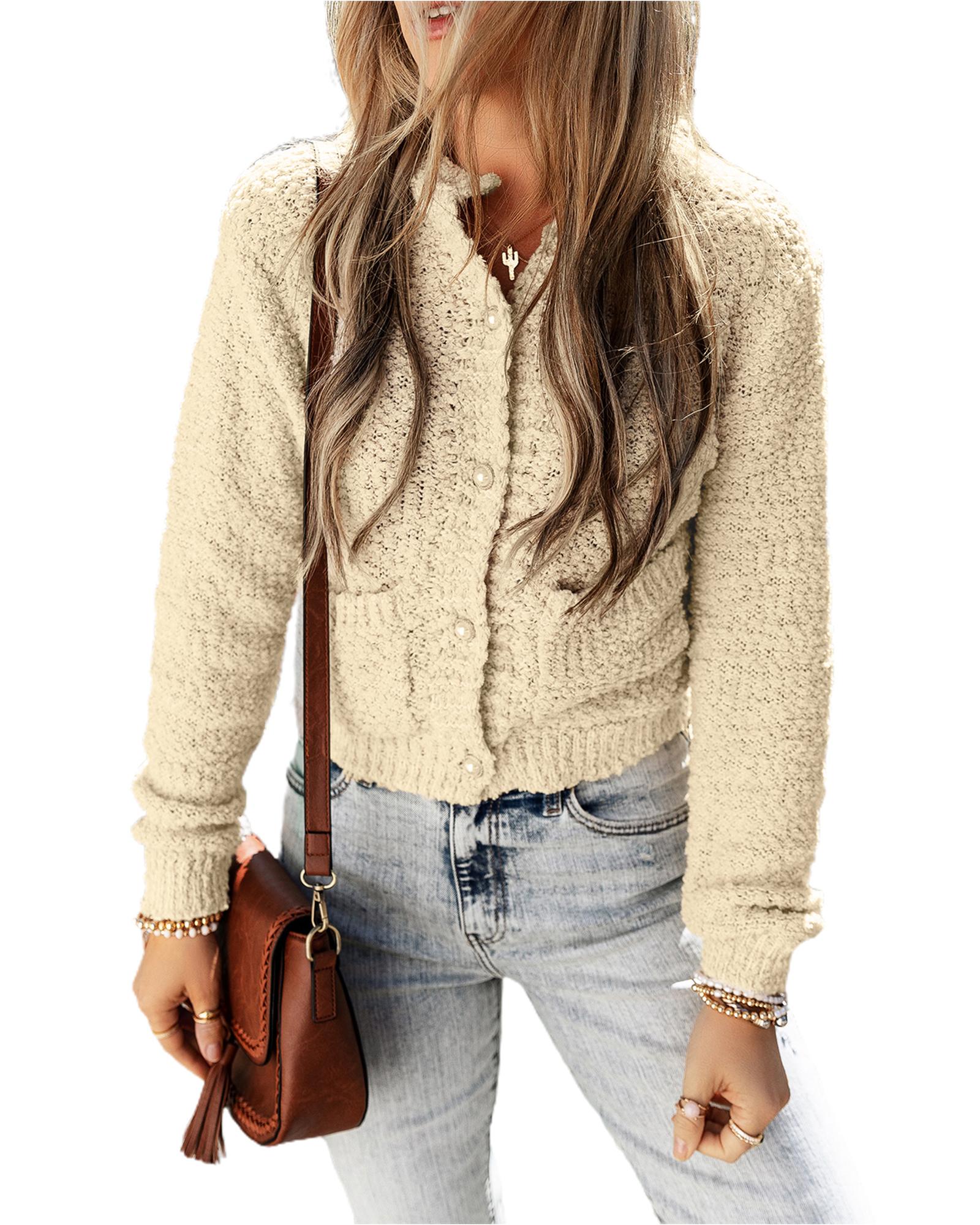 Oatmeal Pearl Buttons Popcorn Textured Sweater Cardigan - S