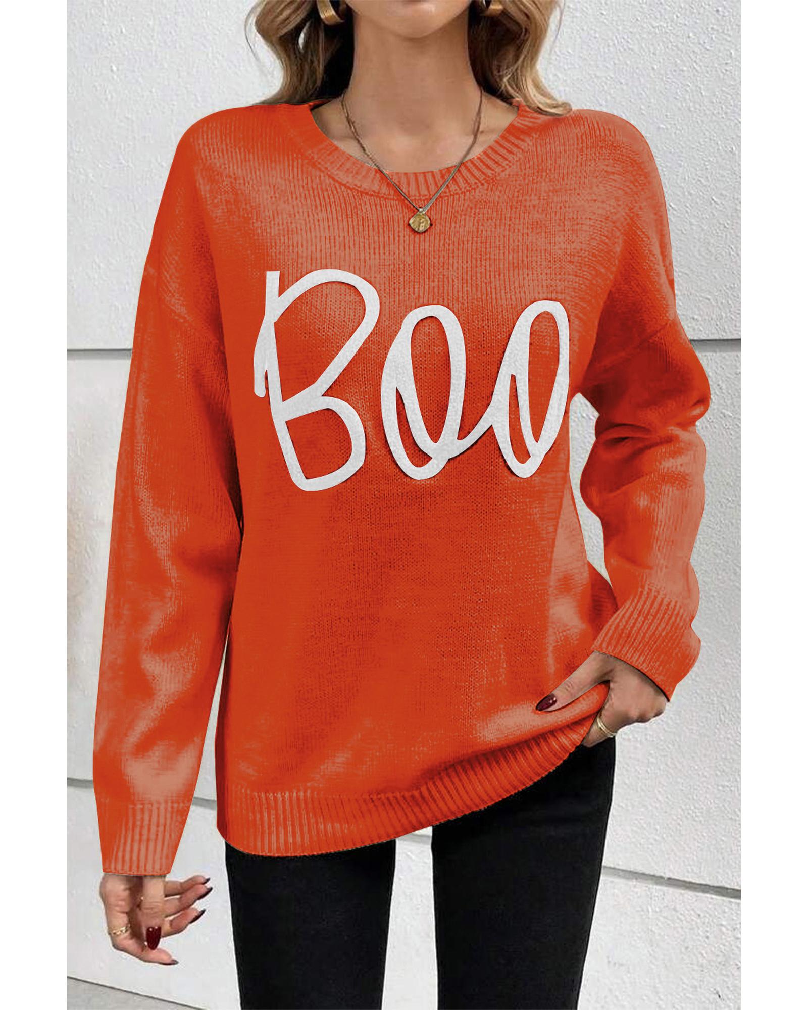Orange Boo Knitted Pattern Ribbed Edge Drop Shoulder Sweater - M