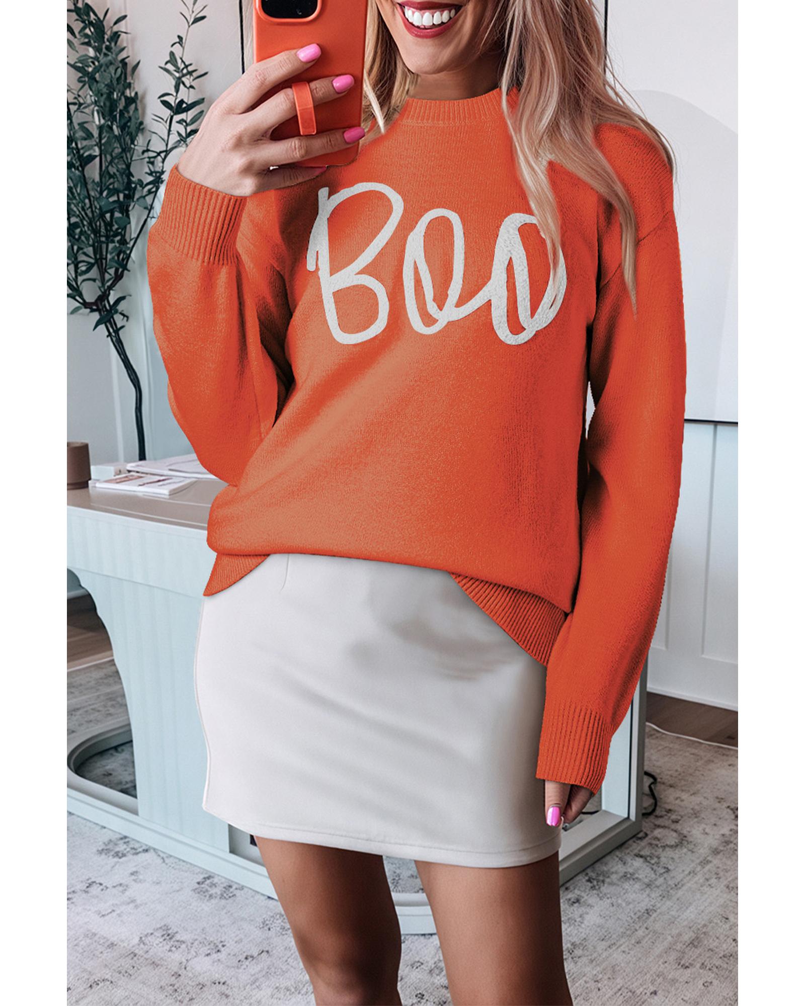 Orange Boo Knitted Pattern Ribbed Edge Drop Shoulder Sweater - XL