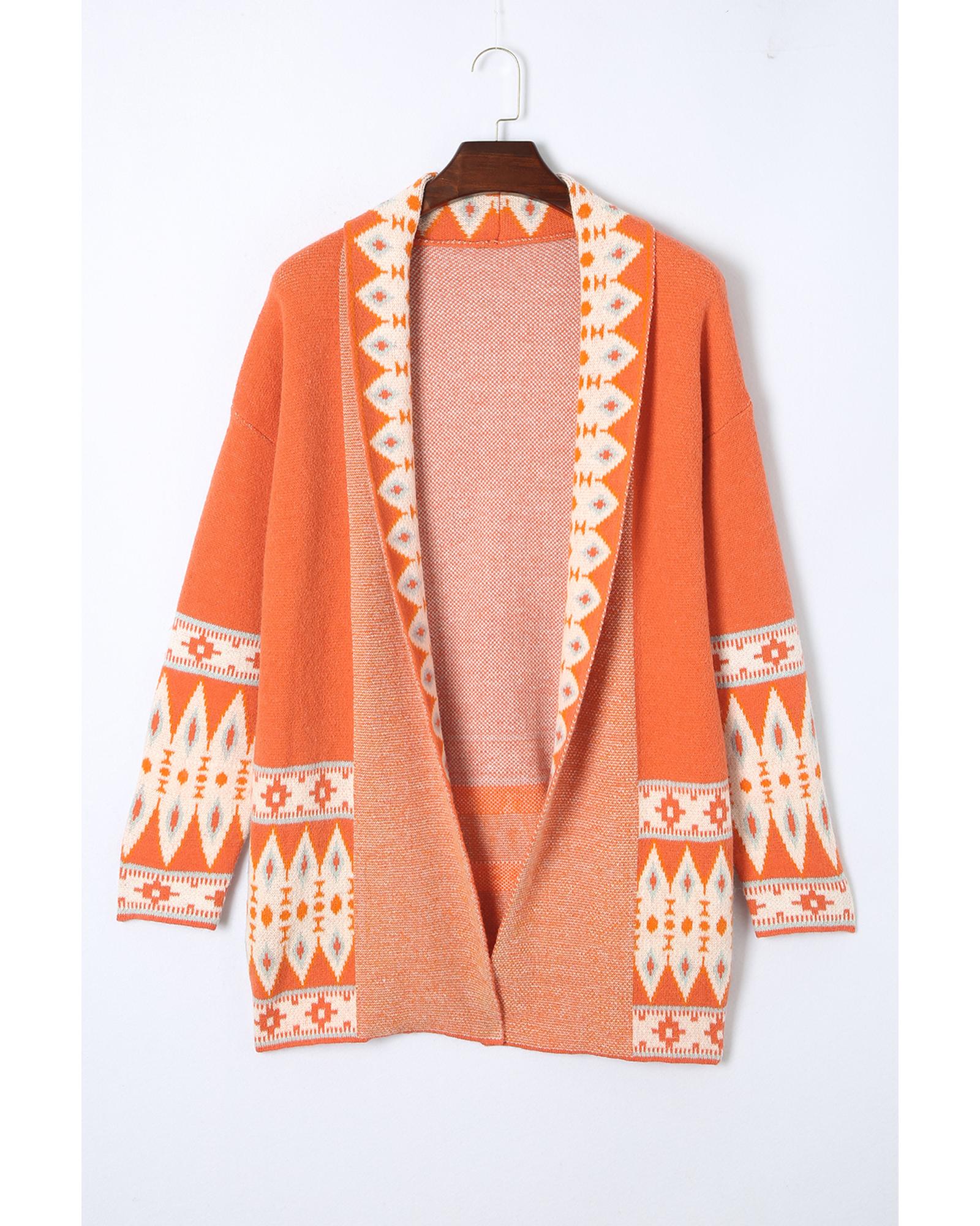 Orange Printed Aztec Print Open Front Knitted Cardigan - L