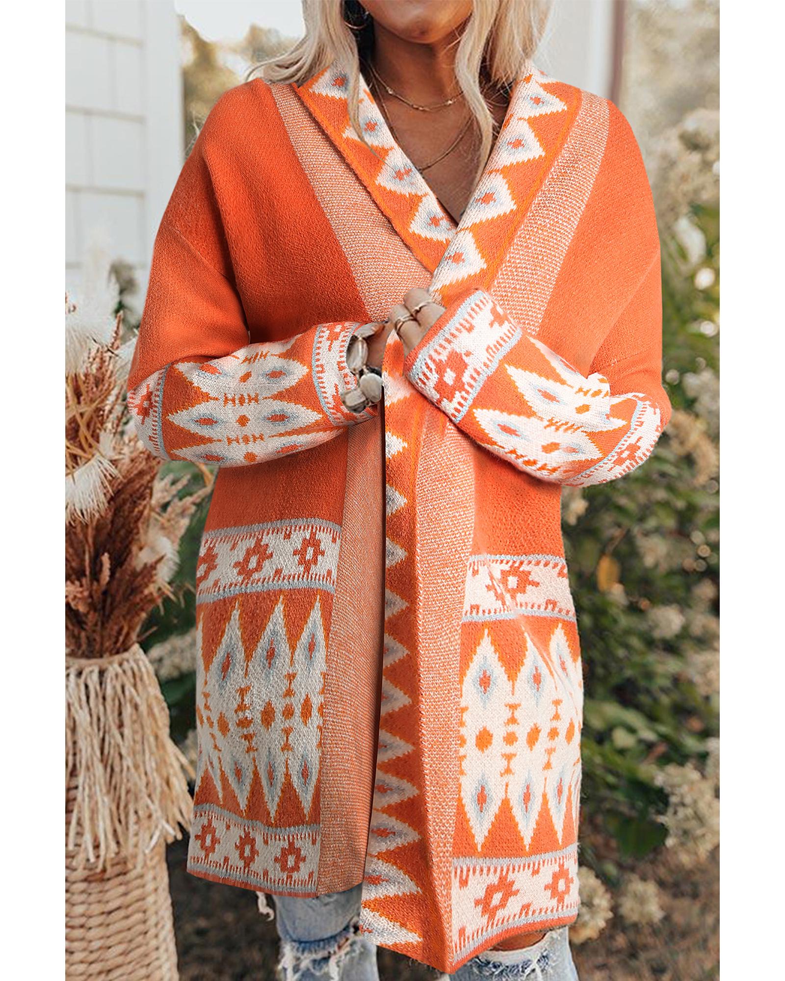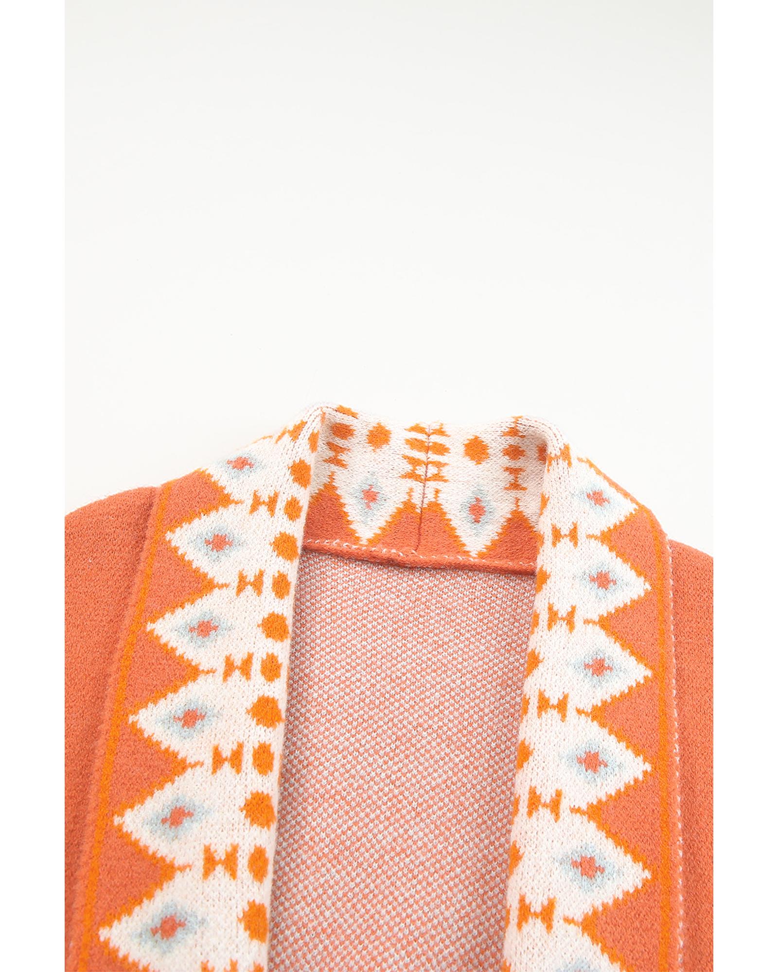 Orange Printed Aztec Print Open Front Knitted Cardigan - M