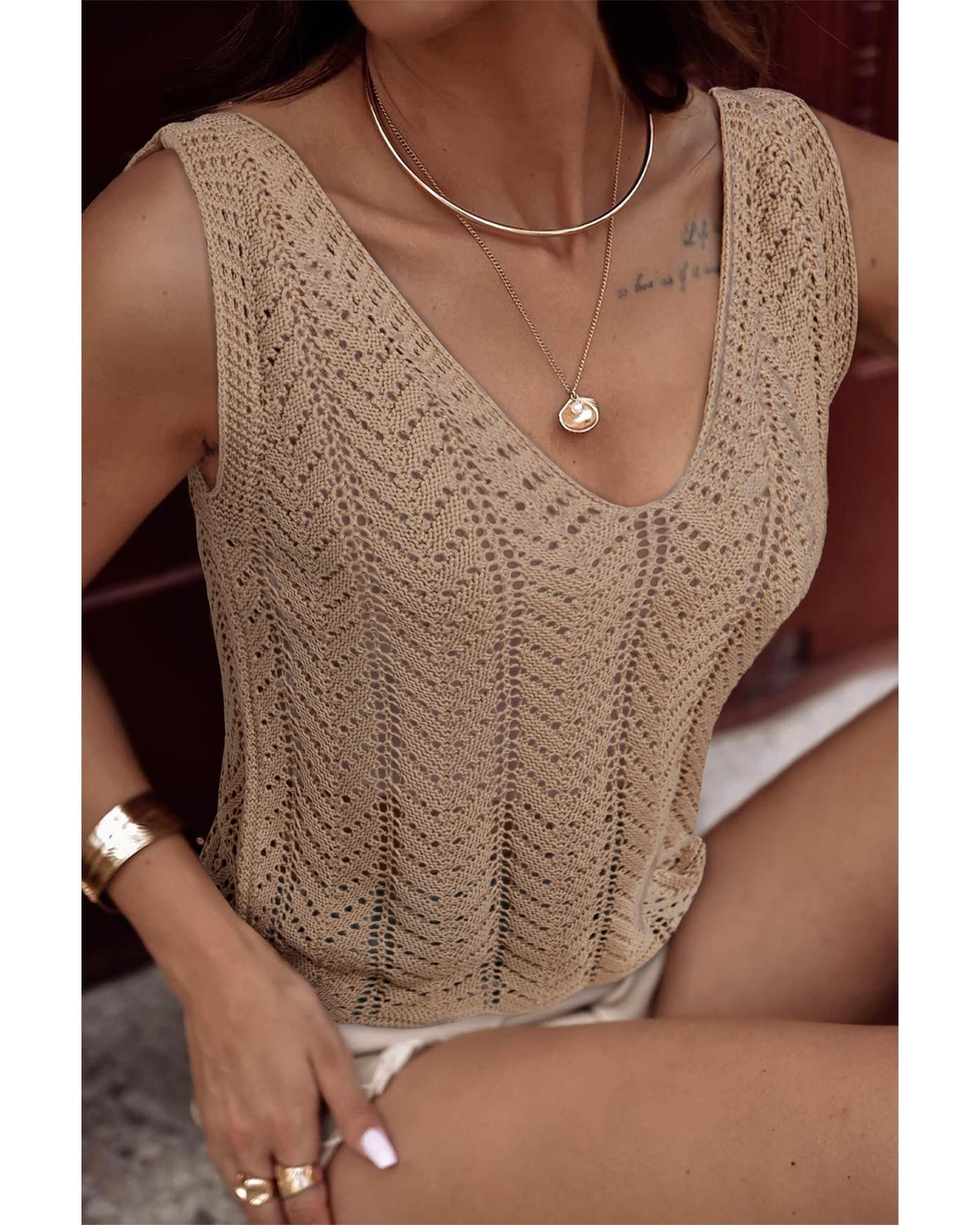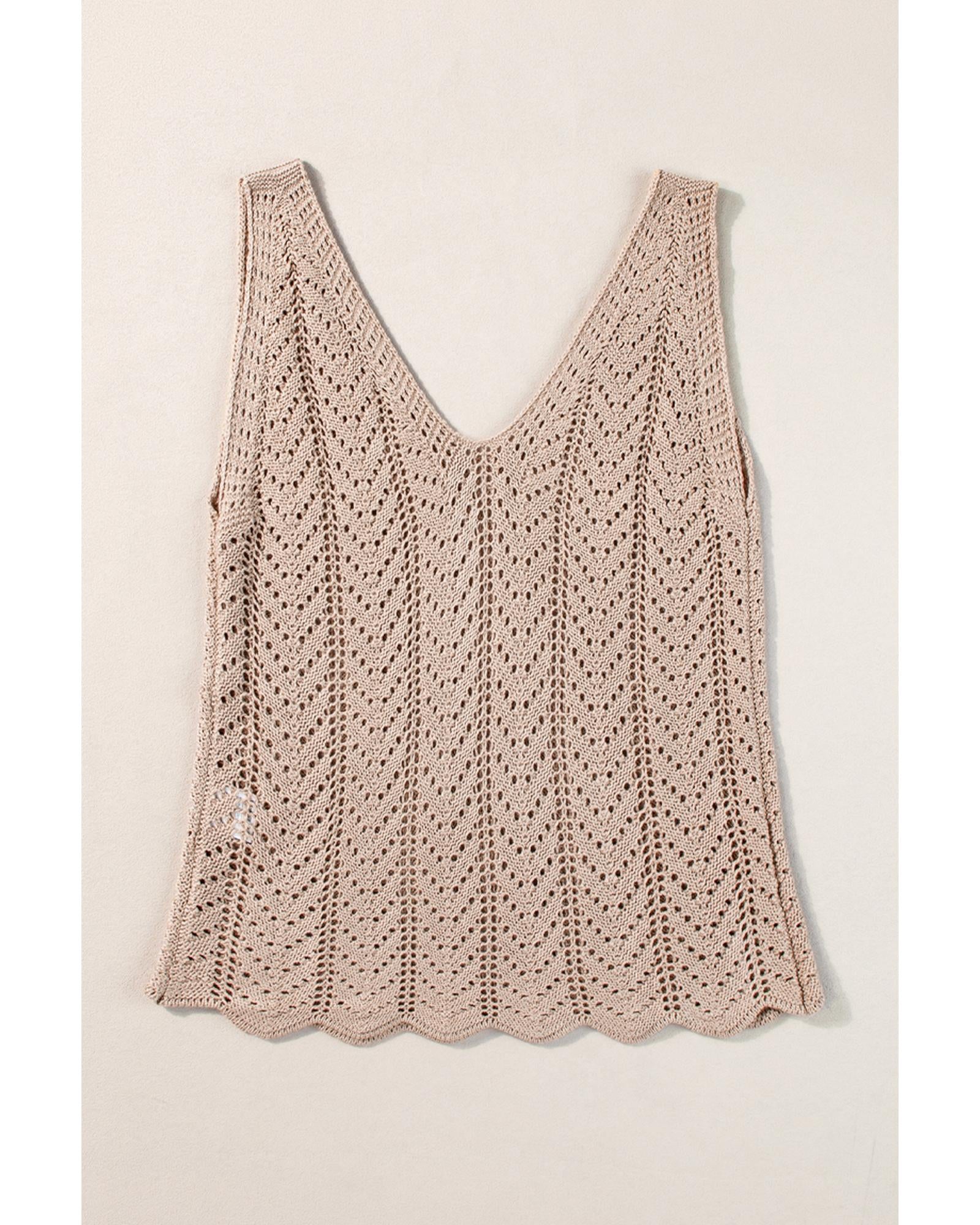 Pale Khaki Scalloped Hem V Neck Crochet Knit Vest - L