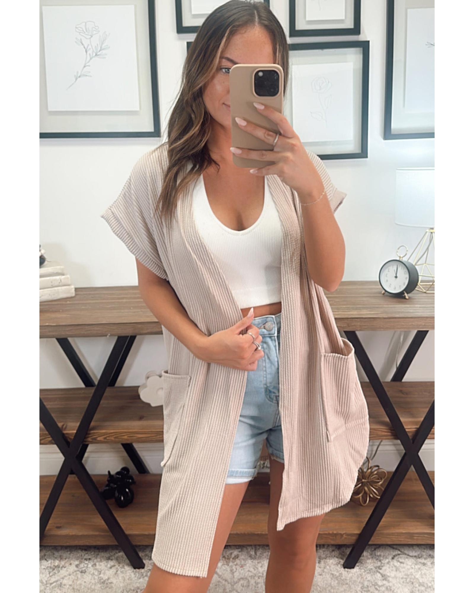 Parchment Ribbed Pocketed Short Sleeve Open Front Top - L