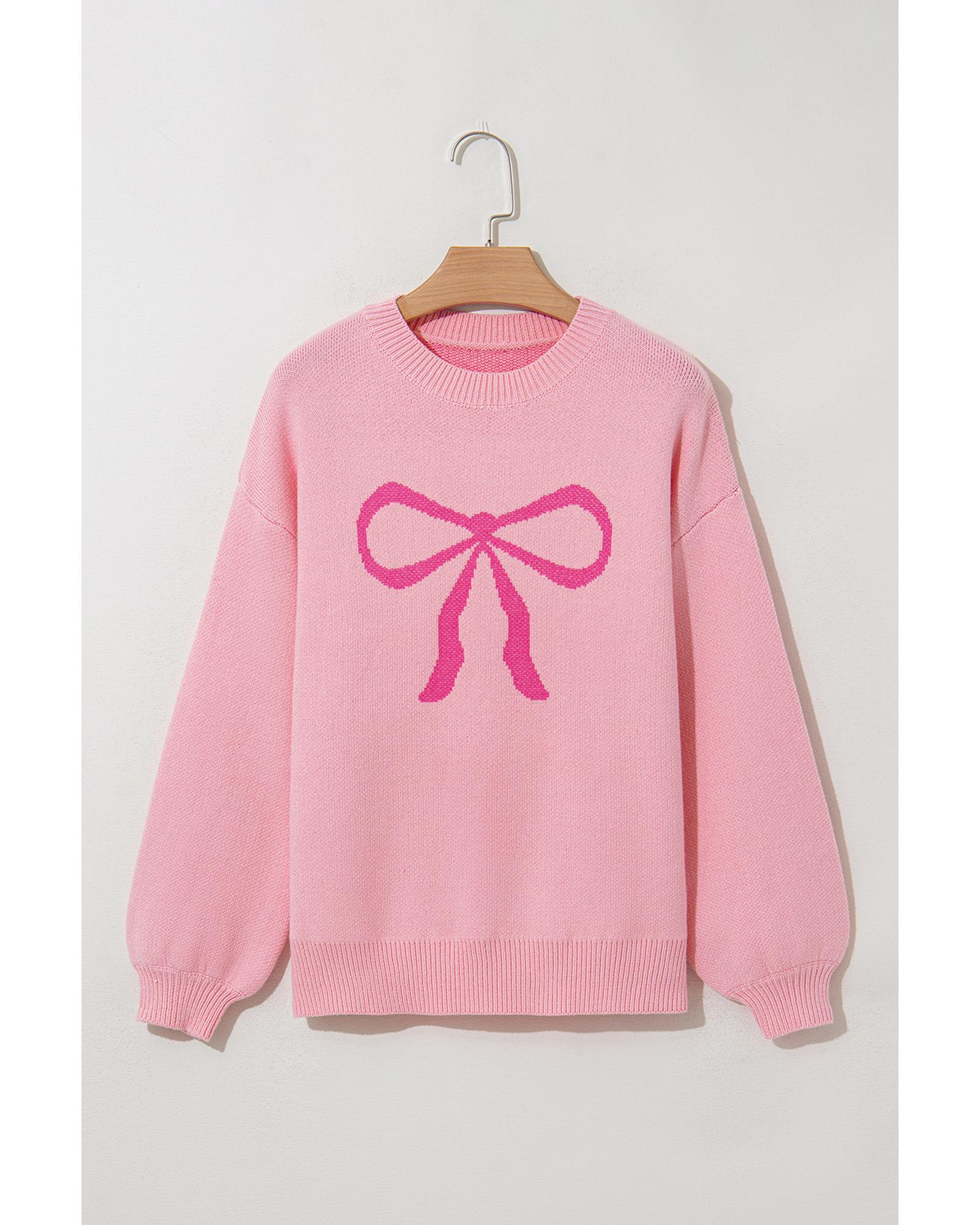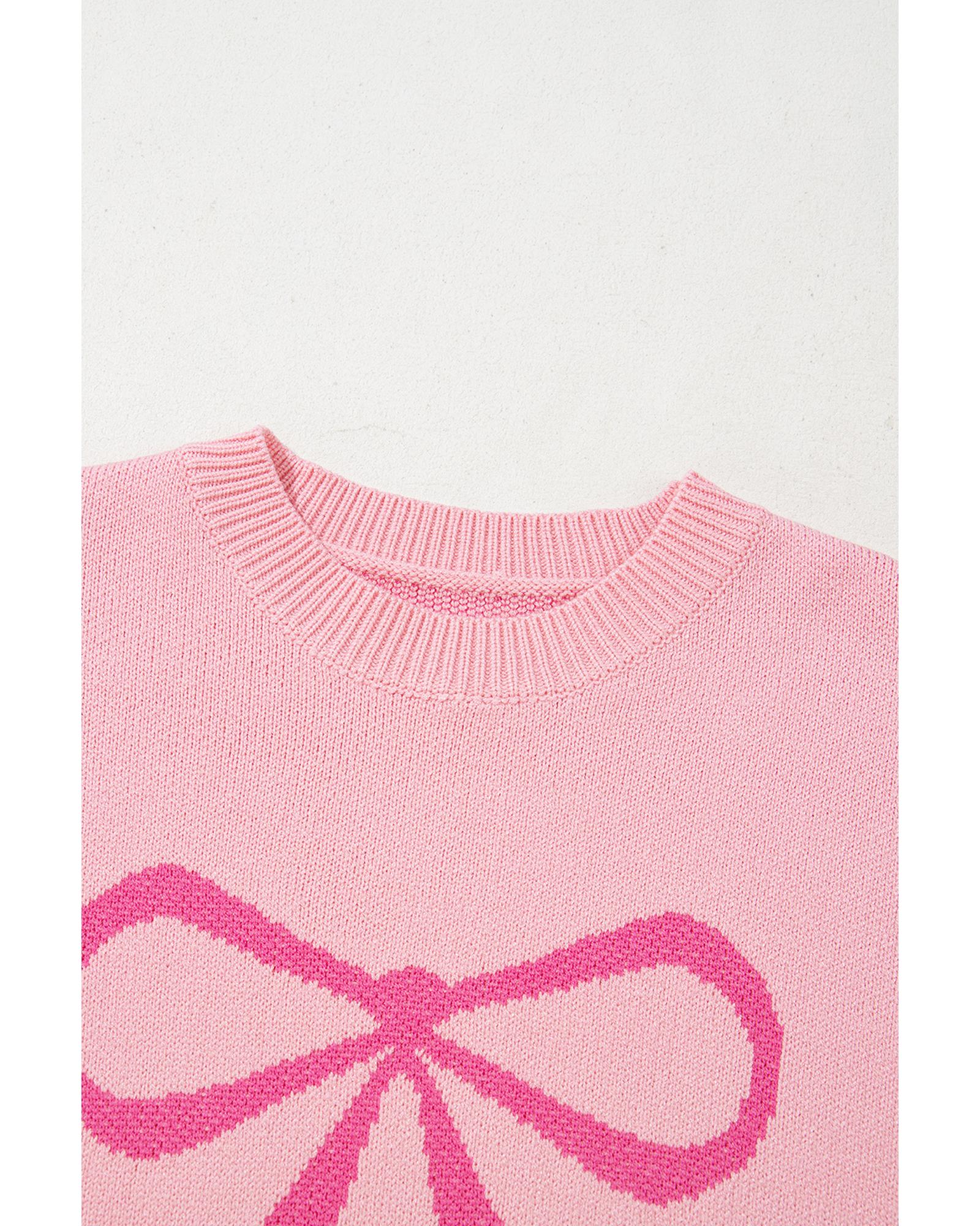 Pink Bow Graphic Drop Shoulder Round Neck Sweater - L