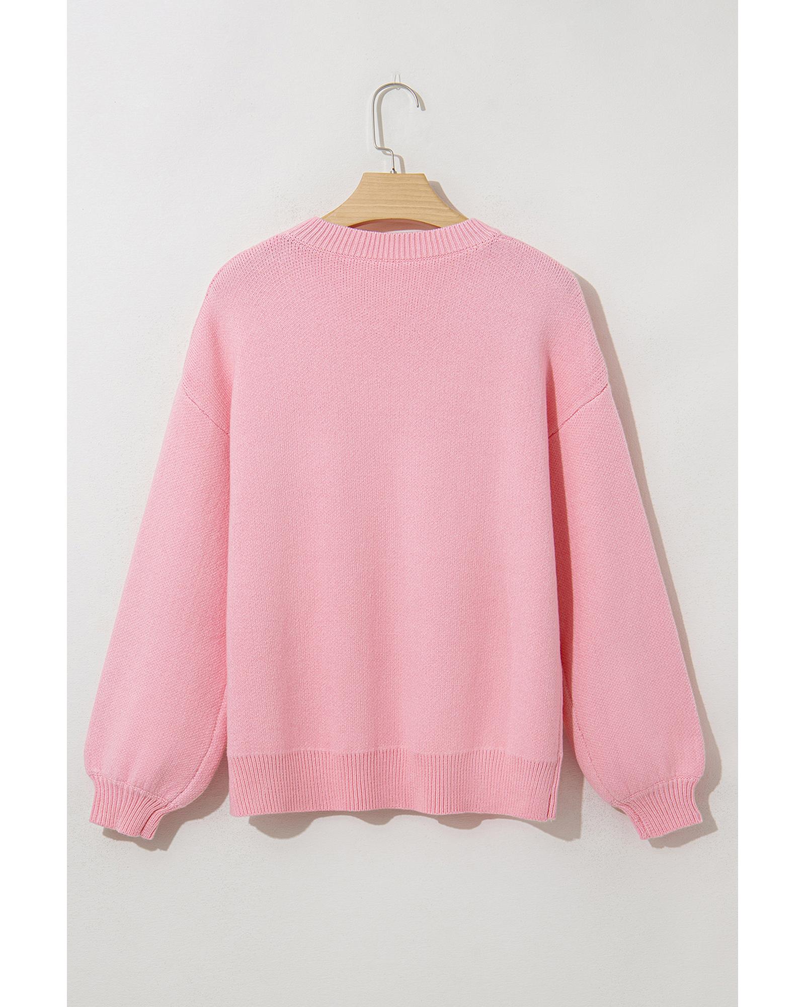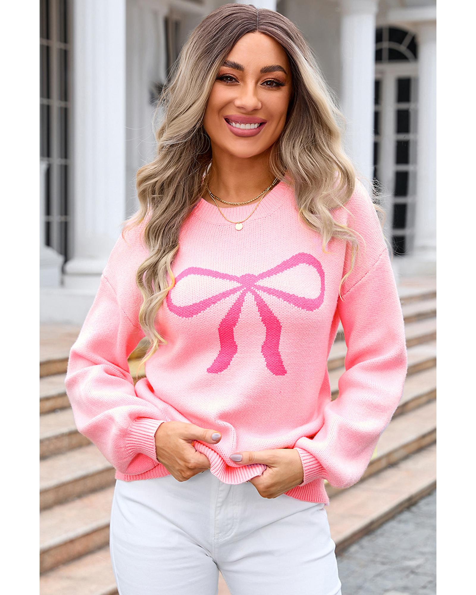 Pink Bow Graphic Drop Shoulder Round Neck Sweater - S