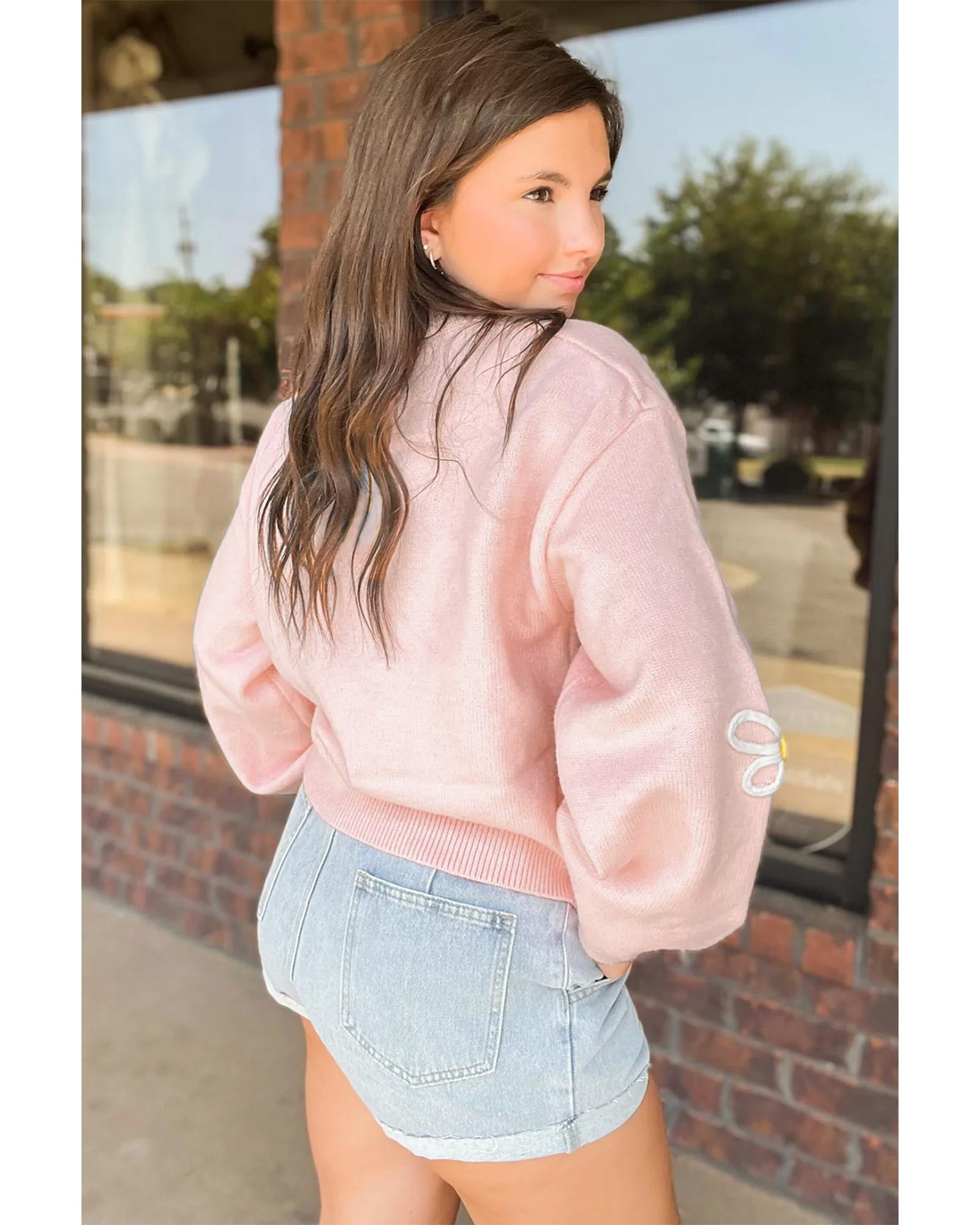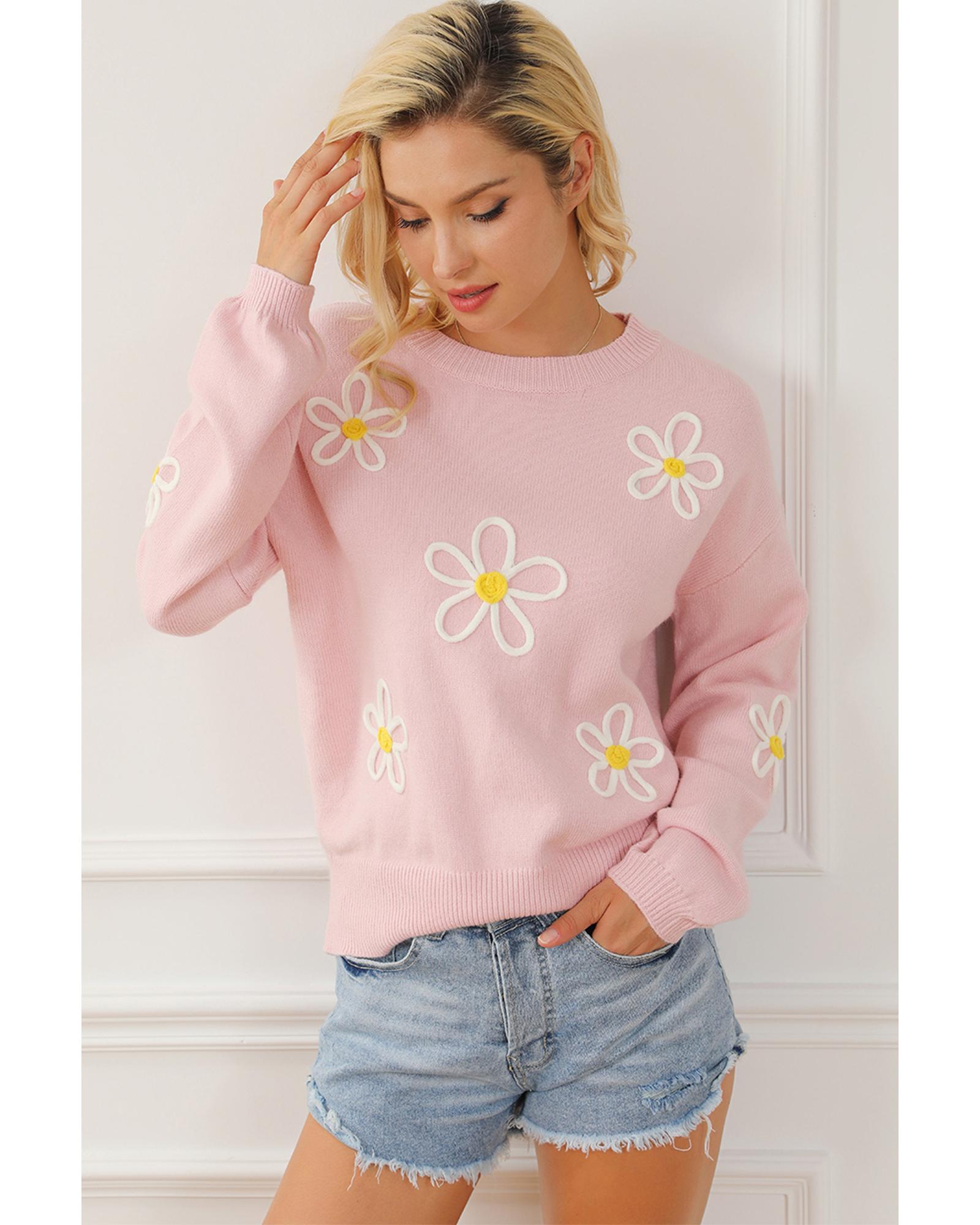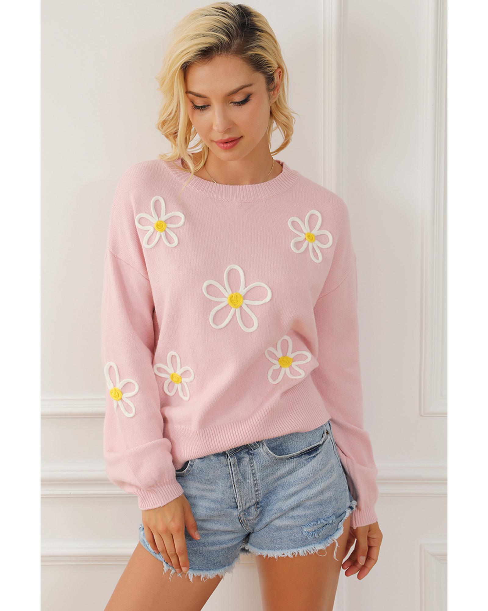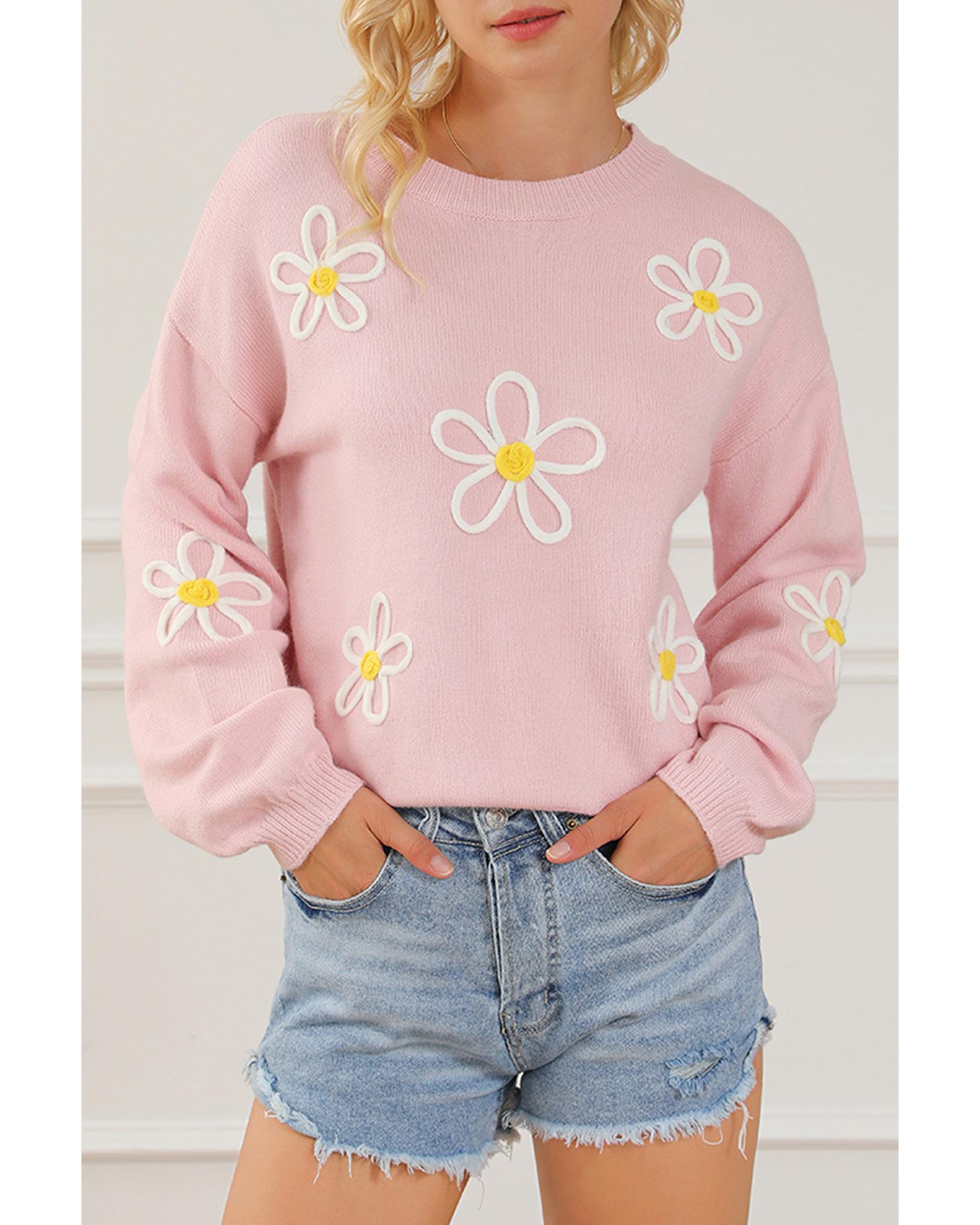 Pink Chenille Daisy Stitching Crew Neck Sweater - L