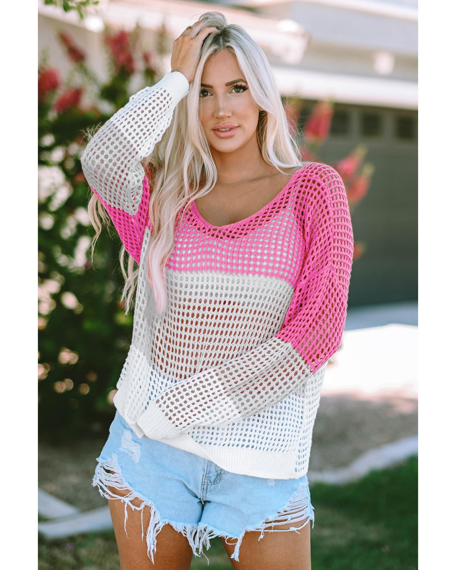 Pink Color Block Eyelet Long Sleeve Twisted Back Knit Top - M