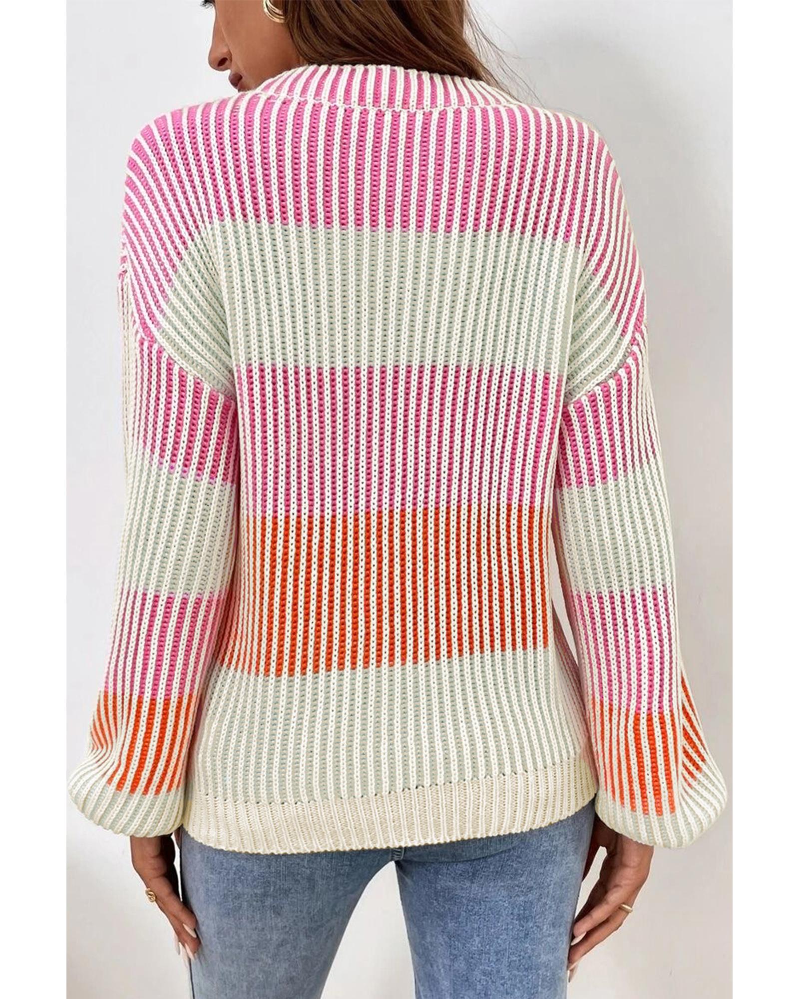 Pink Colorblock Textured Knit Bubble Sleeve Sweater - XL