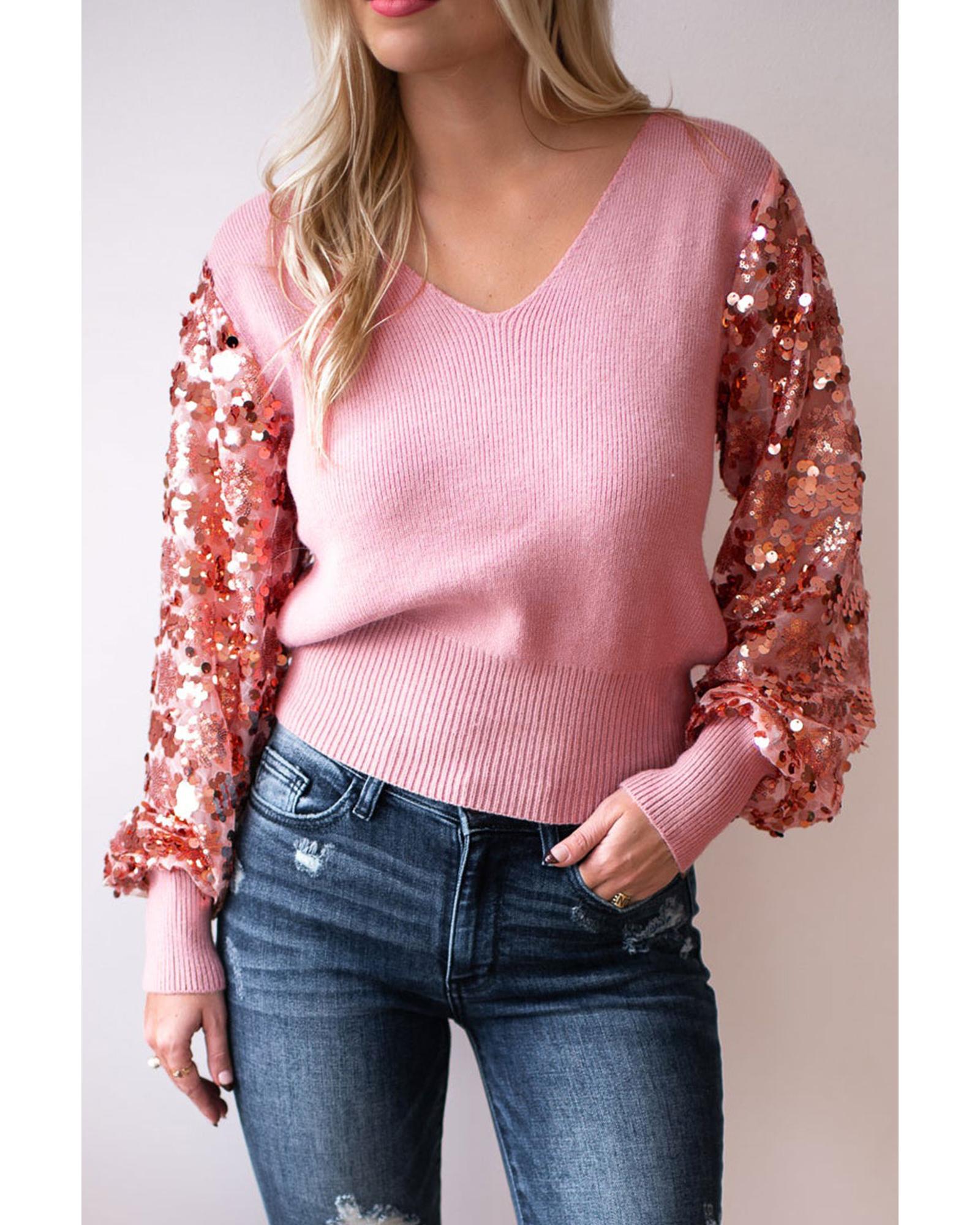 Pink Contrast Sequin Sleeve V Neck Ribbed Knit Sweater - XL