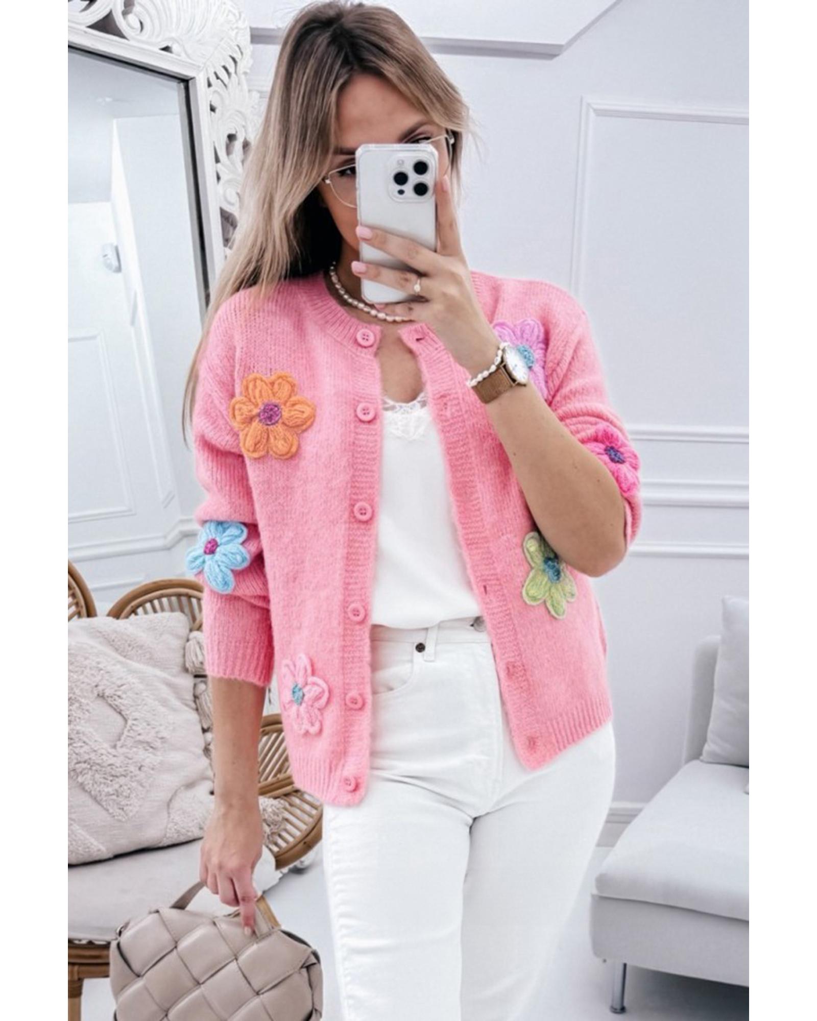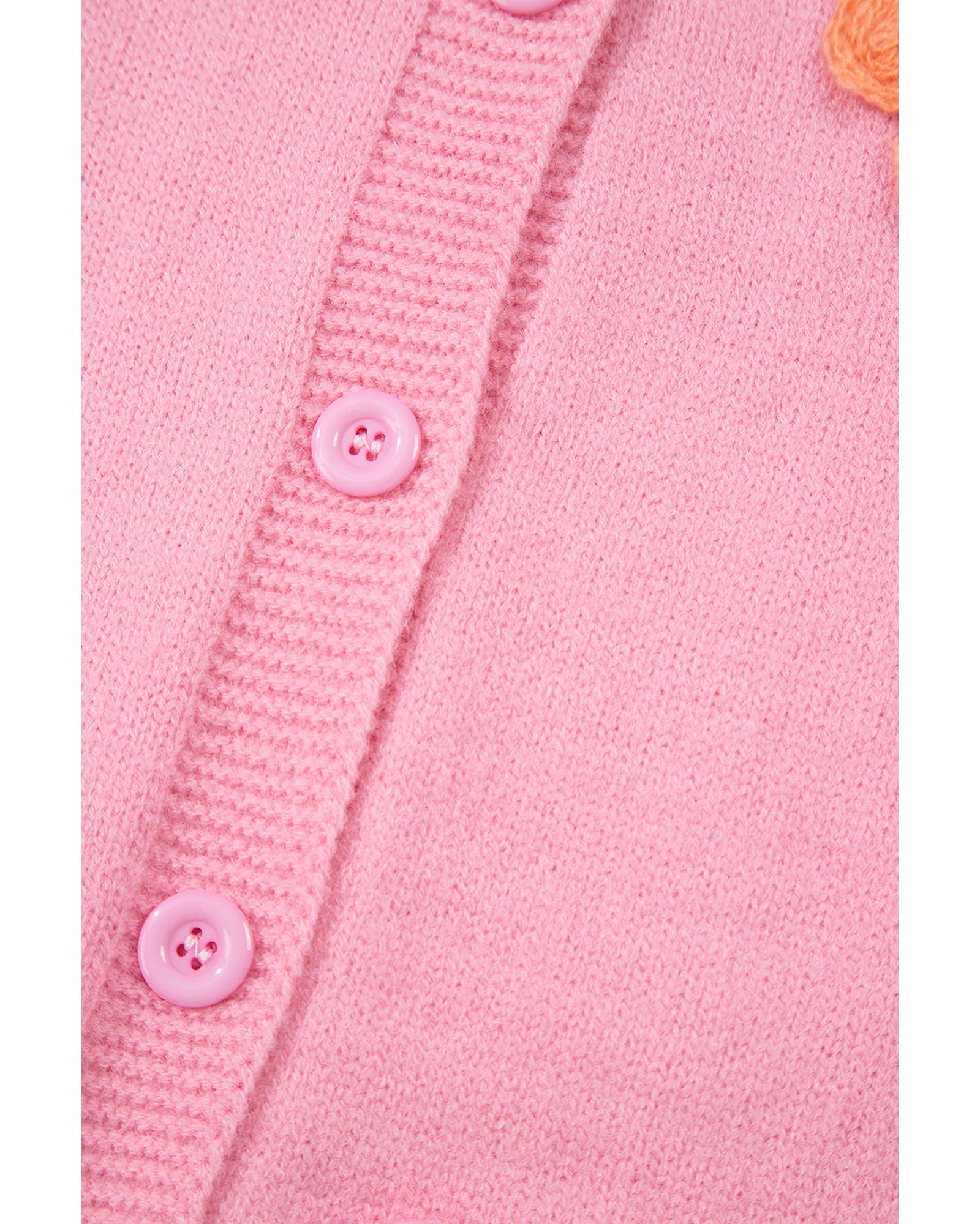 Pink Cute Knitted Floral Pattern Button Up Cardigan - M