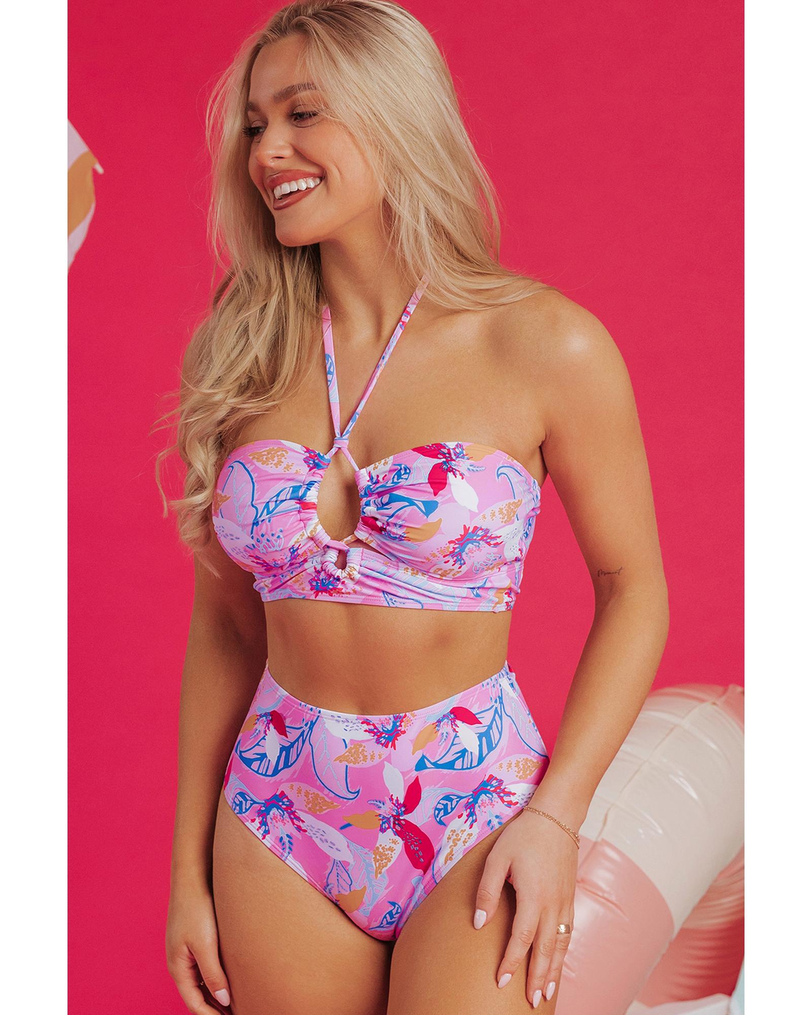 Pink Floral Printed Halter Neck High Waist Bikini - M